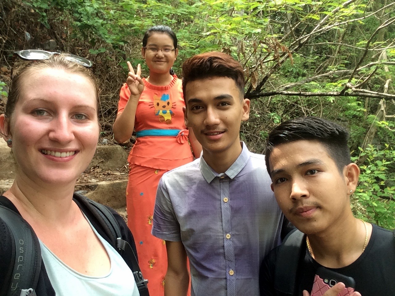 Sur le chemin de la descente, je croise plein de birmans qui disent « mingalaba » avec de grands sourires ! (Ils ont l’air de galérer à monter aussi hein !!) Moi, je suis rouge, en sueur, au bout de ma vie, j’ai pas franchement envie de prendre des selfies… Mais je ne peux rien leur refuser alors vas y qu’on fait des séances photos toutes les 50 marches …