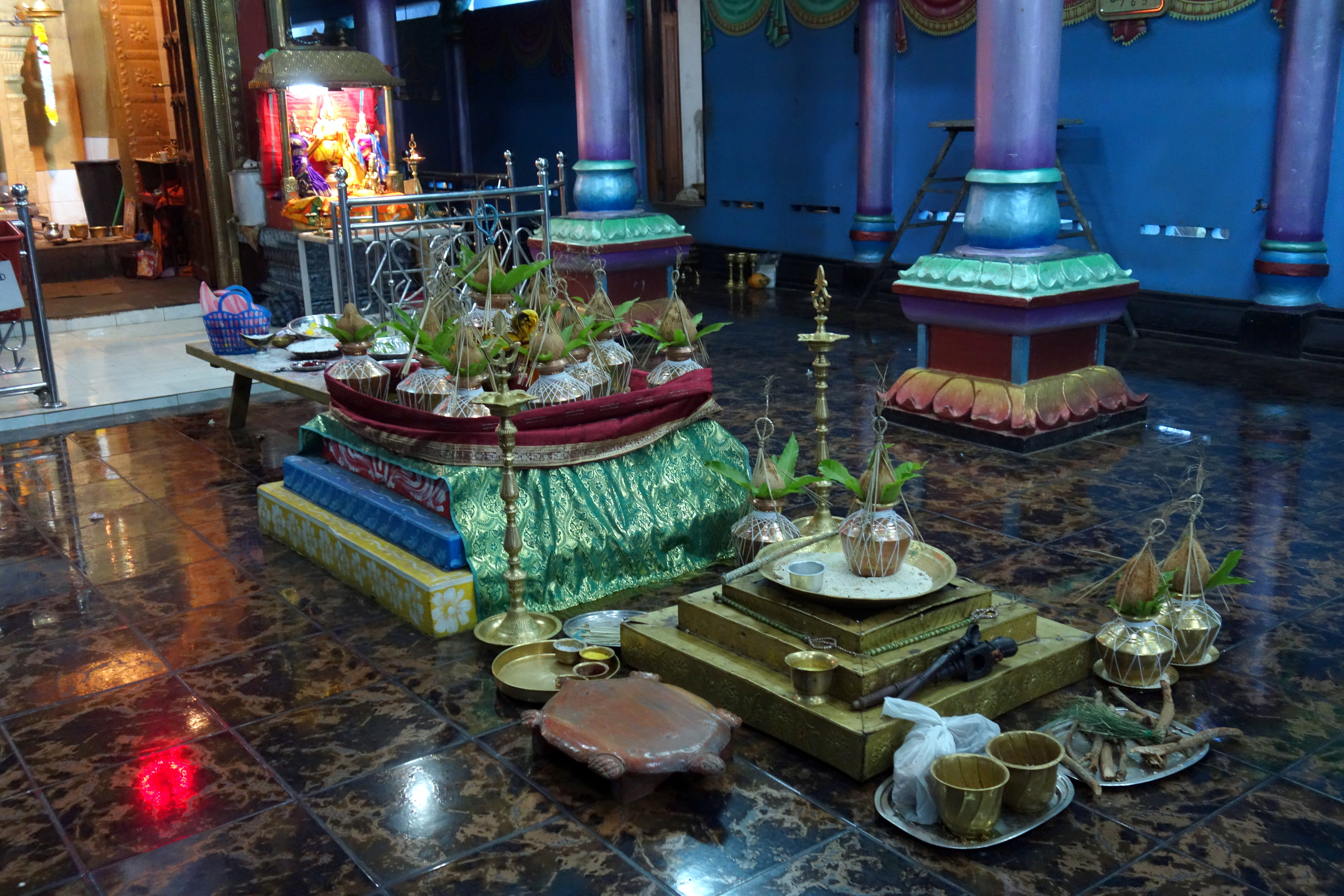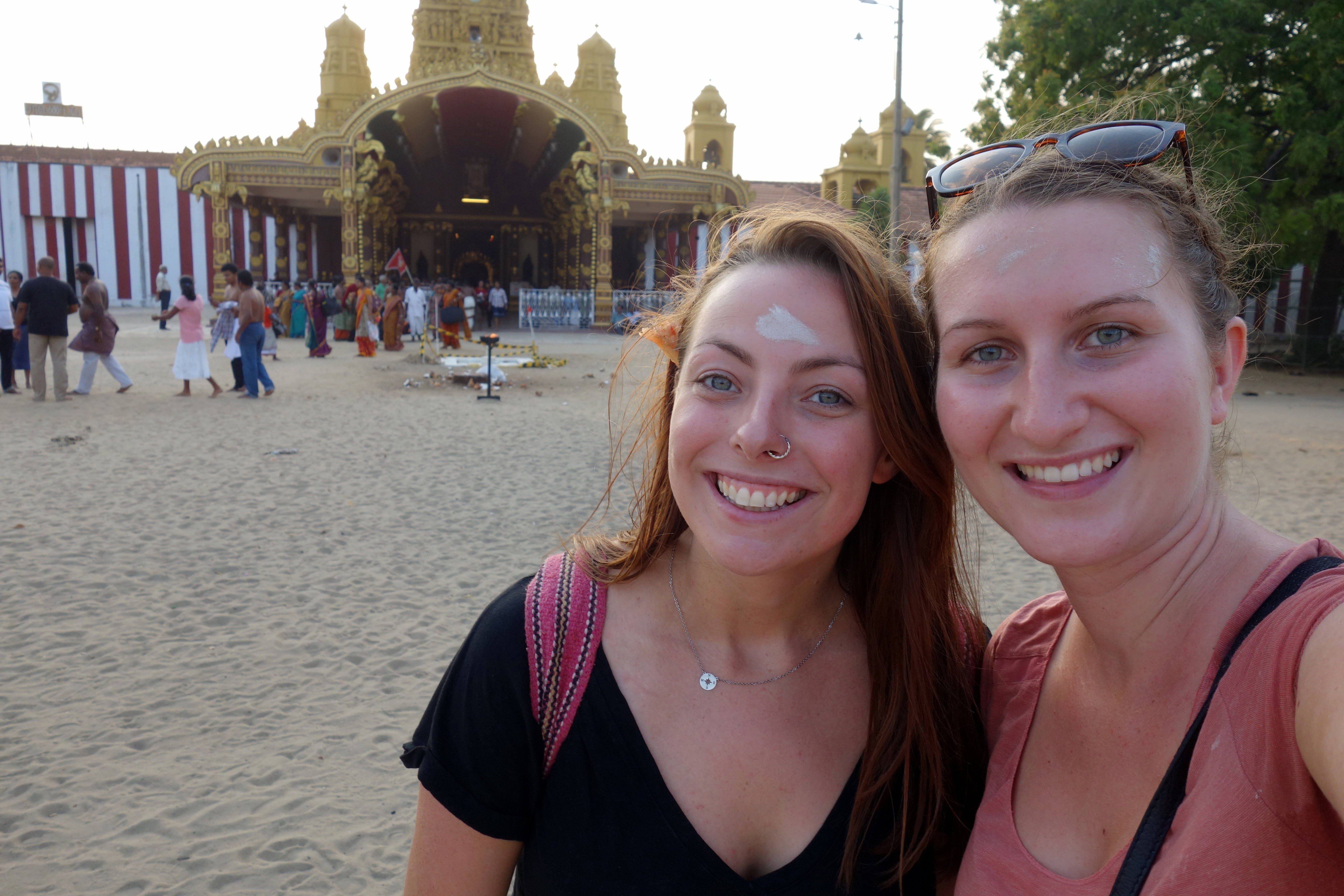 Arrivées devant la porte d’entrée, on constate que tous les hommes sont torse nu et restent à l’entrée. On se met donc derrière, ne voulant pas déranger la célébration, en fait, les femmes sont a l’intérieur et nous sommes invitées à rentrer. La cérémonie est en cours, il y a des chants, des gestes, des paroles, on ne comprend rien mais on écarquille les yeux et s’émerveille de ce que l’on est en train de vivre. En fait, il s’agit d’un pujaLa puja est un rituel censé provoquer la « descente » (archāvatara) d’une divinité à l’intérieur d’une image la représentant, d’une statue ou d’un symbole comme le lingam.” Deux personnes  transportent donc cette statue et tout le monde se range derrière pour suivre le convoi. Bien sûr, on les imite, on suit cette procession tout autour du temple. Il est absolument magnifique ! Énormément de peintures, sculptures, de l’or partout… je ne peux malheureusement pas prendre de photos (il me semble que c’était interdit) mais de toute façon, par respect pour ce que je suis en train de vivre, ça serait totalement inapproprié ! Après avoir fait le tour du temple, on revient au point de départ et les femmes, sans prévenir, se baissent toutes en même temps et lancent des fleurs en l’air. Le temps s’arrête, l’image est incroyable, tellement forte, j’ai les larmes aux yeux ! Puis, tout le monde reçoit des sortes de poudre/pâte à se mette sur le front, puis il faut boire de l’eau sainte et se mettre de la “farine” sur le front. On est complètement perdues, on regarde tout autour de nous ce qu’on est censées faire avec tout ça, on a la poudre/pâte sur le bout du doigt pour faire le point, l’eau qui nous dégouline entre les mains qu’il faut en fait boire puis s’étaler dans les cheveux et ensuite la “farine” que je me suis mise partout car j’étais débordée haha! La cérémonie s’achève, tout le monde s’assoit à l’extérieur, les hommes jouent de la musique et chantent pendant que les femmes tapent dans leurs mains. C’est extraordinaire ! Le Sri Lanka ne cesse de me surprendre. Je ne connais rien aux traditions hindouistes mais à ce moment là, j’ai extrêmement envie de me rendre en Inde ! Toutes ces couleurs de saris, toute cette culture que je ne connais pas et ces traditions que je trouve vraiment belles à observer…
