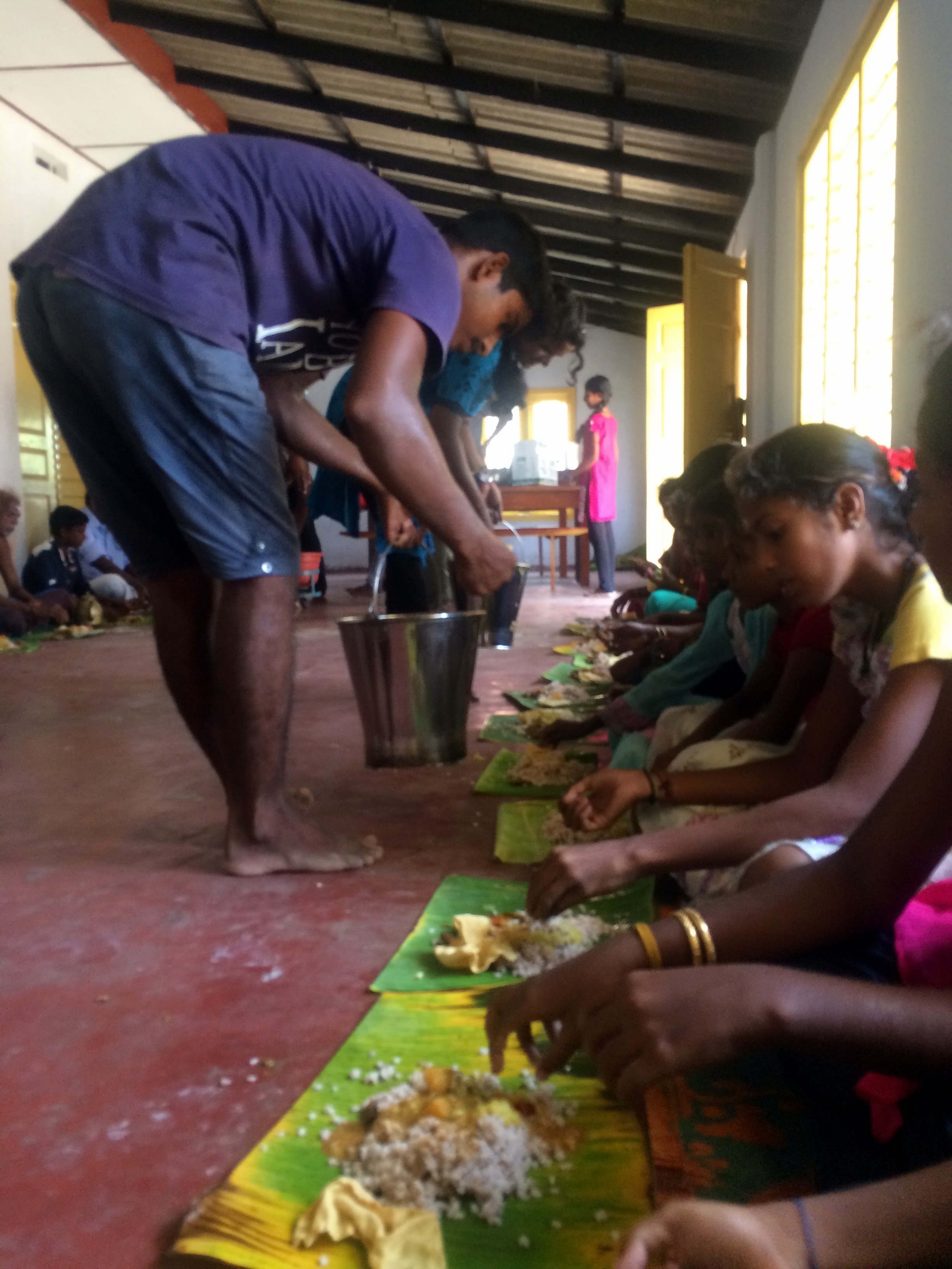Alors que je suis au Sri Lanka depuis plus de 5 semaines, cela ne fait que 2 ou 3 jours que j’ai commencé à manger avec les mains, ça me dégoûtait un peu jusqu’à présent. Mais pour le coup, HEUREUSEMENT que je m’étais entraînée ! Car là, on n’a pas le choix. On a des portions énormes dans nos assiettes et ils font un deuxième tour, on n’a pas l’audace de refuser leurs attentions et on se force à finir, c’est excellent mais les quantités sont disproportionnées ! Quand on a terminé, un monsieur qui parle anglais nous raccompagne. Il nous explique que chaque vendredi, tout le village peut venir manger ici gratuitement. C’est offert par le temple grâce aux donations. On le remercie grandement de nous avoir invitées et on demande où faire une donation pour le temple, il ne veut pas que l’on donne de l’argent !!!!