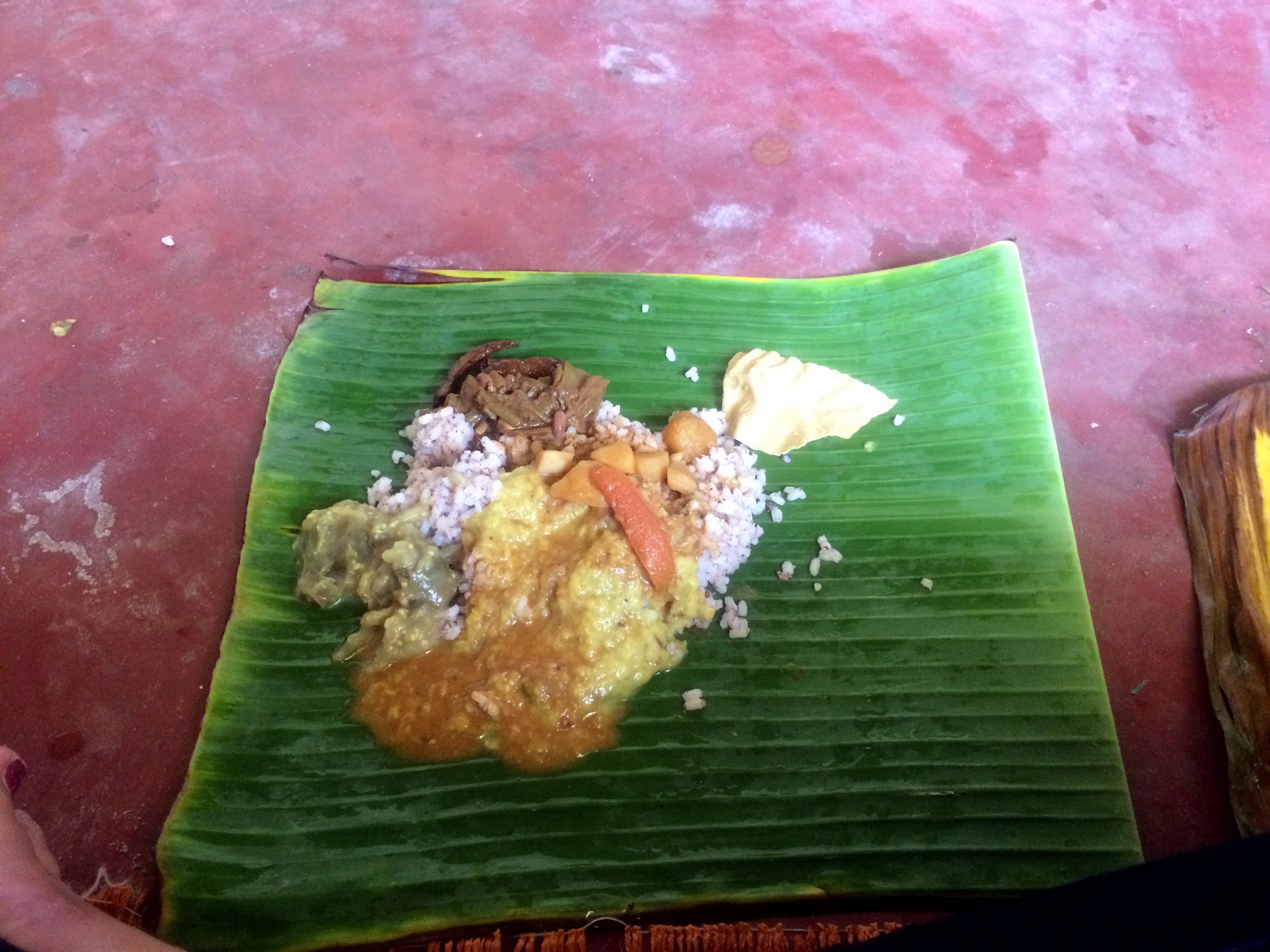 À peine a-t-on remis nos chaussures que l’on est rattrapées par une jeune fille. Elle nous dit que l’on doit rester, on est invitées à manger. On accepte bien volontiers ! On se retrouve dans une grande salle toute en longueur. Une cinquantaine de personnes sont adossées contre les murs sur des tapis en paille tressée. Devant chaque personne est disposée une feuille de bananier : l’assiette !