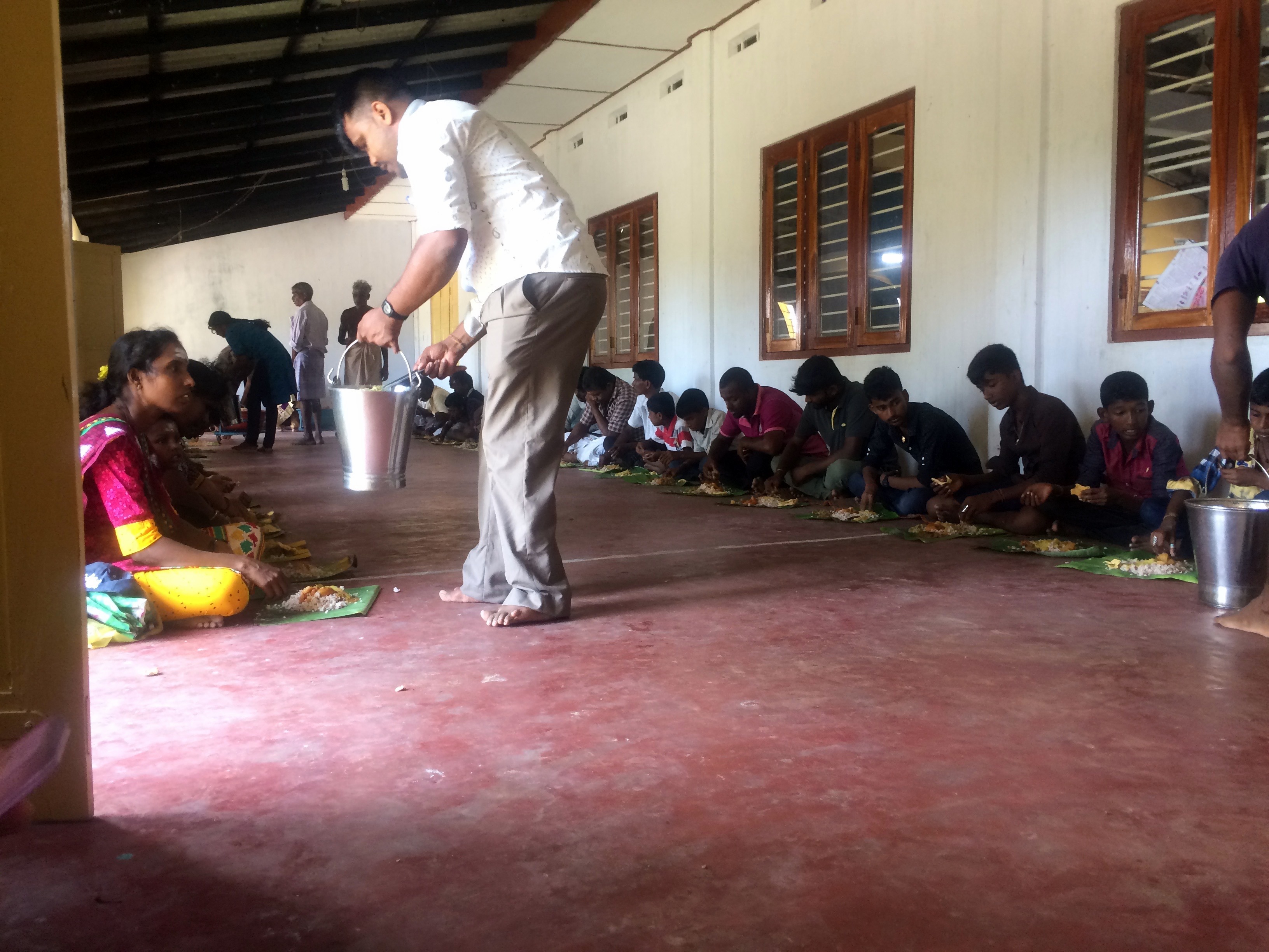 Ensuite, une première personne passe et dépose une grosse cuillère de riz, puis une dizaine de personnes se succèdent déposant à tour de rôle divers currys, légumes, beignets, salade de fruits, tasse de thé, verre d’eau, … on ne manque de rien !! J’ai réussi à voler quelques photos, je n’aime pas faire ça, mais je voulais absolument avoir un souvenir… alors les voilà !
