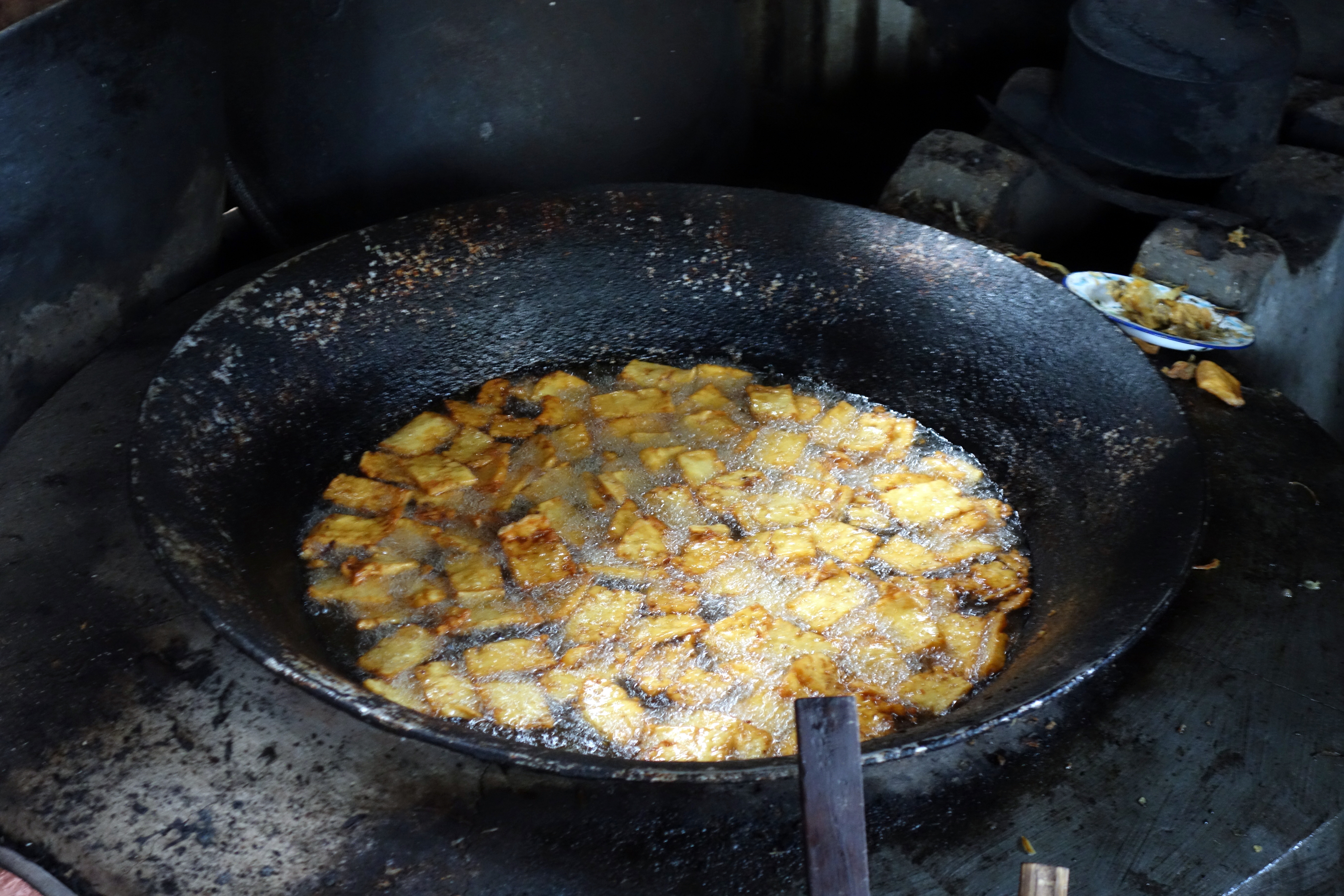 Je m’arrête et me joins à un groupe de 5 hispanophones : un colombien, trois équatoriennes et une espagnole ! Je comprends à peu près ce qu’ils racontent mais suis obligée de répondre en Anglais, aucun mot ne me vient en espagnol ! Ils font aussi l’effort de parler anglais, c’est top ! Ils sont très sympas et on commence la dégustation ensemble avec du tofu frits à tremper dans une sauce, c’est délicieux ! Je ne saurai pas franchement à quoi le comparer… de l’omelette peut être ? En différent haha ! C’est vraiment très bon. On a aussi du tofu séché frit qui ressemble vraiment à des gâteaux apéros croquants ! Puis, on part pour la visite. On traverse différentes petites maisons, à l’intérieur de chacune une famille travaille à la fabrication manuelle du tofu. Vous saviez comment c’est fait vous ? Moi pas du tout !