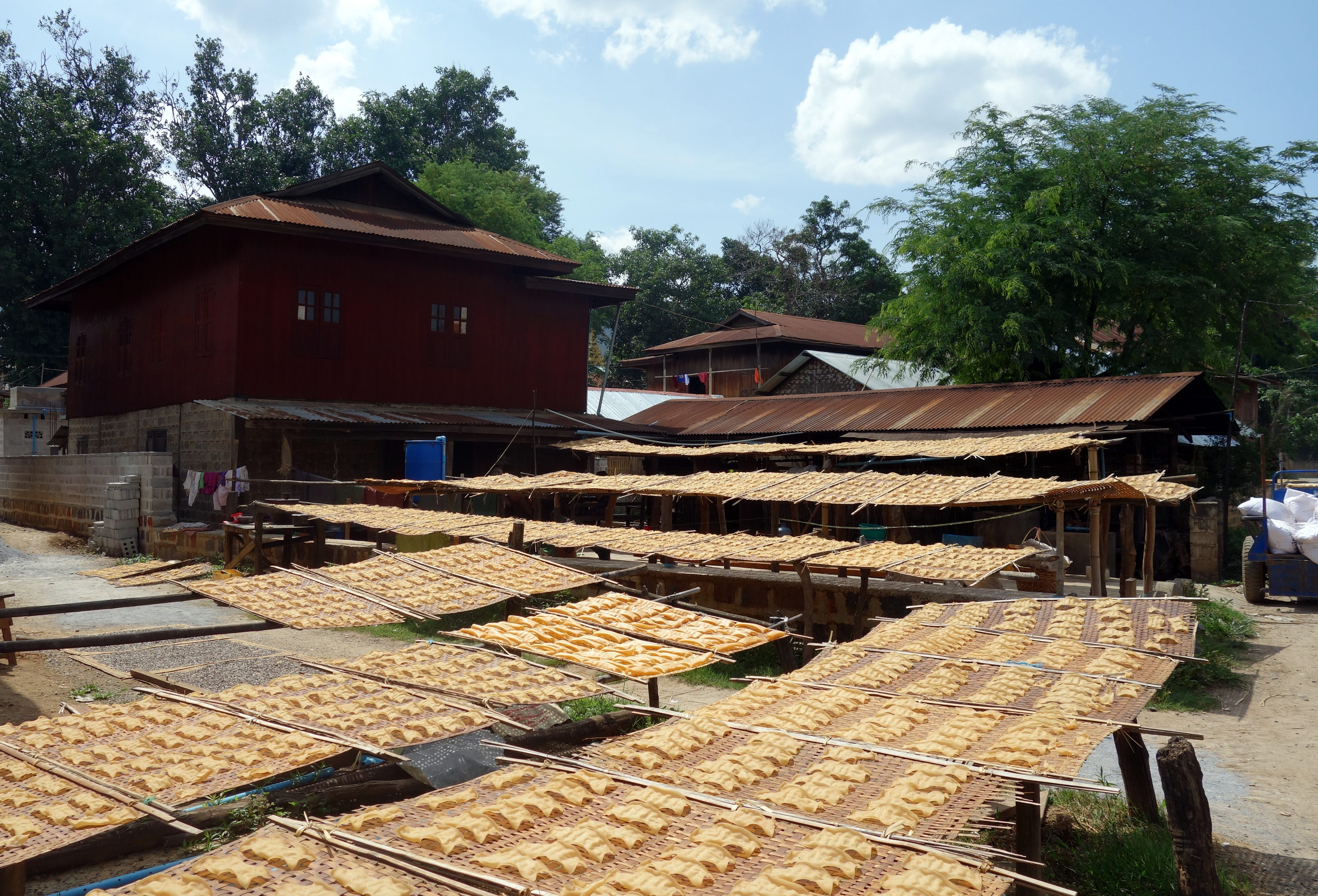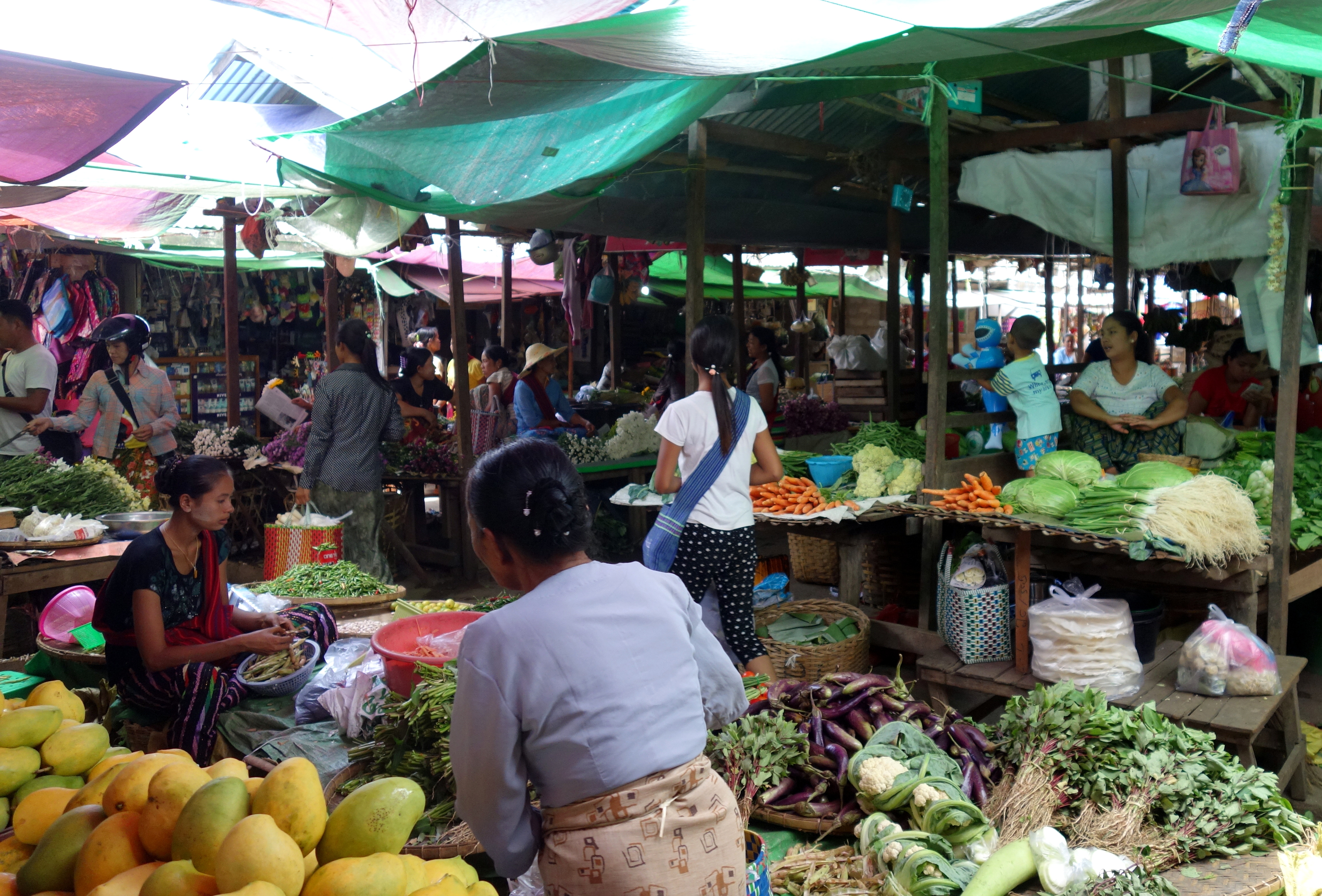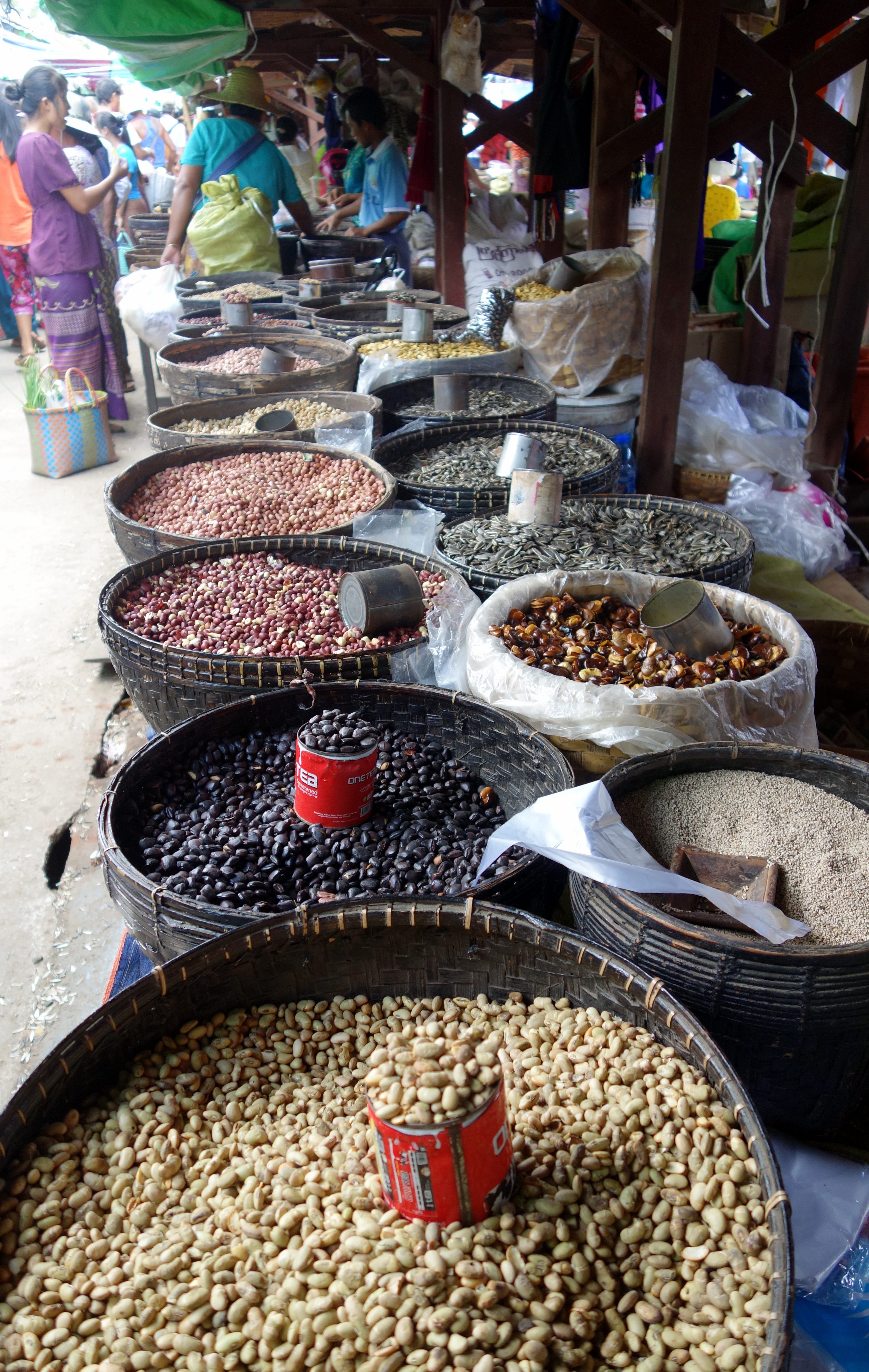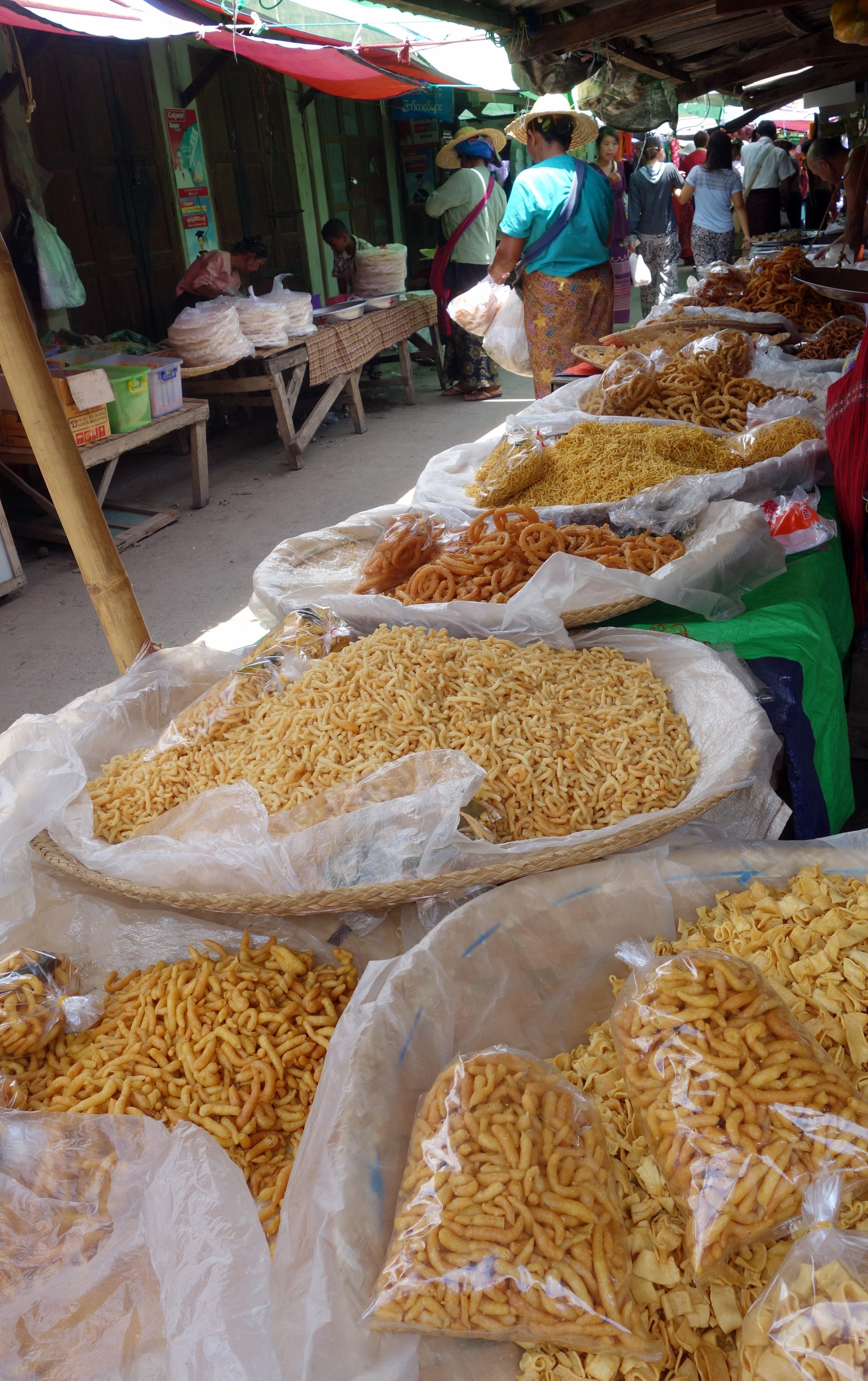 Tous les jours et sur une base de roulement de 5 jours, un immense marché (originellement ethnique) a lieu dans les villages autour du lac. Les marchands arrivent en barque et installent tous leurs stands pour la journée. On trouve de tout ! Nourriture, vêtements, quincaillerie … mais ça n’a plus grand chose d’ethnique à Nyaung Shwe. Je n’ai pas vu les autres, je ne peux pas me prononcer …