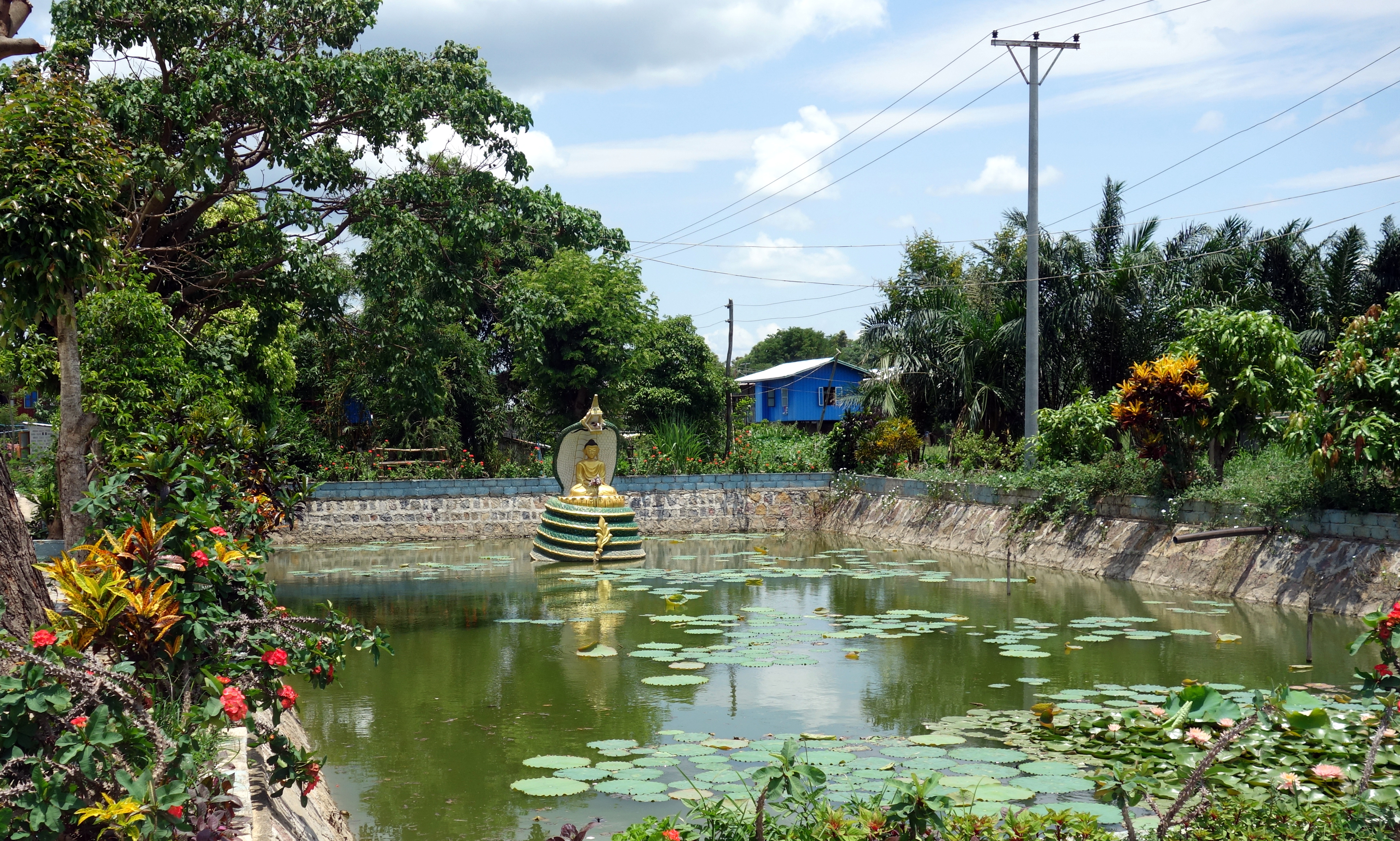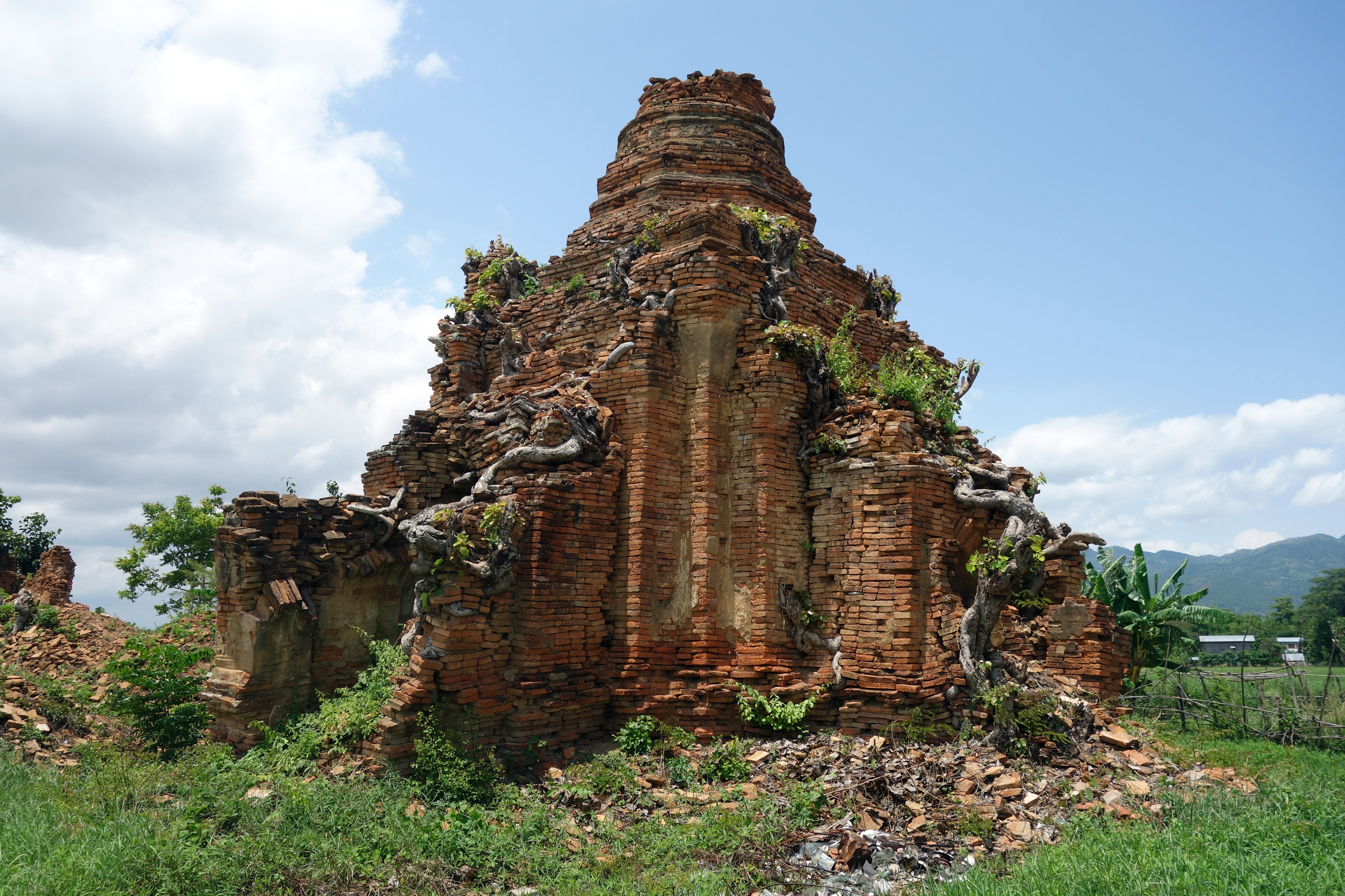 Ensuite, le chemin grimpe un peu, rien de méchant mais avec la chaleur ambiante, je prends un bon coup de chaud ! Je m’arrête dans le temple INNOO Ancient pagodas au bord de la route. Je suis toute seule et passe au moins une heure, assise par terre à écrire. Plusieurs jeunes hommes viennent me voir, tentant de me vendre un tour en bateau, c’est beaucoup trop cher pour moi, surtout que je suis toute seule et de toute façon je suis en vélo.