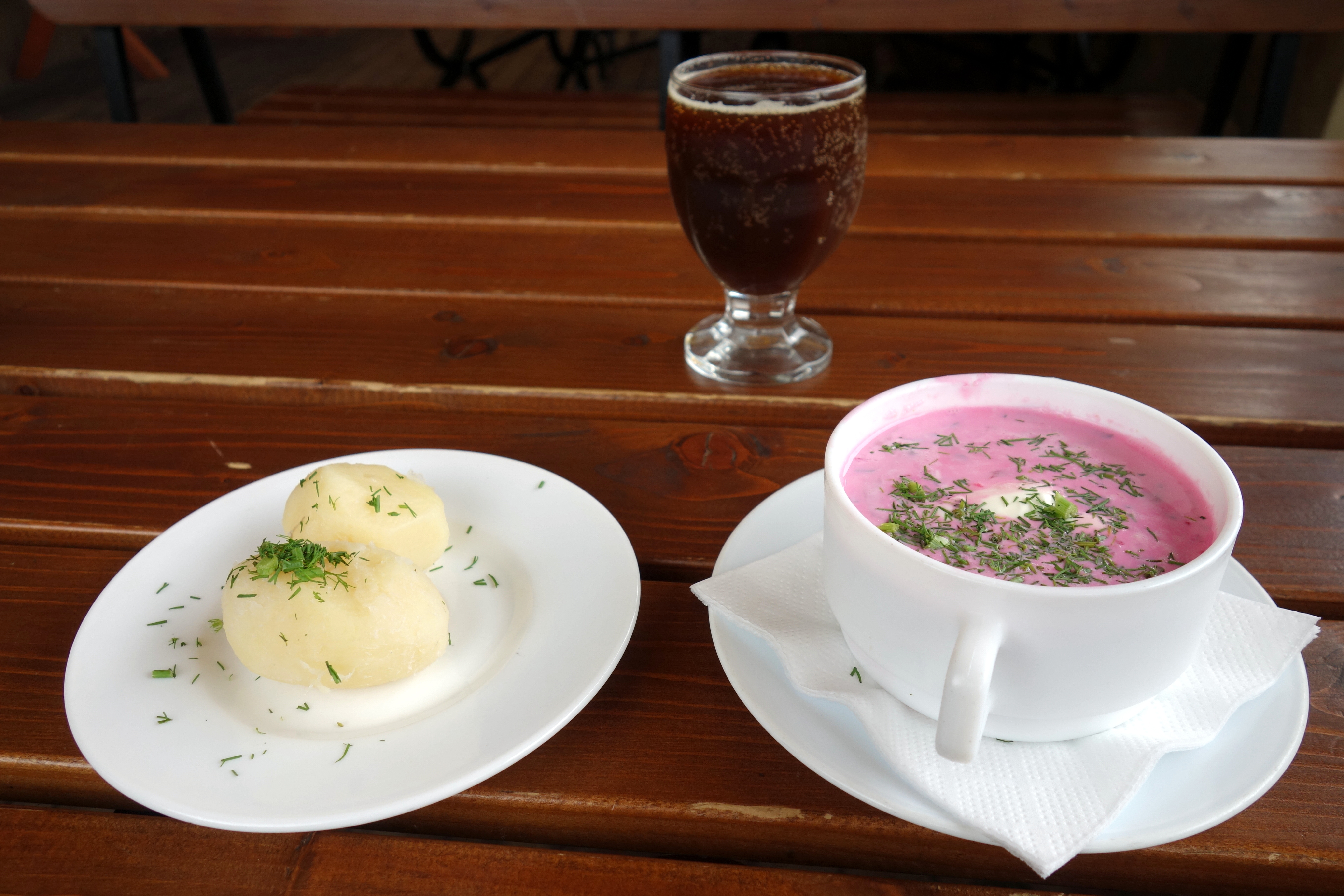 Je me laisse finalement tenter par un restaurant à touristes traditionnel et commande la boisson locale, une soupe froide de betterave rouge et un beignet aux épinards. La nourriture est délicieuse, la boisson, c’est une horreur ! Il s’agit de la « bière » de pain que j’avais déjà eu l’occasion de goûter en Russie avec Alexander. Beuuurk..