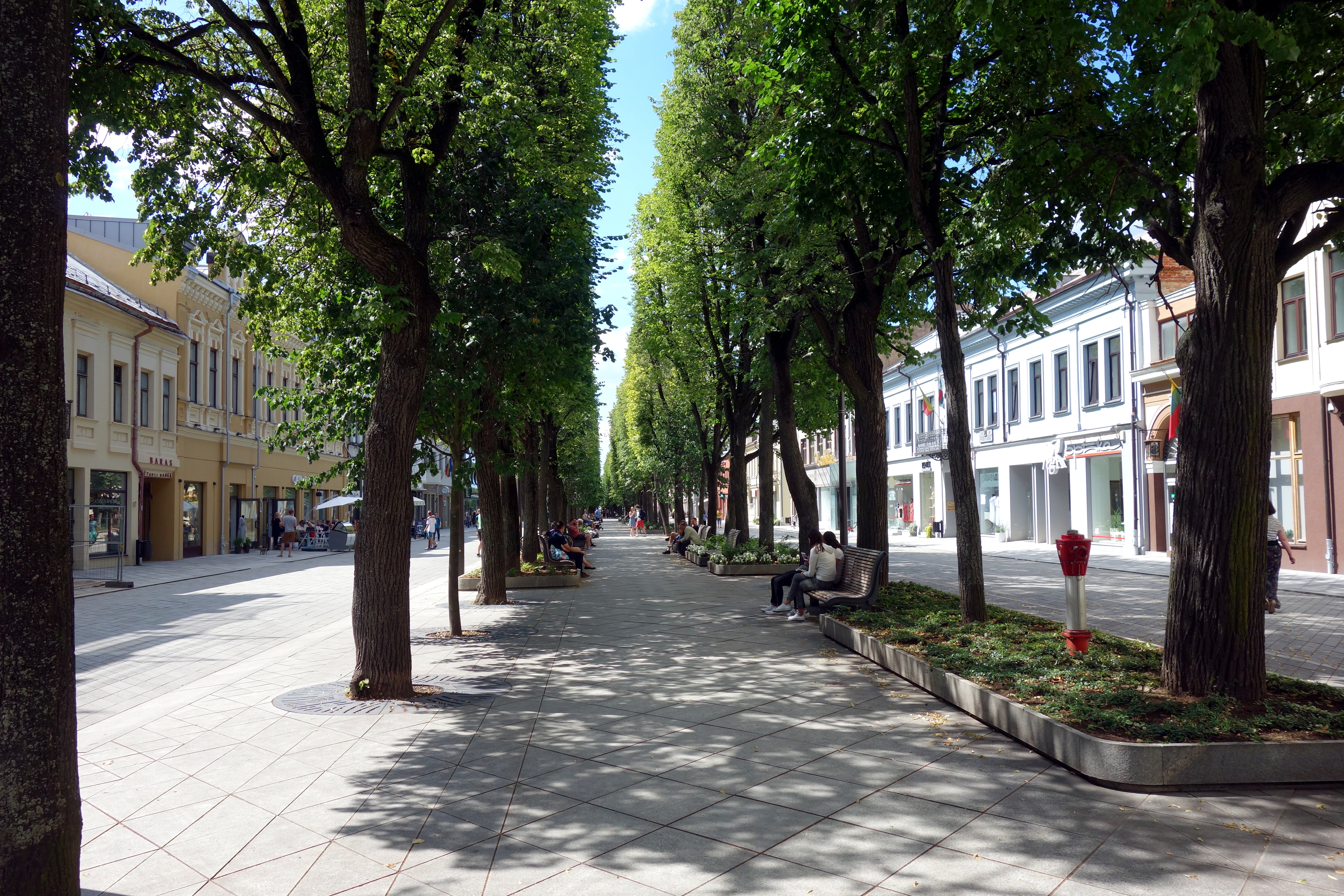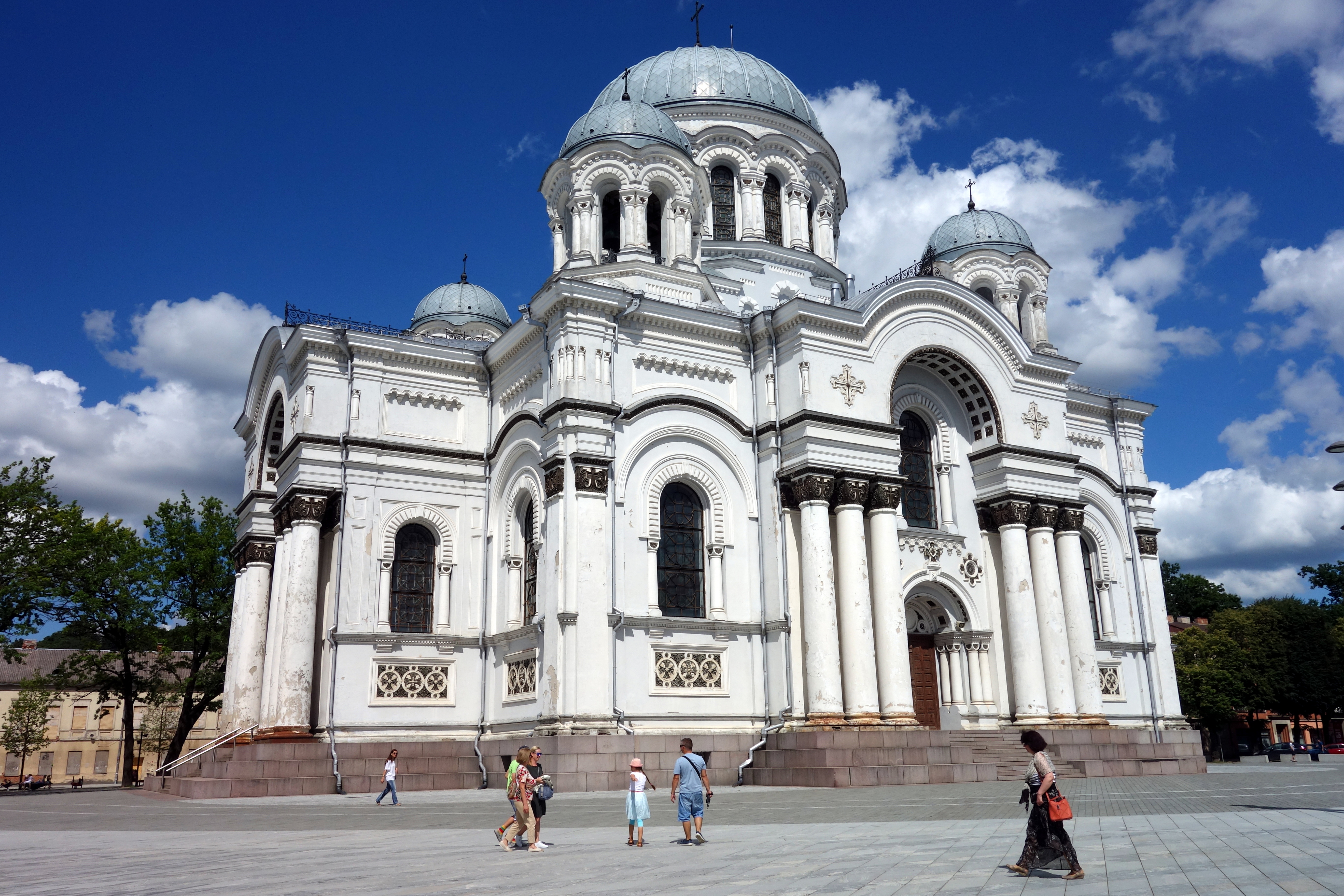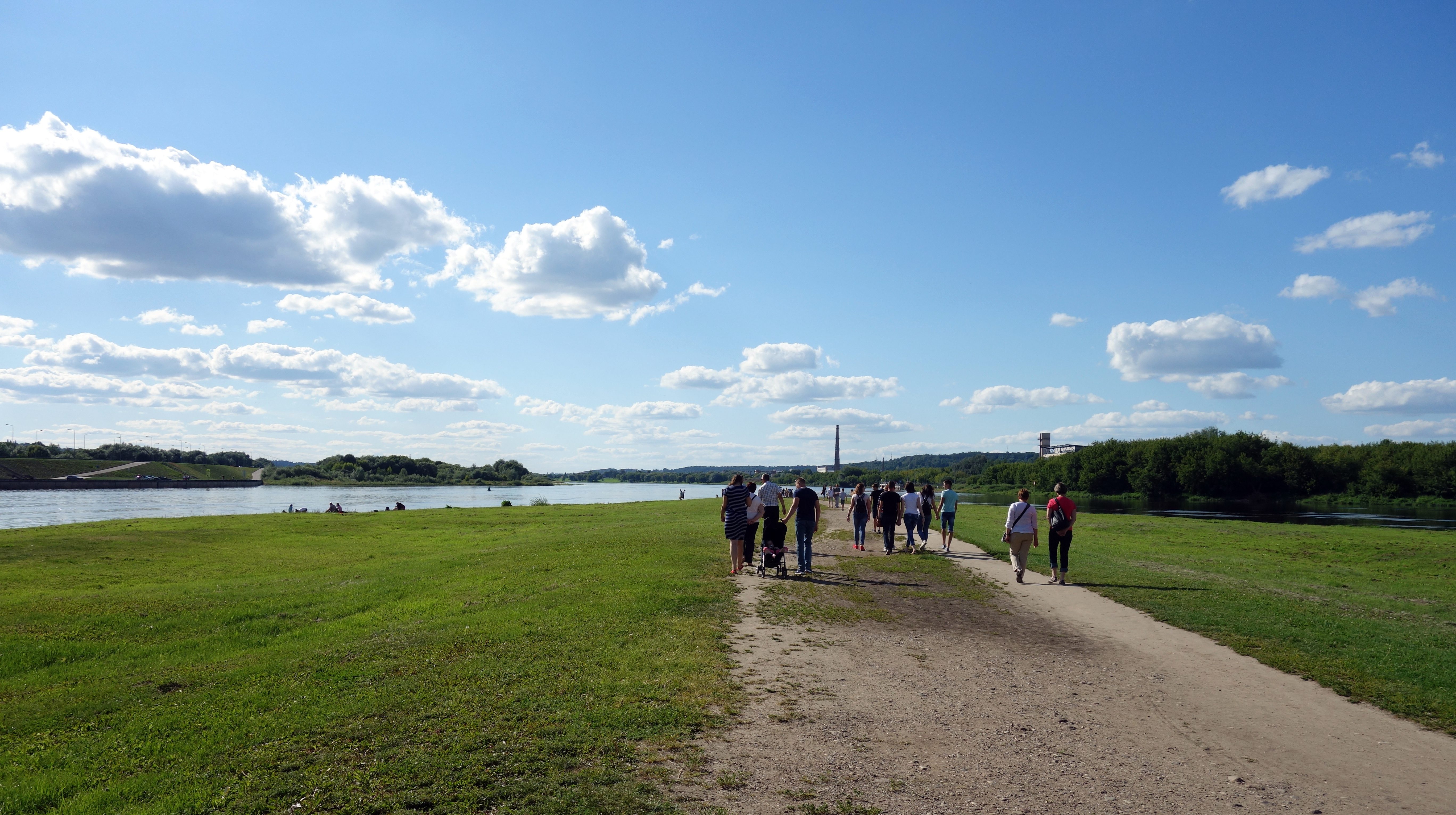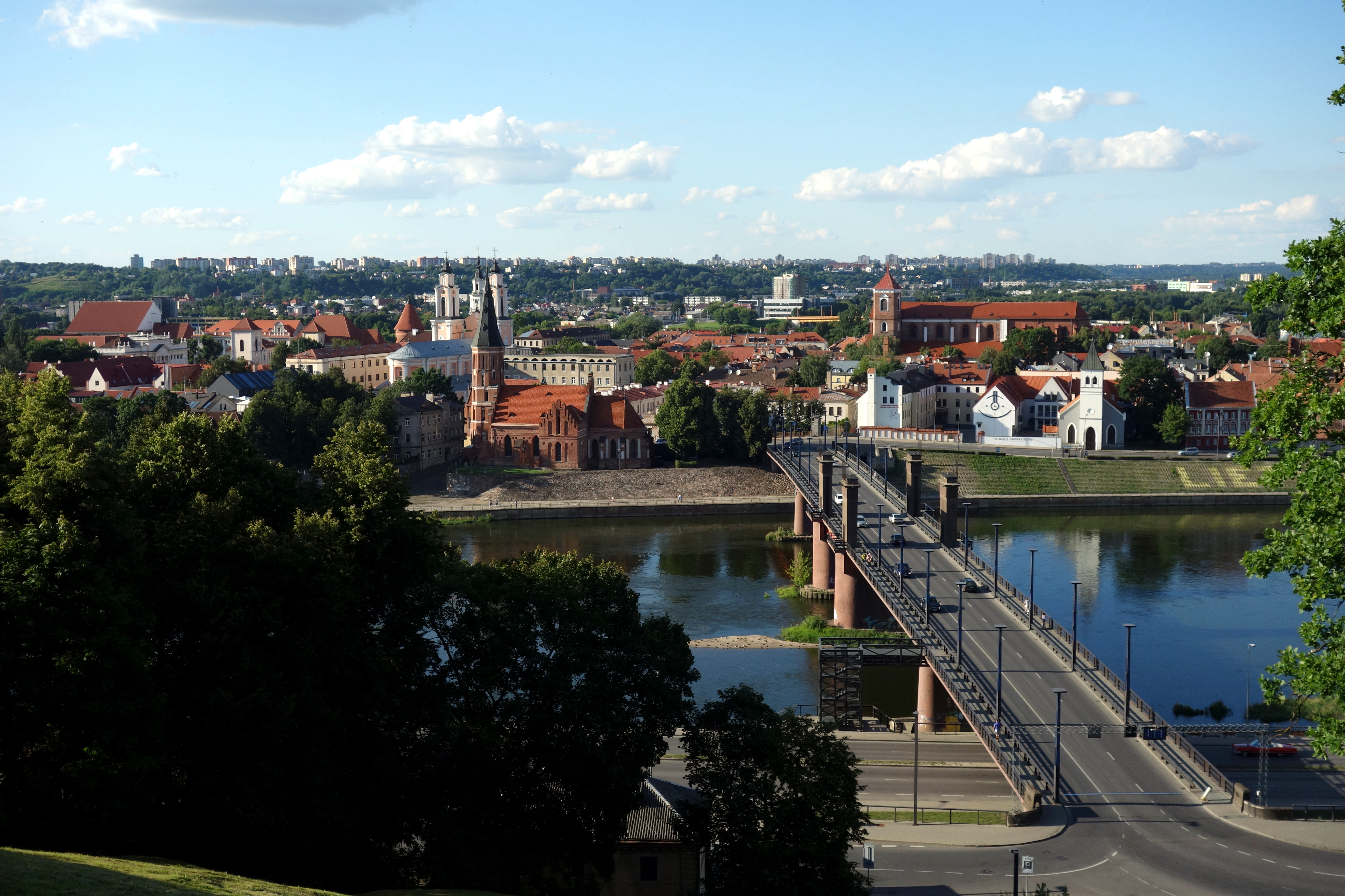 J’arrive ensuite à la grosse église Saint-Michel Archange de Kaunas qui marque le début des allées Laisvès (de la liberté). C’est un grand boulevard piéton avec des arbres, des fleurs, des boutiques de chaque côté. C’est hyper familial, très sympa. Je prends un jus de fruits/légumes à base de betterave, carotte et pomme. C’est bon, c’est frais ! Puis l’allée se rétrécit et me voilà dans le vieux quartier avec des pavés au sol, des petits restaurants, des bars, des artistes de rue, de jolis monuments. Et enfin, la place principale avec la cathédrale, la mairie, le musée et la rue qui mène au château. Surprise ! Le château, en plein coeur de la ville est en fait au milieu d’un parc tout vert. Avec ce beau soleil, je ne peux résister et comme la veille à Trakai, je m’allonge au soleil pour profiter du beau temps.