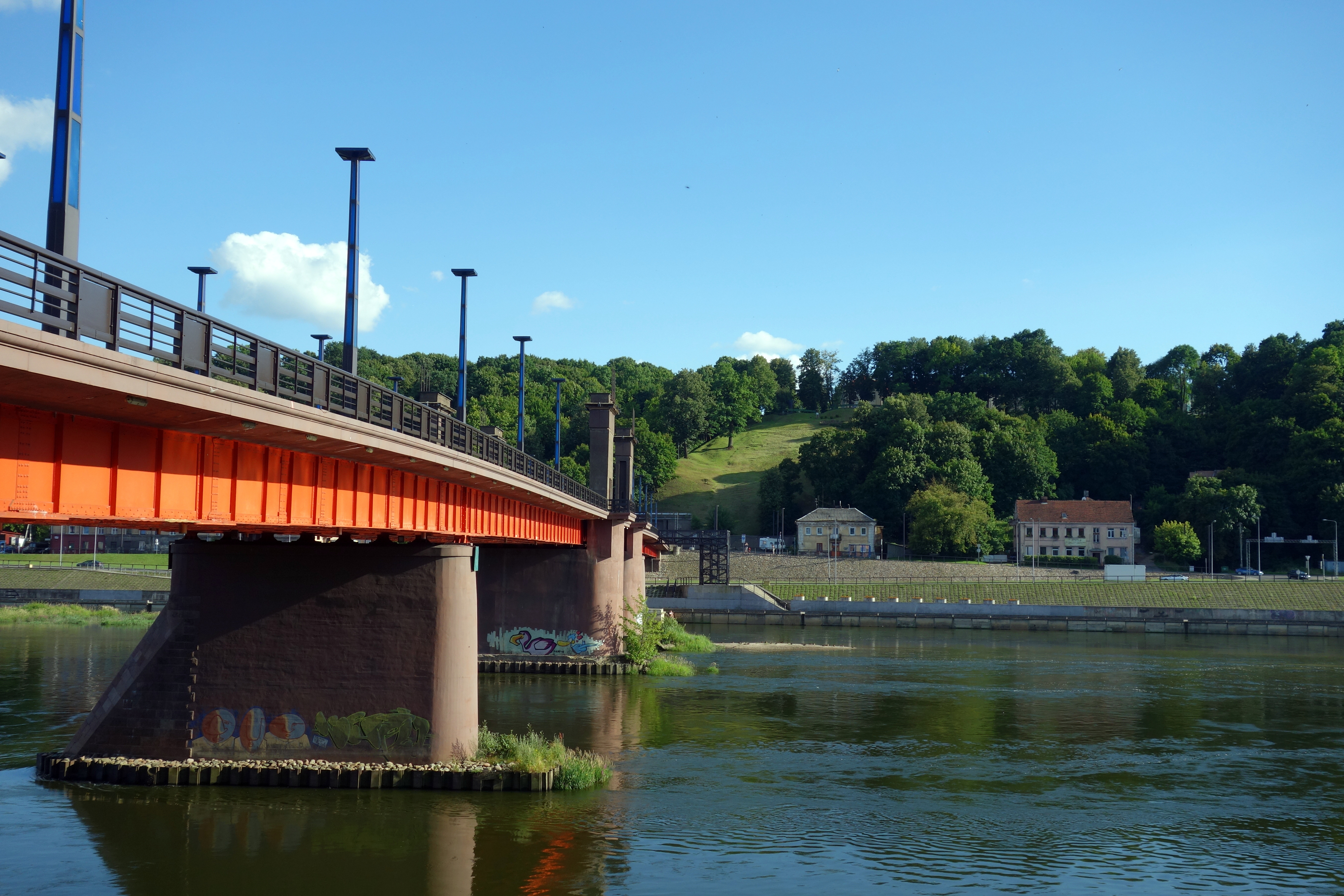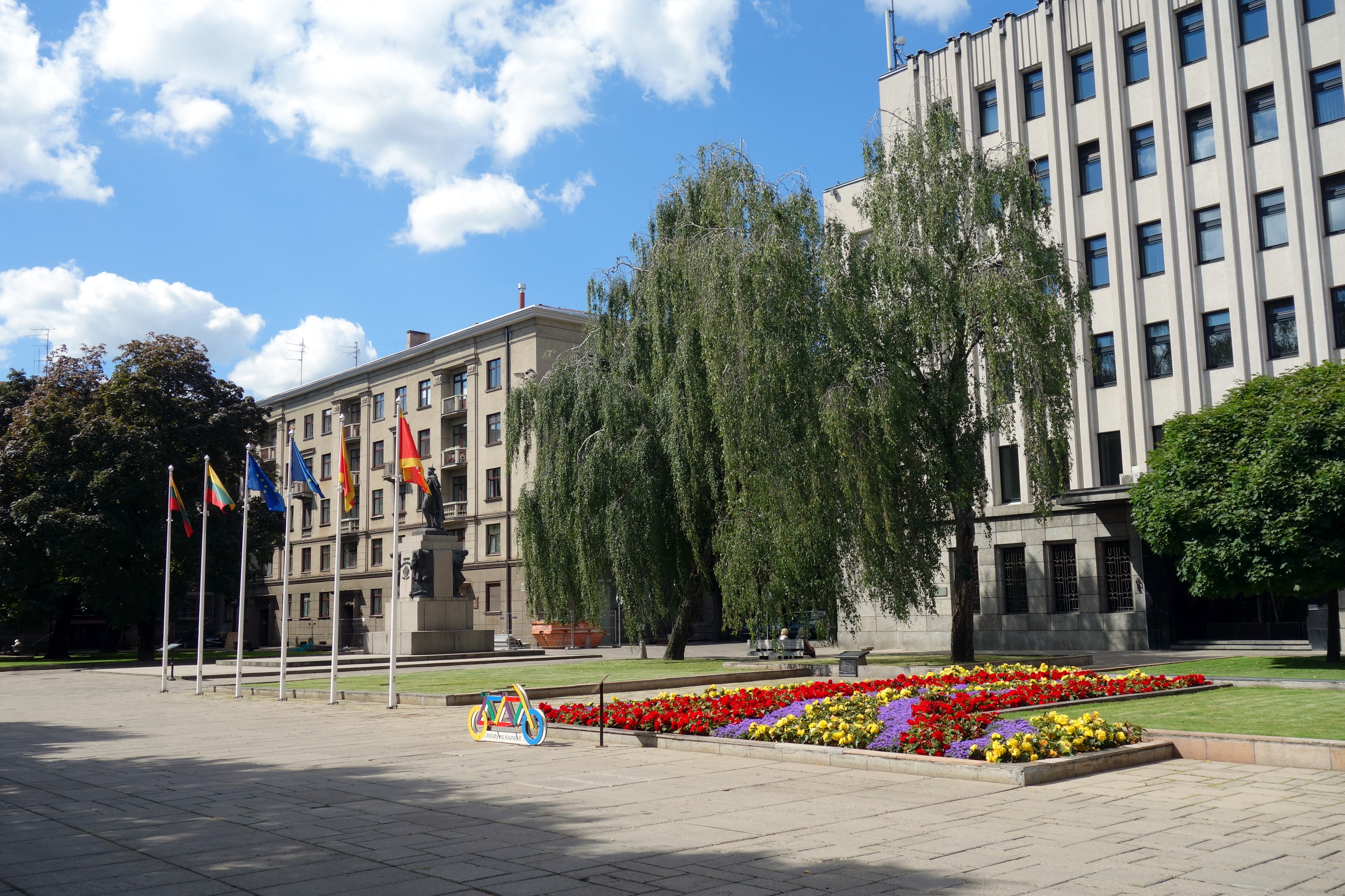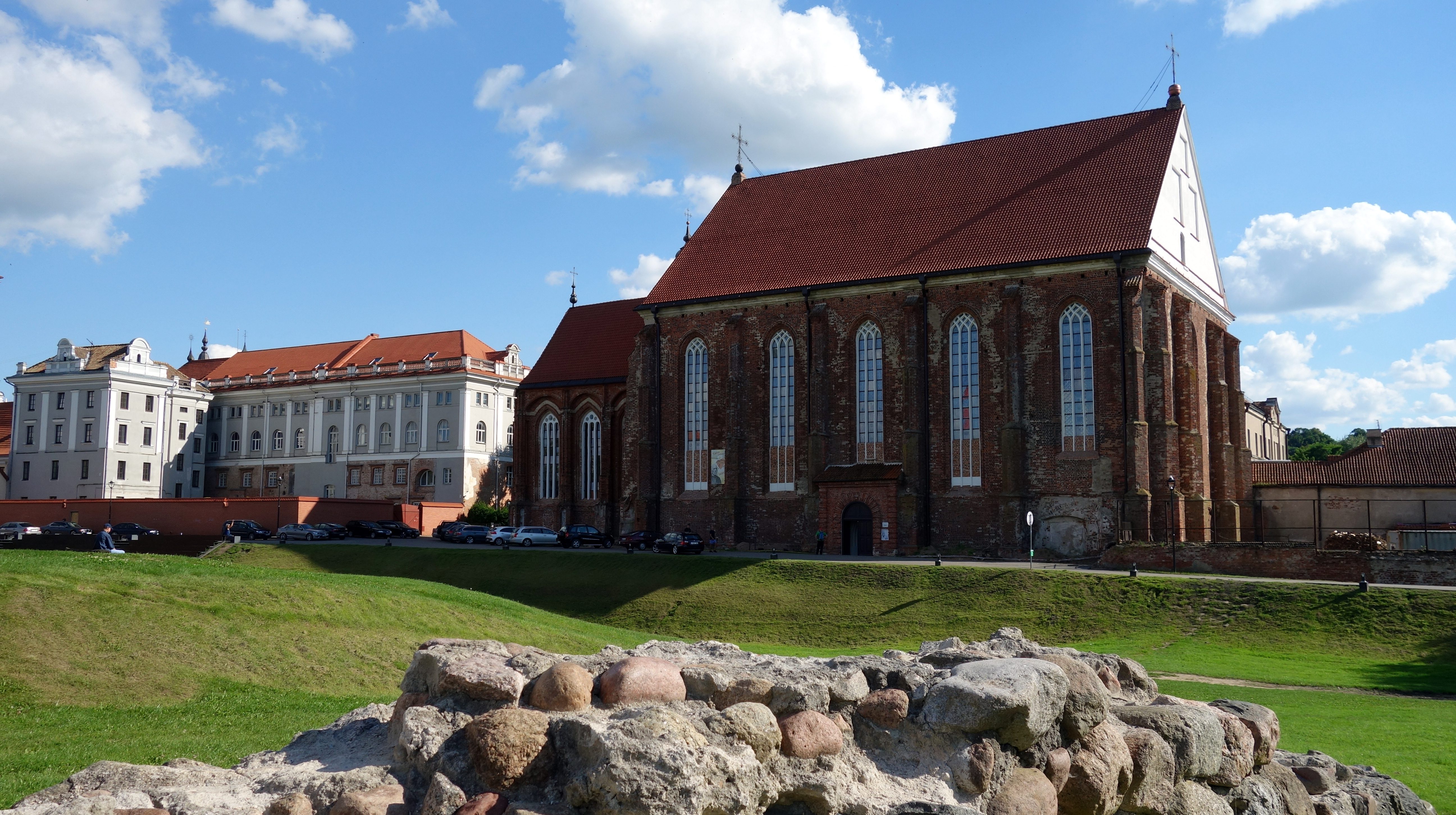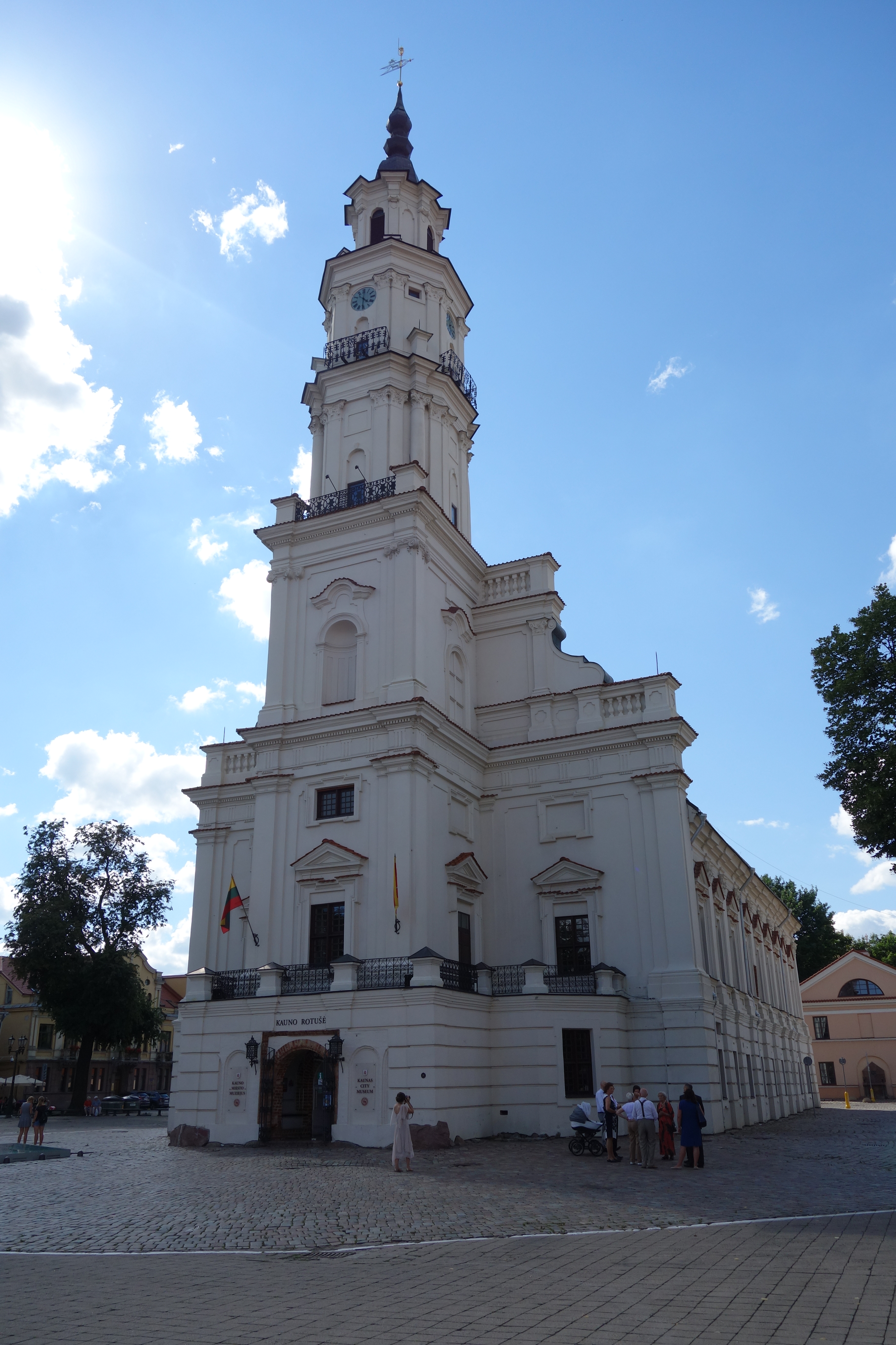 J’arrive ensuite à la grosse église Saint-Michel Archange de Kaunas qui marque le début des allées Laisvès (de la liberté). C’est un grand boulevard piéton avec des arbres, des fleurs, des boutiques de chaque côté. C’est hyper familial, très sympa. Je prends un jus de fruits/légumes à base de betterave, carotte et pomme. C’est bon, c’est frais ! Puis l’allée se rétrécit et me voilà dans le vieux quartier avec des pavés au sol, des petits restaurants, des bars, des artistes de rue, de jolis monuments. Et enfin, la place principale avec la cathédrale, la mairie, le musée et la rue qui mène au château. Surprise ! Le château, en plein coeur de la ville est en fait au milieu d’un parc tout vert. Avec ce beau soleil, je ne peux résister et comme la veille à Trakai, je m’allonge au soleil pour profiter du beau temps.