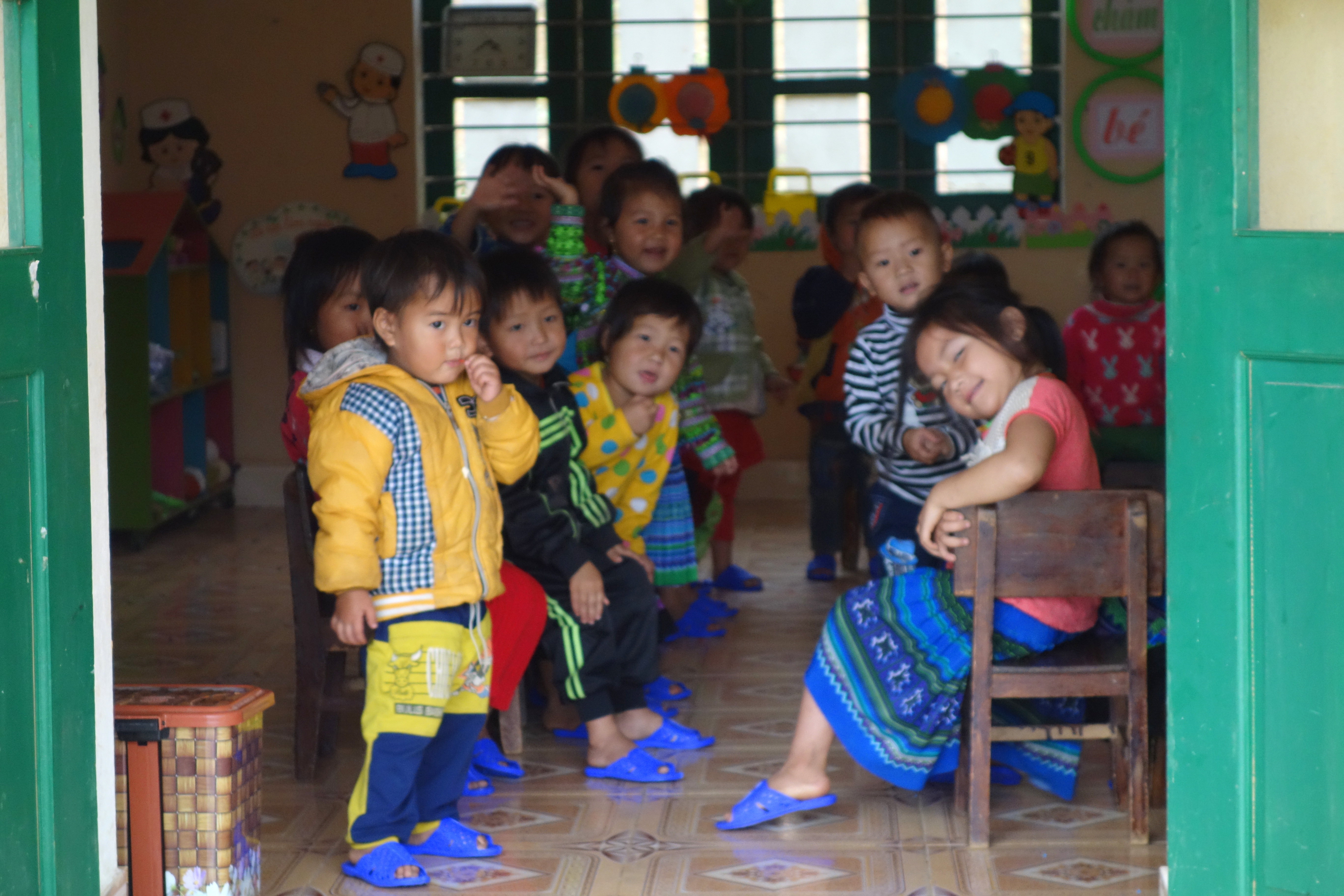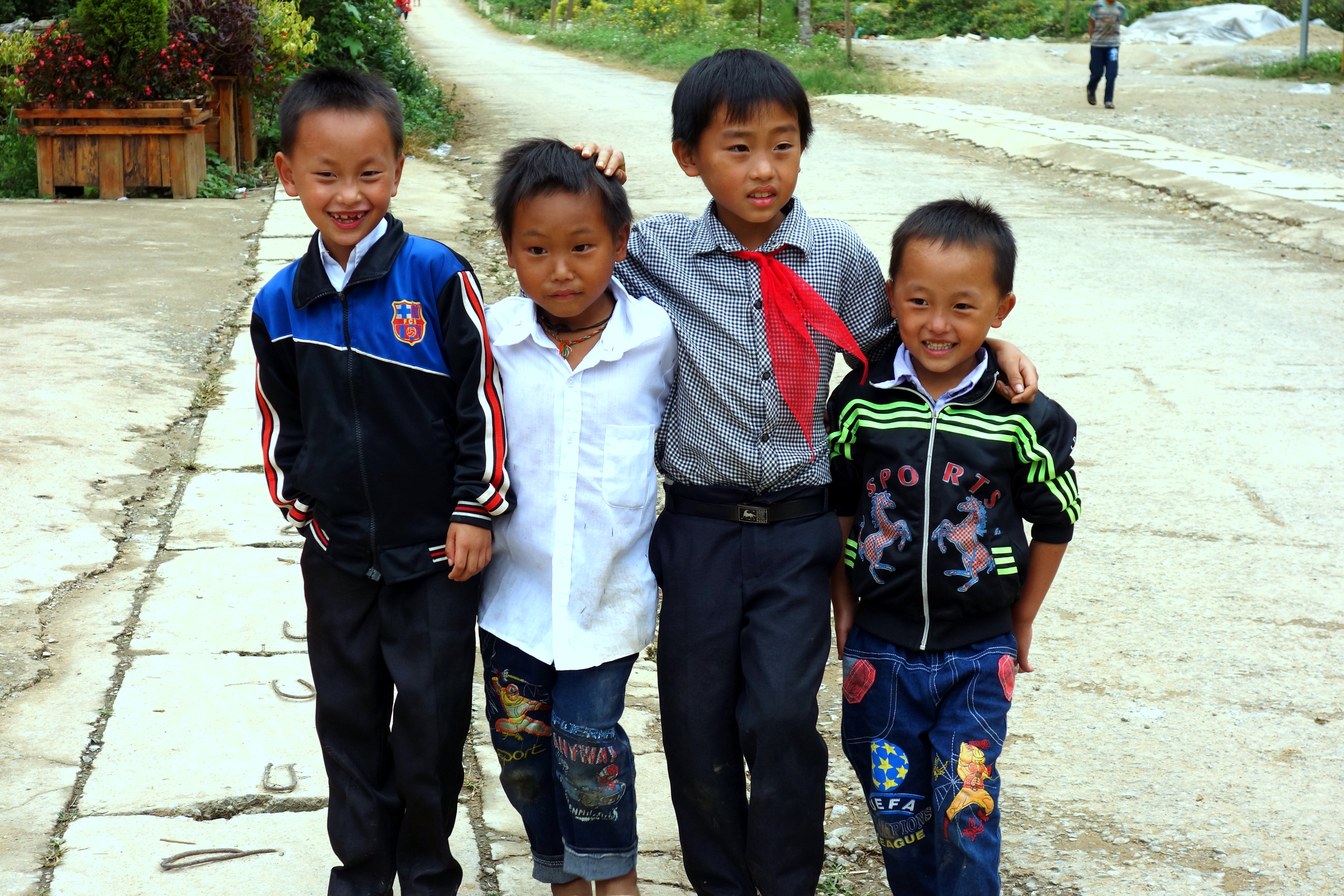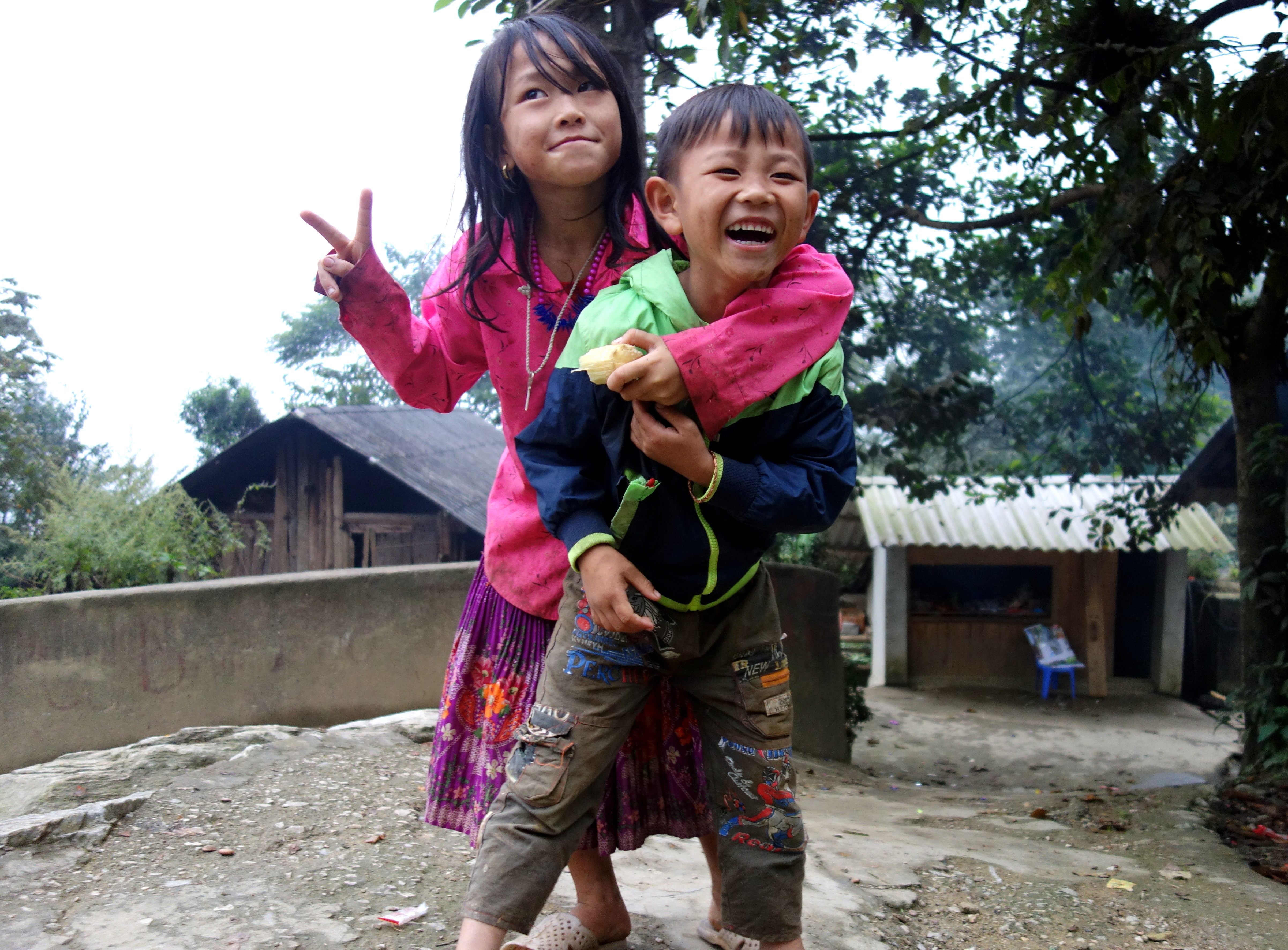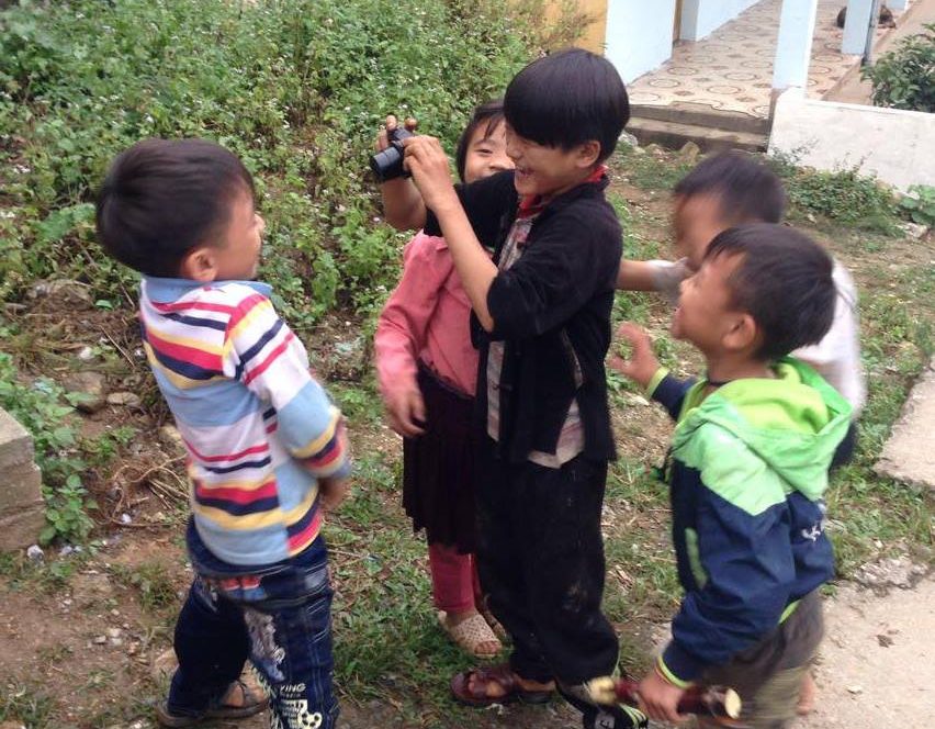 Demi-tour, on erre au hasard des chemins. On se retrouve au bout d’une impasse avec un chien pas très sympa qui grogne et montre les dents, pas très rassurées !! Au bout d’un autre chemin on arrive dans une cour d’école. On est dimanche mais quelques enfants sont en train de jouer dans la cour. Quand ils nous voient, ils arrivent en courant et nous demande “pen pen ?”. Je n’ai qu’un seul stylo et ils sont au moins 7 ou 8. Je leur montre mon sac en disant non non. Mais ils ont aperçu mon appareil photo et leurs visages s’illuminent. Je leur donne l’appareil et s’ensuit une séance photo pleine de rires ! C’est un merveilleux moment. Ces enfants sont sales, très pauvres mais ils respirent la joie de vivre. On leur dit au revoir et on rentre.