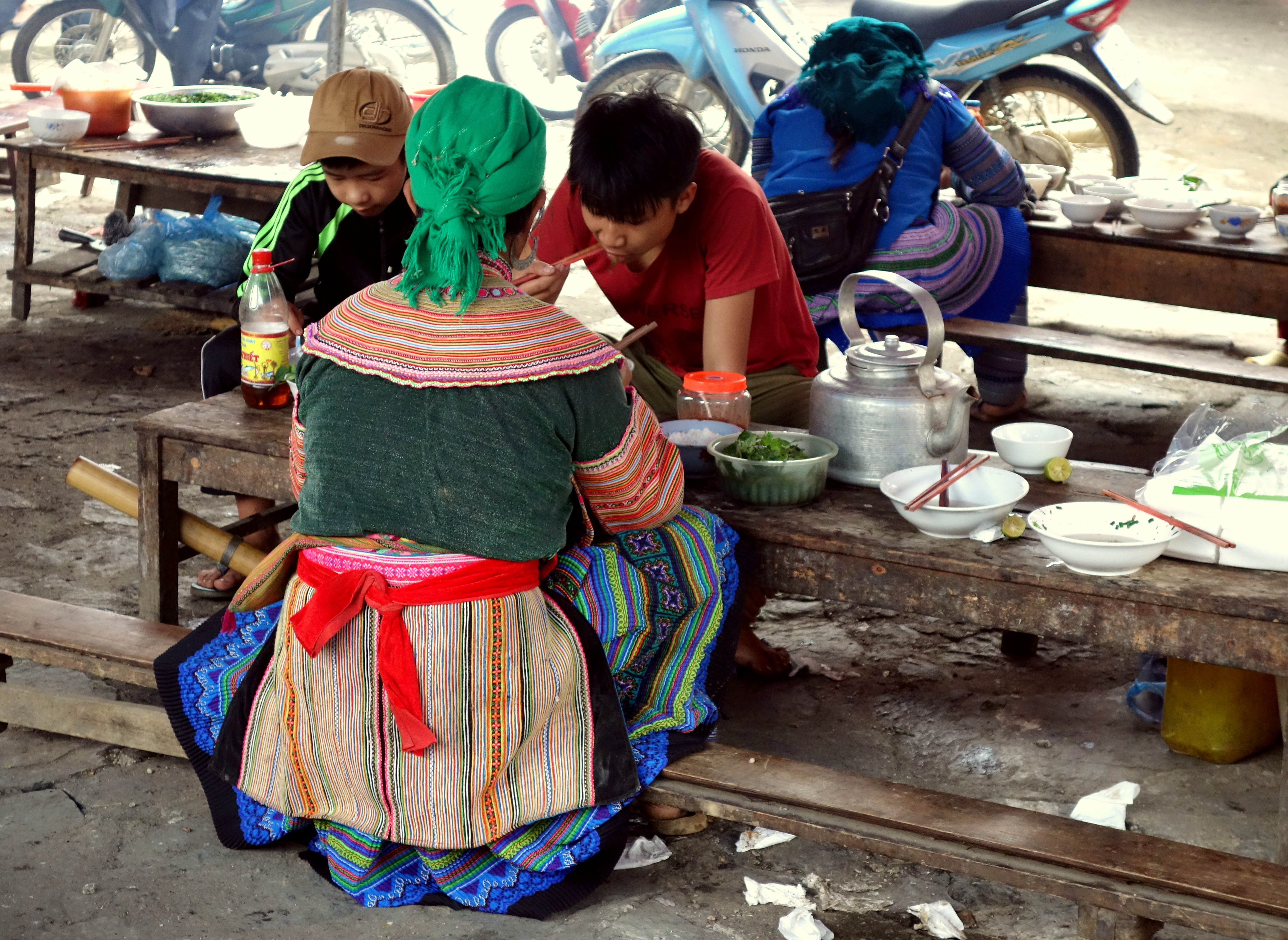 Une femme vietnamienne et sa fille viennent discuter avec moi. Elles sont là pour le week-end, c’est la première fois qu’elles viennent à Bac Ha. On papote, puis, je pars à la recherche d’un café pour tenir le coup! Je m’assois au cœur du marché et regarde tout le monde arriver. Il est 7h, le marché commence et j’observe avec émerveillement toutes ses tenues colorées s’agiter devant moi.