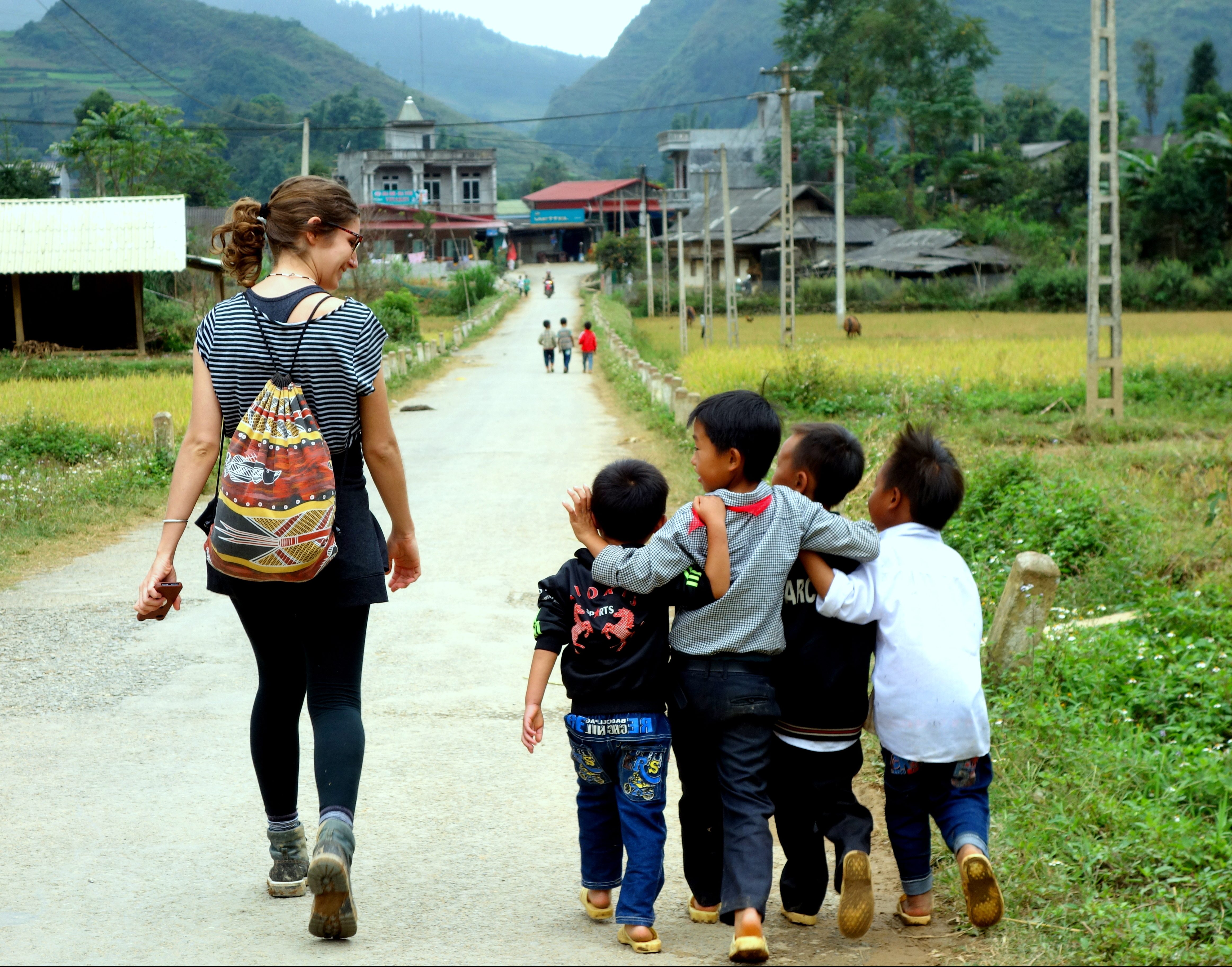 Ensuite, on rencontre des enfants sur le chemin et on compte jusqu’à 10 en anglais avec eux. On rigole et on chante jusqu’au village !