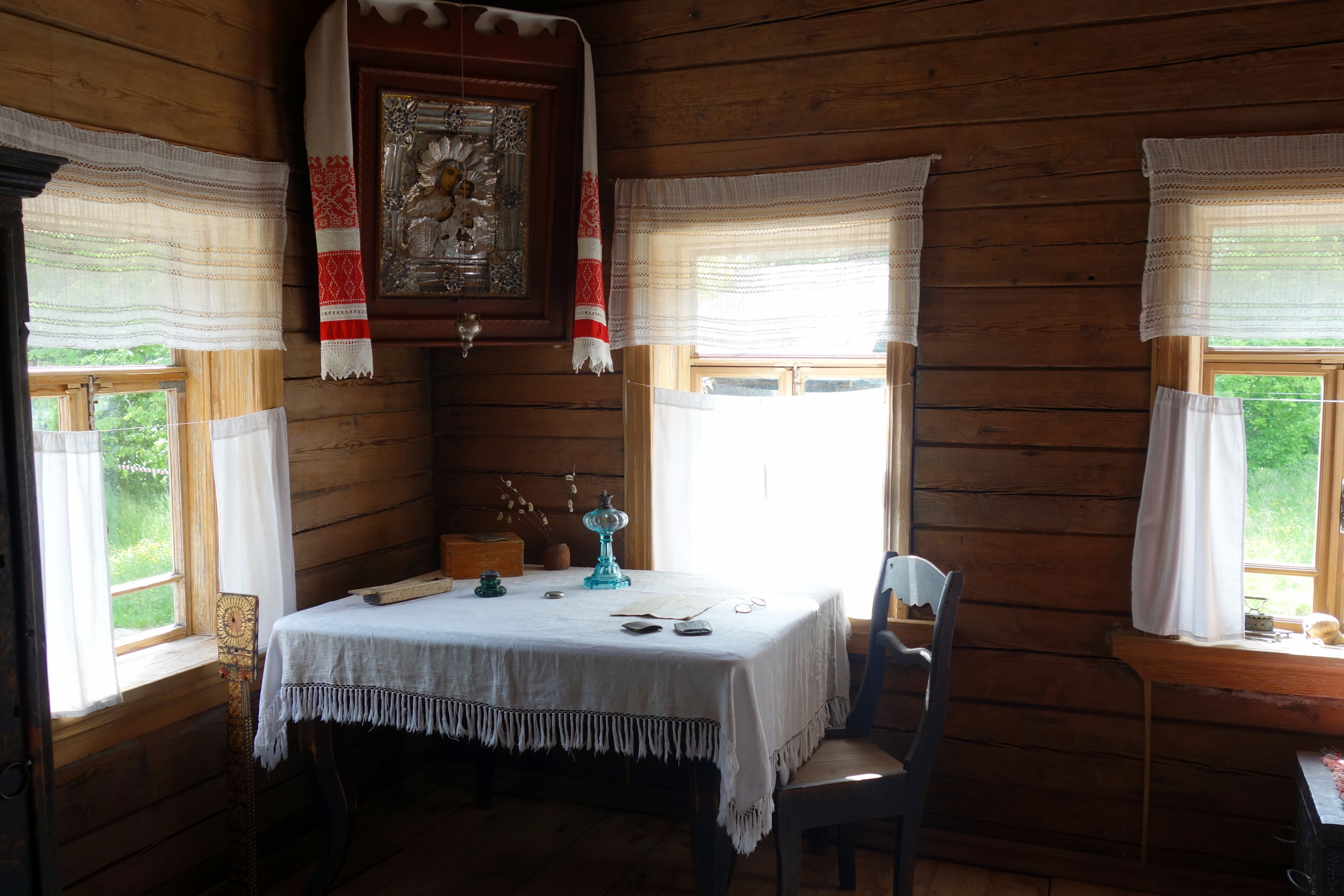 Dernier jour à Novgorod Veliky, je prends le vélo de l’auberge pour aller visiter le musée de l’architecture en bois qui se trouve à quelques kilomètres de là. Le musée est en fait un village reconstitué avec les différents bâtiments qui existaient entre le XVIè et XIXè siècle partout en Russie ! Super intéressant, mais malheureusement en travaux .. Je ne peux donc pas accéder à tout ! J’aime beaucoup l’intérieur des habitations, c’est extrêmement bien fait et on s’attend à voir des gens surgirent à n’importe quel moment et poursuivre leurs activités. Tous les détails de la vie quotidienne y sont.
