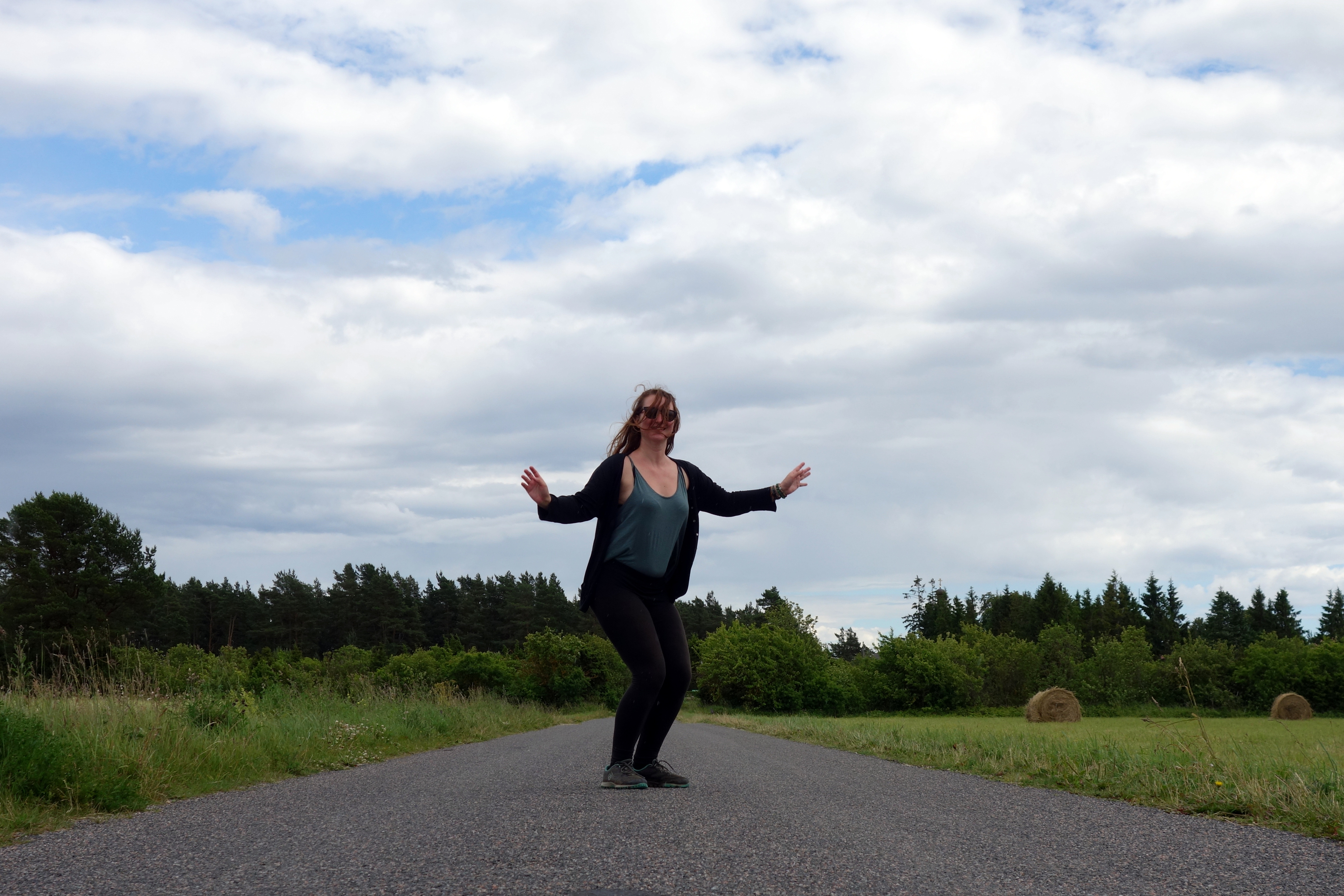 Je décide de prendre une photo sur un petite chemin au milieu des champs, appareil photo posé sur mon sac au milieu de la route, mode retardateur activé, je cours et me prépare à sauter, 3,2,1 JUMP ! Je regarde le résultat, raté. Je recommence, c’est mieux mais j’ai tous les cheveux devant la tête, une troisième fois, c’est mon tee shirt cette fois-ci qui s’est envolé. Il commence à pleuvoir mais je veux absolument ma photo, le bonheur de voyager seule ! Vite, une voiture arrive, je cours enlever mes affaires du milieu de la route, photo ratée. Il pleut de plus en plus, vite une dernière, de dos, basique, elle ne peut pas être ratée ! Et je cours jusqu’au musée au bout de la rue me mettre à l’abri ! Voilà, vous connaissez le plus grand secret des voyageuses solo qui se prennent en photos !