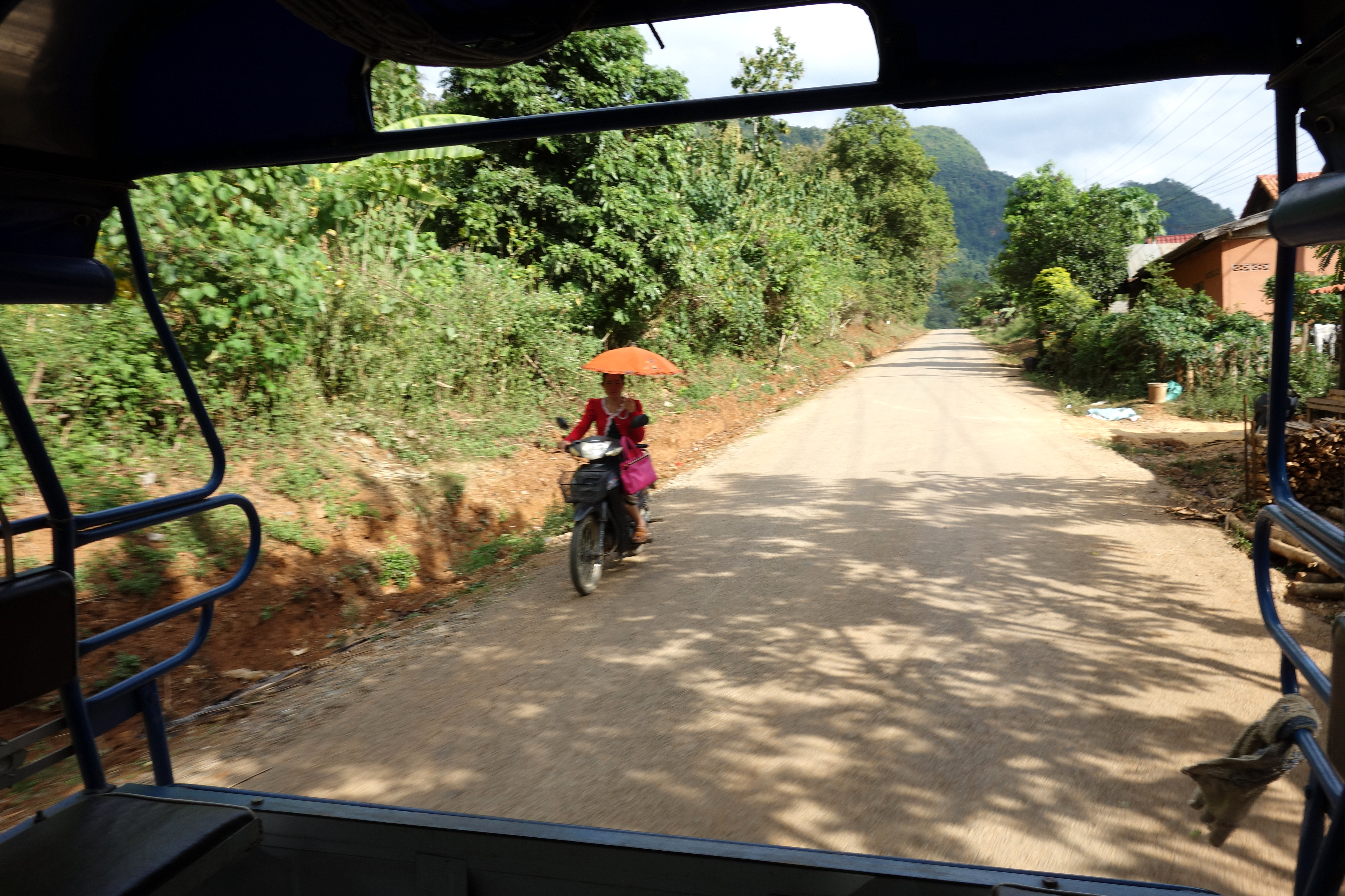 Arrivée à 14:30, je dois me dépêcher pour prendre le bus de 15:00 pour Luang Prabang. C’est donc ma première expérience en TukTuk pour rejoindre la gare. J’aperçois les premiers parapluies ! Ici, ils ne se couvrent pas comme au Vietnam, ils se cachent du soleil avec un parapluie(-sol).