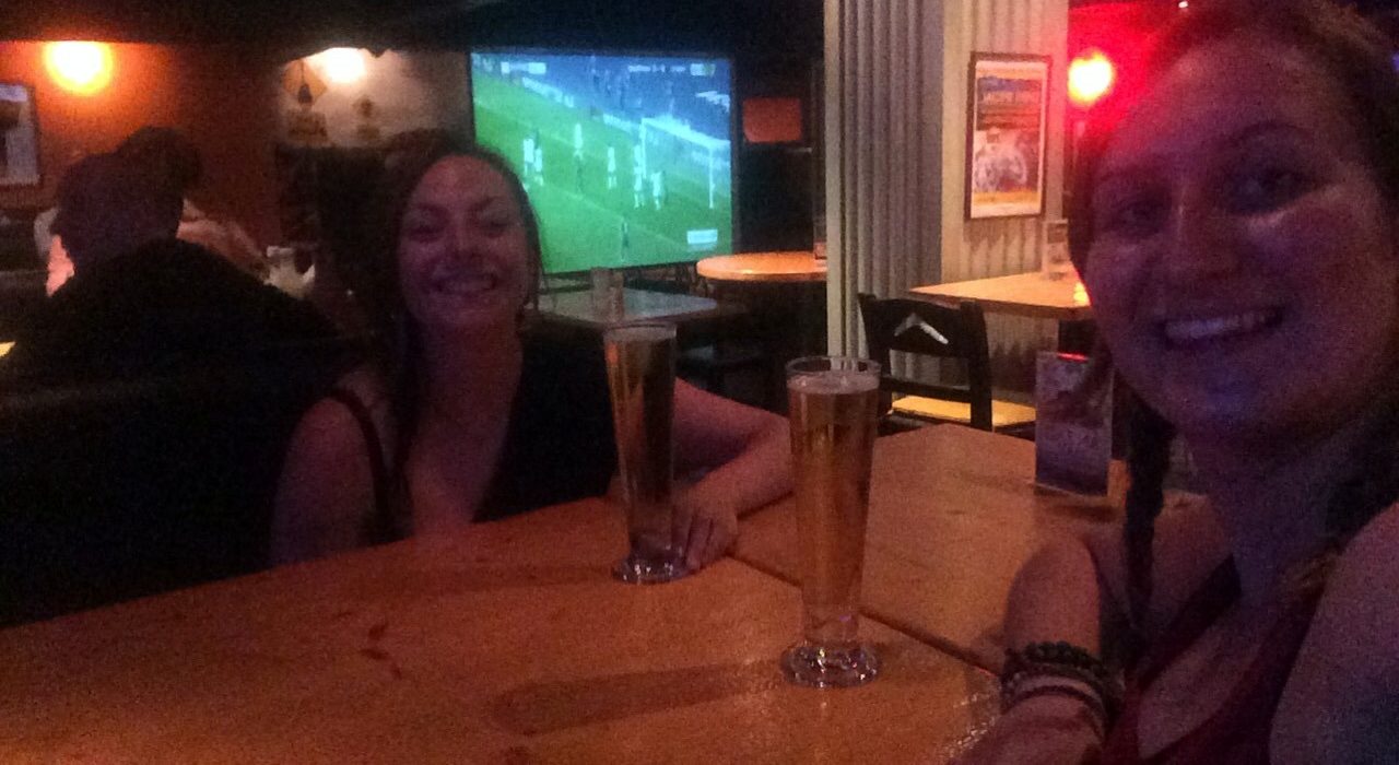 Tellement perturbées qu’on y retourne le lendemain midi… sérieusement oui… rebelotte ! Sauf que cette fois, on a bien choisi notre jour ! C’est Anzac day ! La fête nationale australienne et on est … dans un bar australien haha ! En fait, si on a l’esprit un peu embrumé et qu’on ne reconnaît pas le sport à la télé, c’est peut être à cause de la soirée un peu arrosée de la veille … on fêtait nos retrouvailles ! Et nos 3 mois sans soirées ! (J’ai tenu 3 mois sans aucune soirée, qui l’aurait cru ?!)