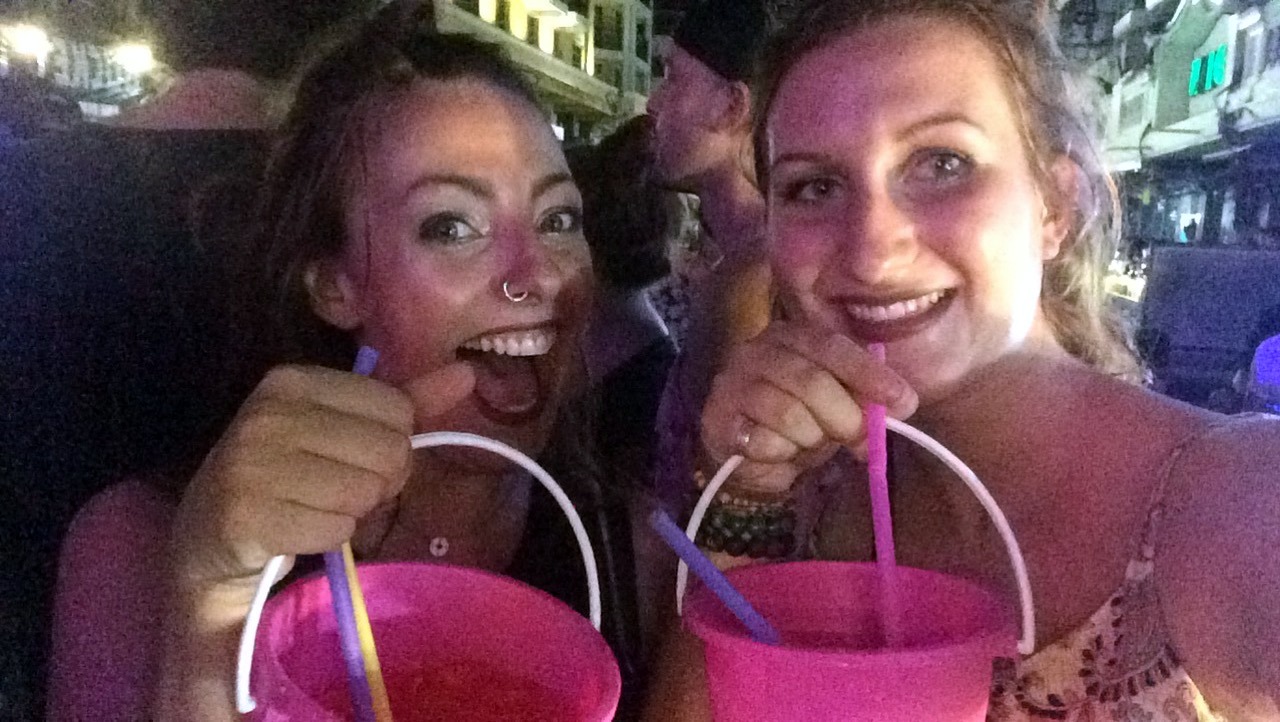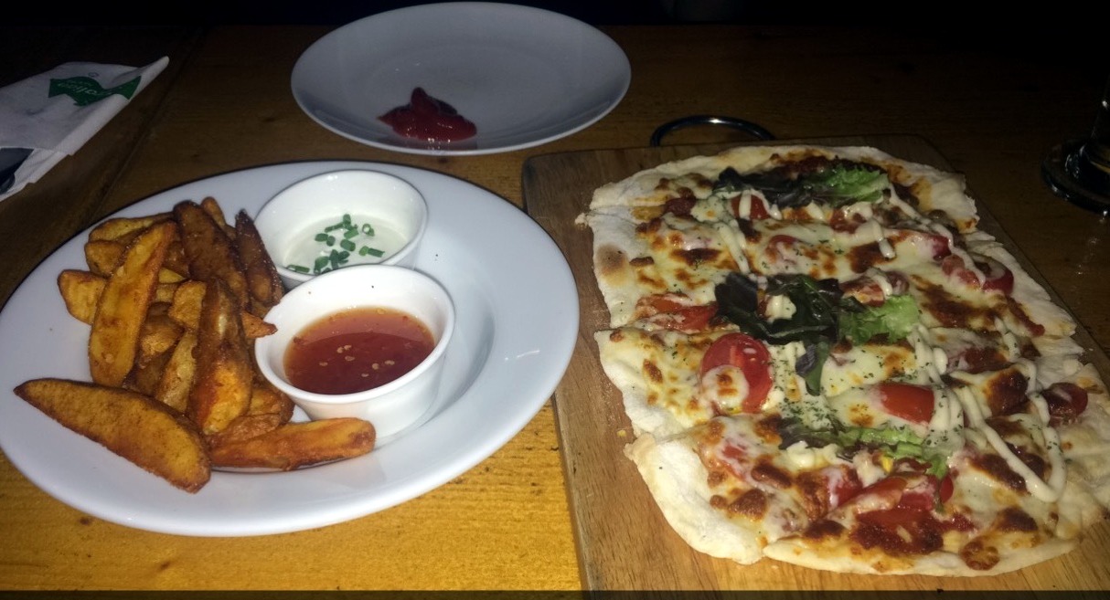Trop contentes de se revoir (Oui déjà ! Les liens sont plus forts en voyage hihi) on part directement pour notre activité préférée : manger !!! Et alors qu’on était parties pour un PadThai (la base) on réalise rapidement qu’on est dans un quartier un peu chicos et les padthai sont à moitié prix des plats occidentaux. Après autant de privations (les McDos en escale ça compte pas vraiment, si si, je vous le dis!) on mange dans un resto australien avec des bonnes bières ! Au menu : pizza et frites ! On n’est plus habituées aux baths et on sous estime carrément le prix du repas ! En vrai, si on avait bien calculé on n’aurait jamais mangé là … Environ 300 baths chacune (7€ !!!) sauf que 300 rs ça faisait 2€ au Sri Lanka … y a de quoi être perturbées !