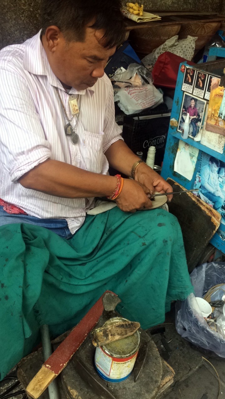 Le lendemain, on décide qu’on a assez vu Bangkok. En fait, on n’a rien visité, on a mangé, bu et … fait 2 massages ! Un des pieds et un thaï ! Bien mérité non ? Je suis retournée au Unicorn Café (Angie y tenait vraiment, elle ne connaissait pas, moi je m’en serai bien passée…). J’ai fait réparer (2 fois!) mes chaussures du Sri Lanka que j’aimais trop mais elles ont quand même fini par me lâcher définitivement … On a trouvé une patinoire dans un gigantesque centre commercial, on a vu des fringues hors de prix pour deux voyageuses au long cours, on est passées au stand de maquillage et on a testé toutes les nouveautés ! En fait, Angie a une énorme trousse de maquillage dans son sac, alors tous les soirs, j’ai redécouvert le bonheur de se “préparer” avant d’aller en soirée ! Enfin, de se préparer tout court je devrais dire …
