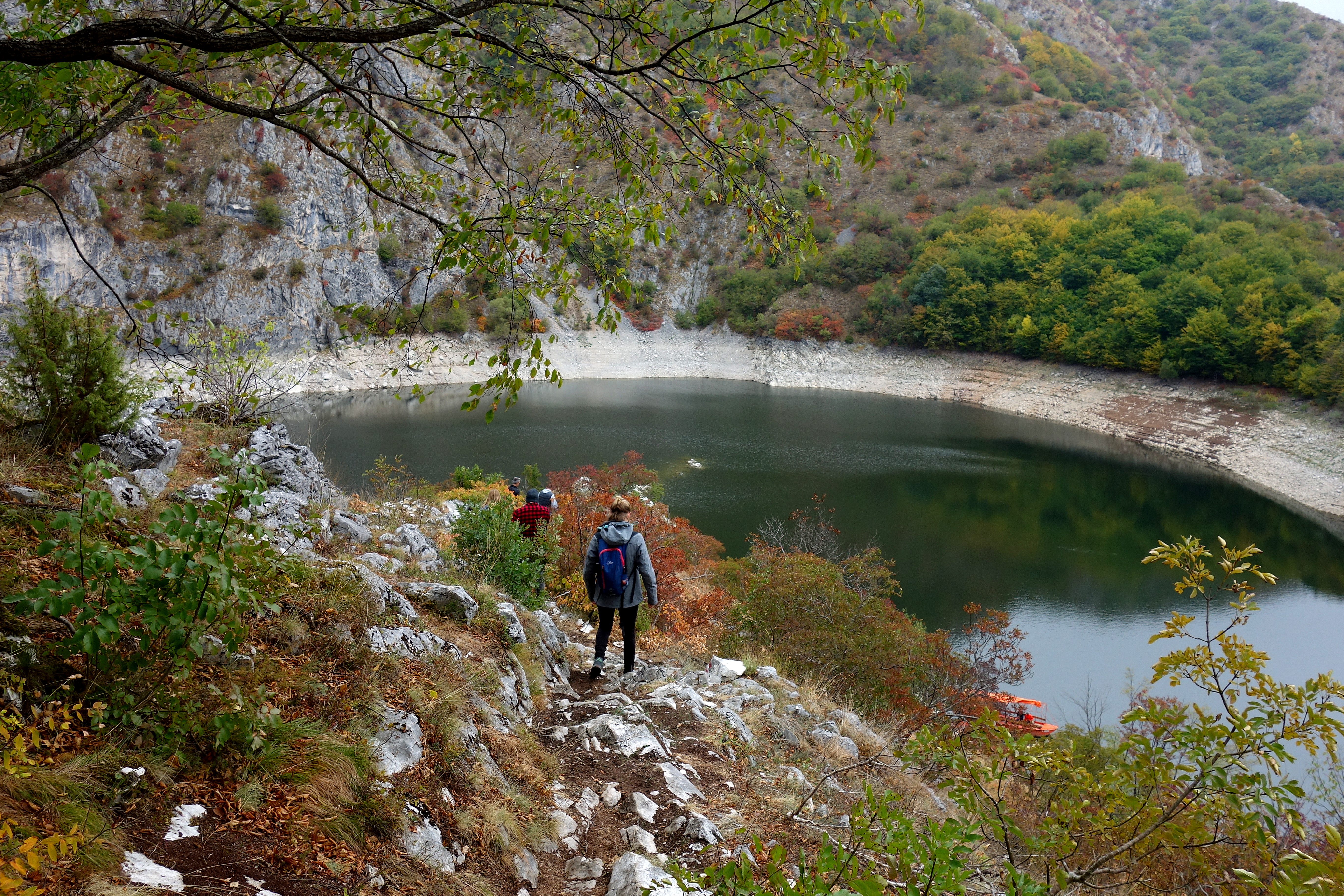 Après avoir marché le long de la crête pour rejoindre d’autres points de vue, on a ensuite dû redescendre. Retrouver notre bateau glacial ! 1heure plus tard, complètement congelé, on regagnait la voiture. On s’est arrêtés dans un kafana, pour déguster un café noir autour du feu. Le stop suivant, un lac au milieu de rien. L’eau était translucide, incroyable ! Un lieu superbe, on était tout seuls. En été, j’aurai adoré m’y baigner ! Aaron, lui, n’a pas hésité : il a plongé et a passé au moins 15 minutes dans l’eau, un fou !! Assise au bord, je grelottais…