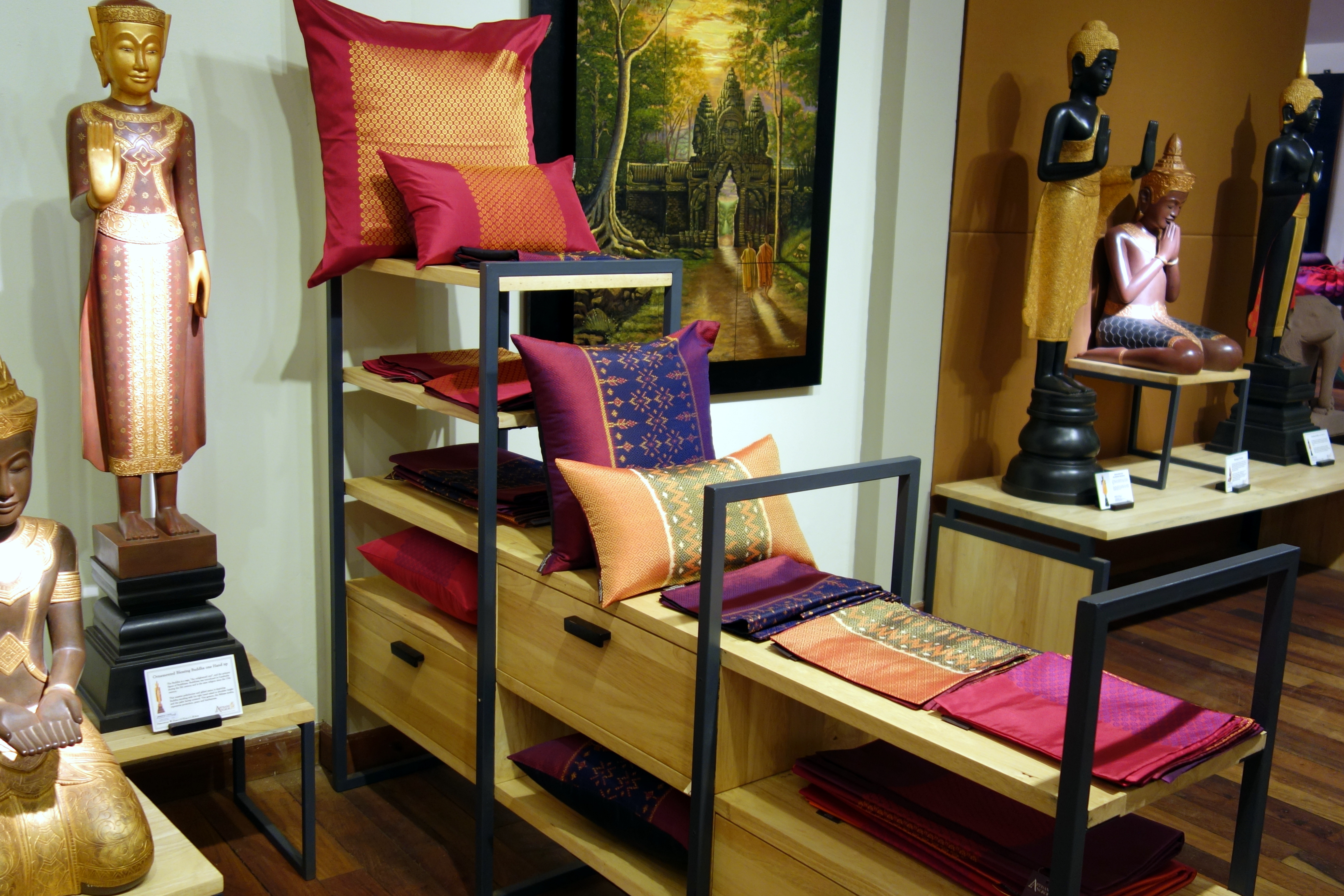 Maman : La visite (gratuite) de l’atelier des Artisans d’Angkor nous permet de découvrir un organisme qui met en valeur le savoir-faire traditionnel des artisans dans différents domaines et le transmettent aux nouvelles générations (céramique, laque, soie, pierre, bois, …). Les ouvriers ont un statut particulier et rare pour le Cambodge puisqu’ils travaillent 40 heures par semaine avec des temps de pause, des salaires supérieurs à ce qui se pratique car ils sont qualifiés et bénéficient de soin de santé pris en charge par l’entreprise. Les produits fabriqués sont vendus dans un magasin attenant. Nous avons pu faire le tour des ateliers, circuler entre les artisans et apprécier la qualité et la minutie de leur travail. Nous nous inscrivons gratuitement à la visite des ateliers de fabrication de la soie prévue le lendemain.