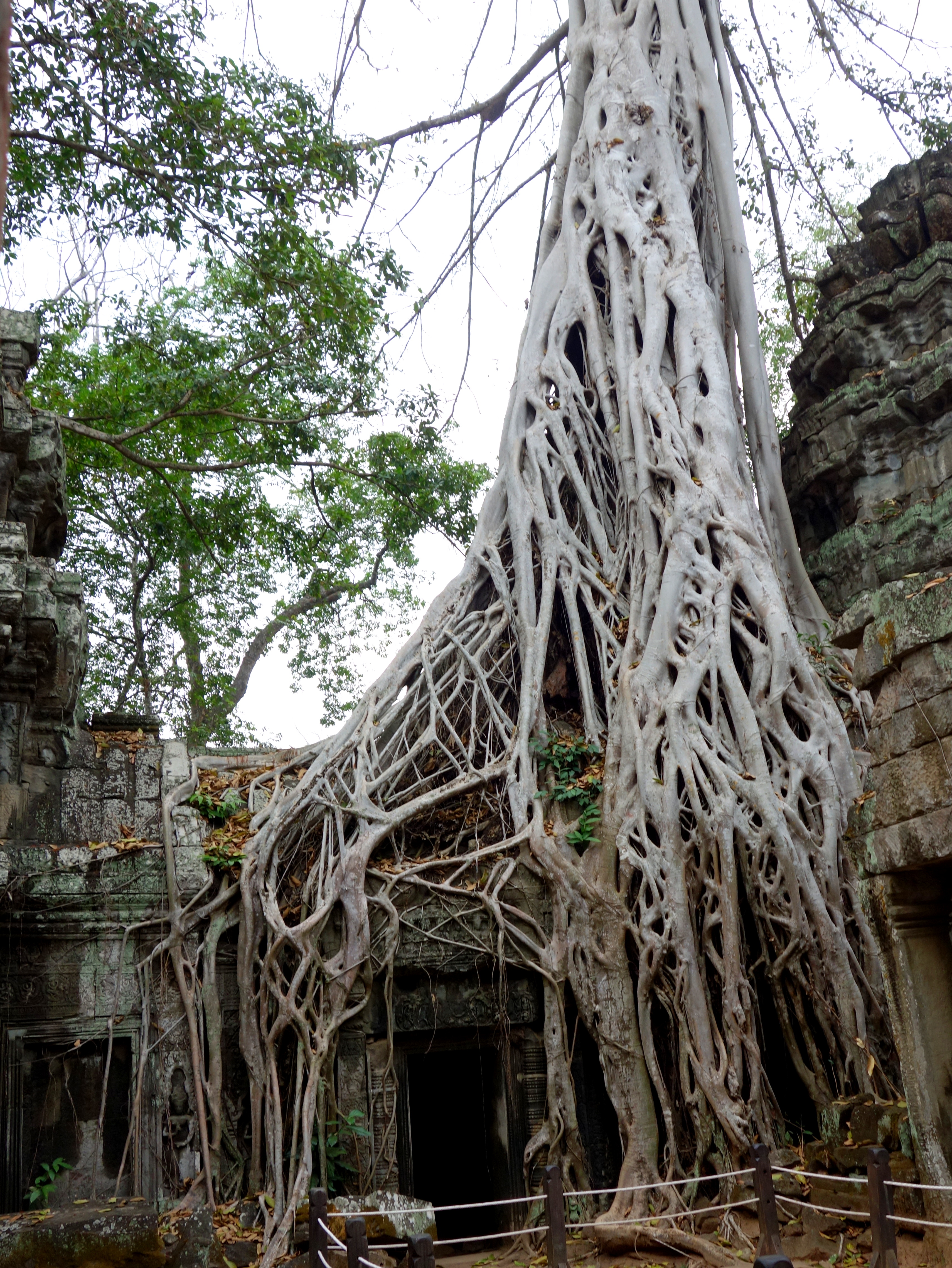 Les temples d’Angkor, s’étendent sur 400 km2, édifiés pendant plusieurs siècles, ils sont tombés dans l’oubli pendant environ 400 ans. La nature a alors repris ses droits, envahissant ces lieux sacrés, au milieu de la jungle. D’énormes racines d’arbres, les fromagers, enlacent les pierres de l’édifice telles des pieuvres. Le temple Angkor Vat est le temple symbole qui figure sur le drapeau national, il est aussi classé au patrimoine mondial par l’Unesco.