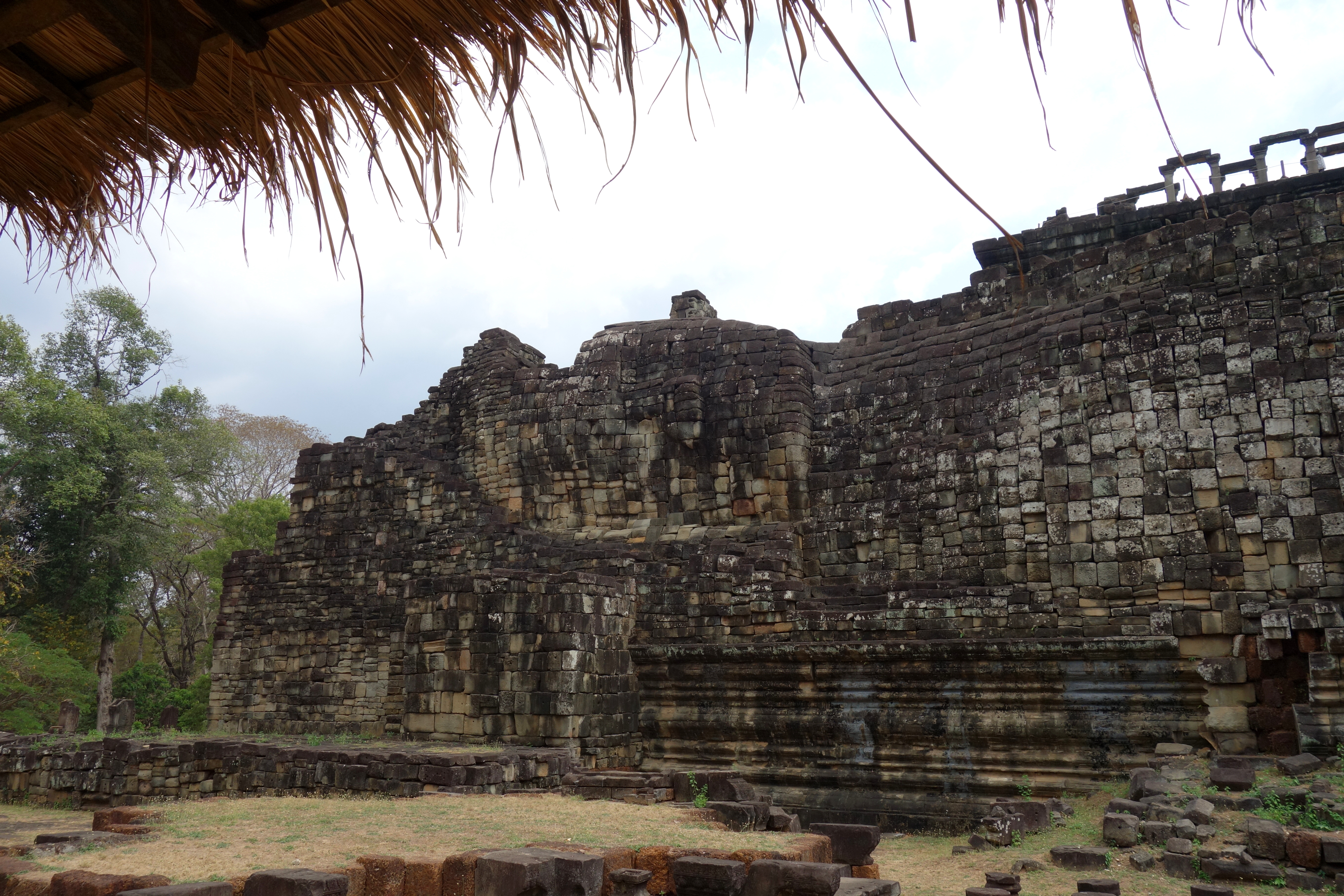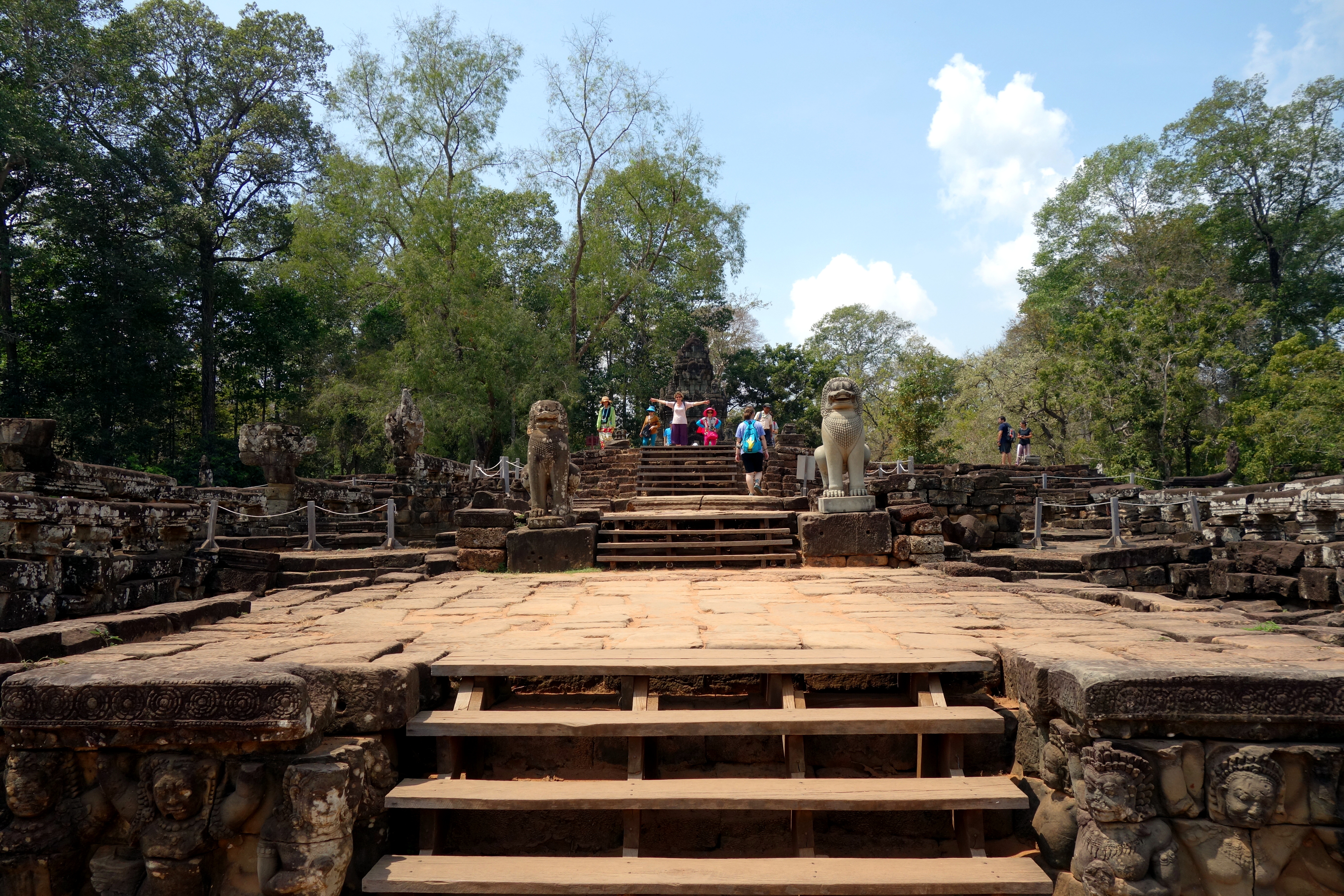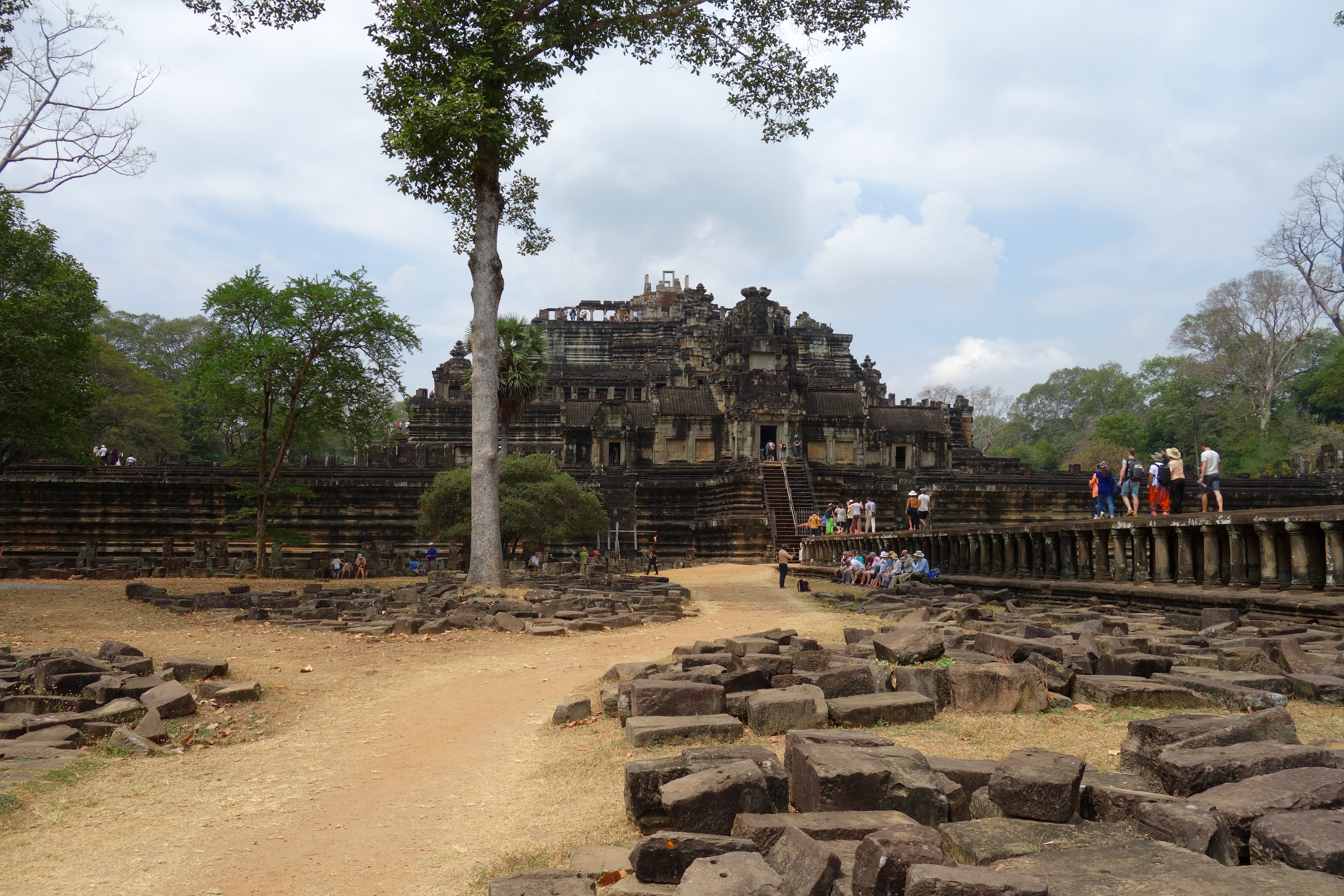 Léna : On arrive enfin à Bayon (oui oui comme Bayonne ! Les férias en moins…) il est 13h et nous sommes là depuis 5h ce matin. On commence à ressentir la fatigue et la faim…. On fait donc le tour du Baphuon sans avoir le courage ni l’énergie nécessaire pour grimper jusqu’en haut ! Dommage, la vue avait l’air sympa mais les marches, c’est plus possible !! À l’arrière du temple, on cherche la statue de bouddha couchée et on met du temps à la trouver ! Elle est pourtant gigantesque, incrustée dans la paroi du temple. Les pierres sont simplement empilées les unes sur les autres, on comprend pourquoi ça s’est écroulé à plusieurs reprises ! On passe ensuite dans le parc derrière, honnêtement on n’a qu’une seule hâte, rejoindre le tuk tuk pour aller manger.