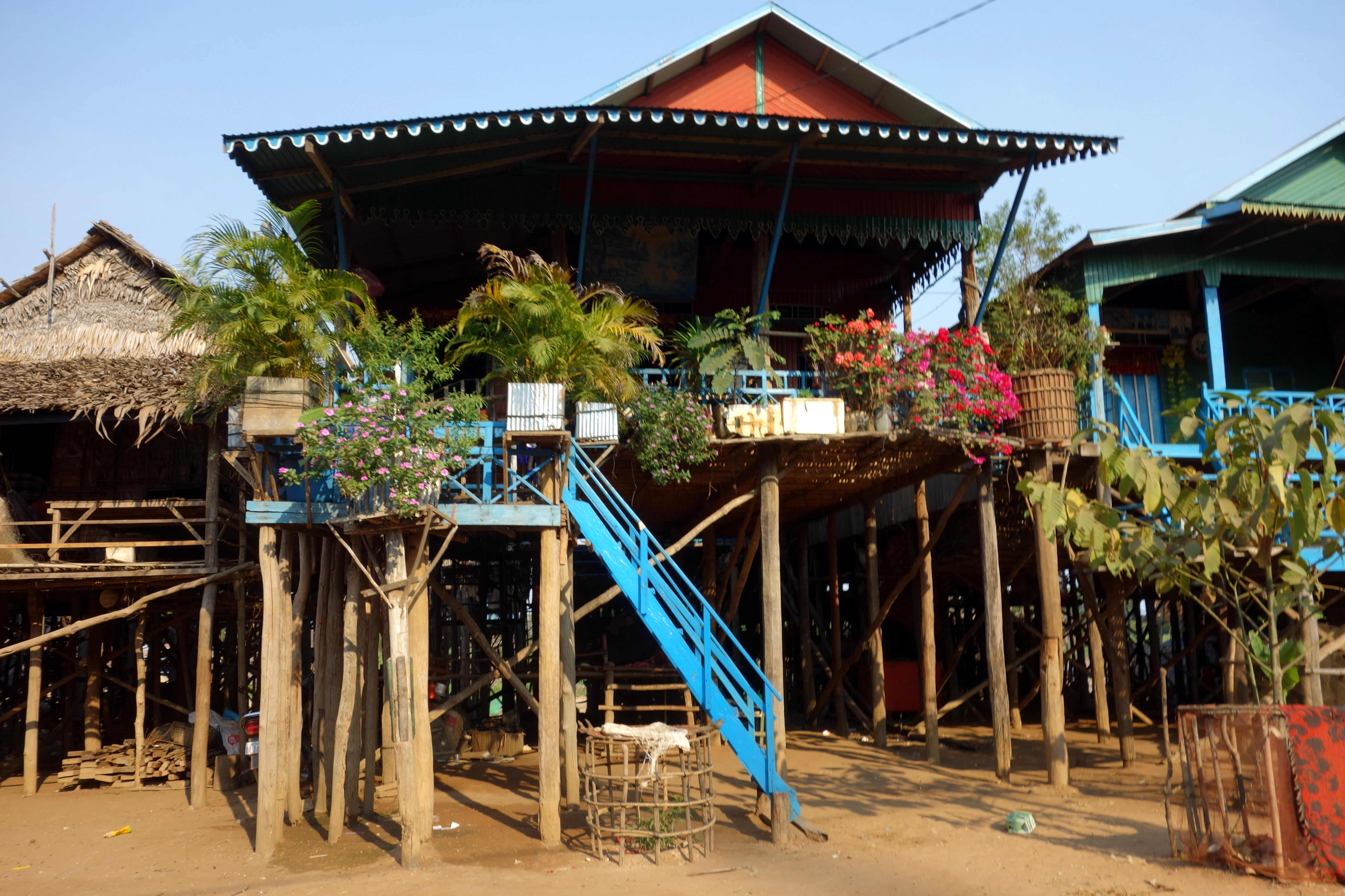 Enfin on arrive au village flottant, les maisons sont perchées sur des pilotis à 5 ou 7 mètres de haut, eh oui il n’y a pas d’eau nous sommes en saison sèche ! Mais c’est très impressionnant c’est un village avec une rue principale, des maisons proches les unes des autres mais toutes perchées très haut, le sol est en sable terreux ( limon ) un peu rouge et vole nous enveloppe d’un nuage ainsi que tous les gens sur notre passage. De grandes bâches sont posées à même le sol et des crevettes sèchent au soleil et profitent elles aussi de notre passage, arrivés au bout du village des enfants nous accueillent en quémandant, un monsieur veut que l’on paye le « parking » si nous laissons nos scooters là, l’accès à un ponton perché dans les arbres est payant lui aussi, je pense que le tourisme de masse est en train de faire beaucoup de mal à ce village qui n’est déjà plus dans l’échange, l’accueil, la bienveillance mais plutôt le profit, l’arnaque, l’intérêt face aux visiteurs … J’ai été horrifiée de voir en arrivant des dizaines de bateaux qui sont sur la berge de la rivière et qui assurément naviguent en saison haute chargés de touristes armés de leurs appareils photos et de leur voyeurisme comme s’ils étaient au zoo !! Je suis très peinée pour ces gens qui voient le pire de nos sociétés !!!