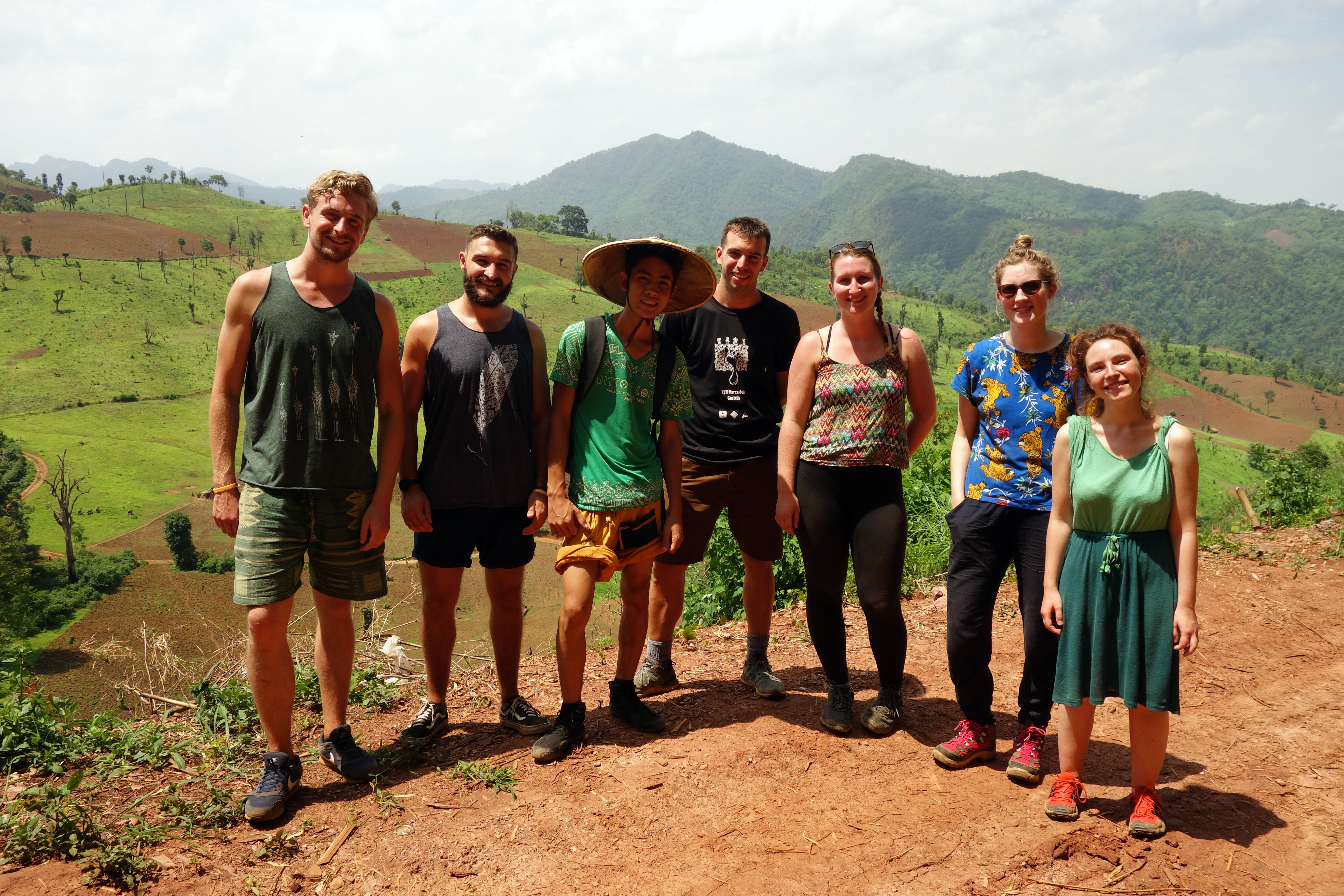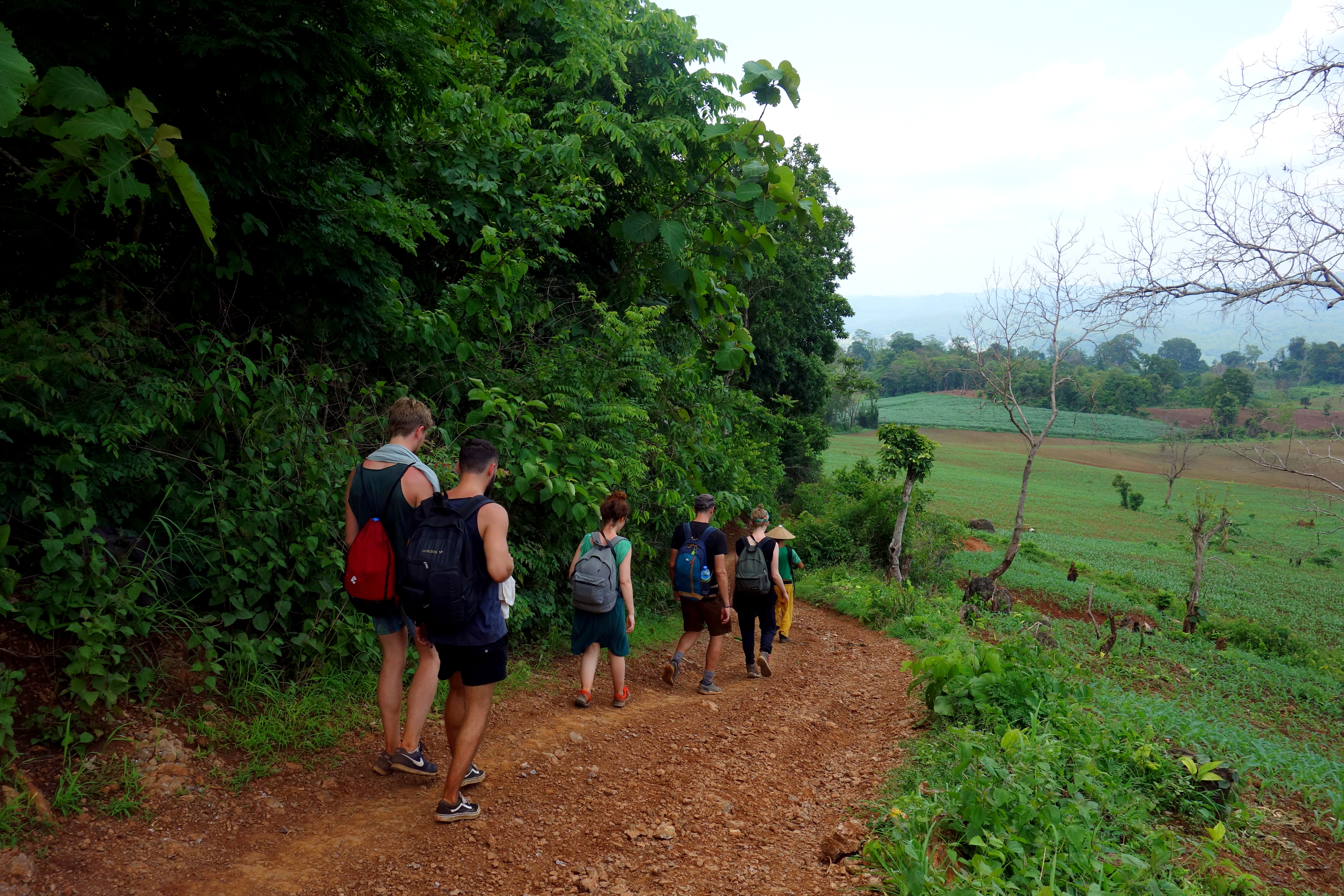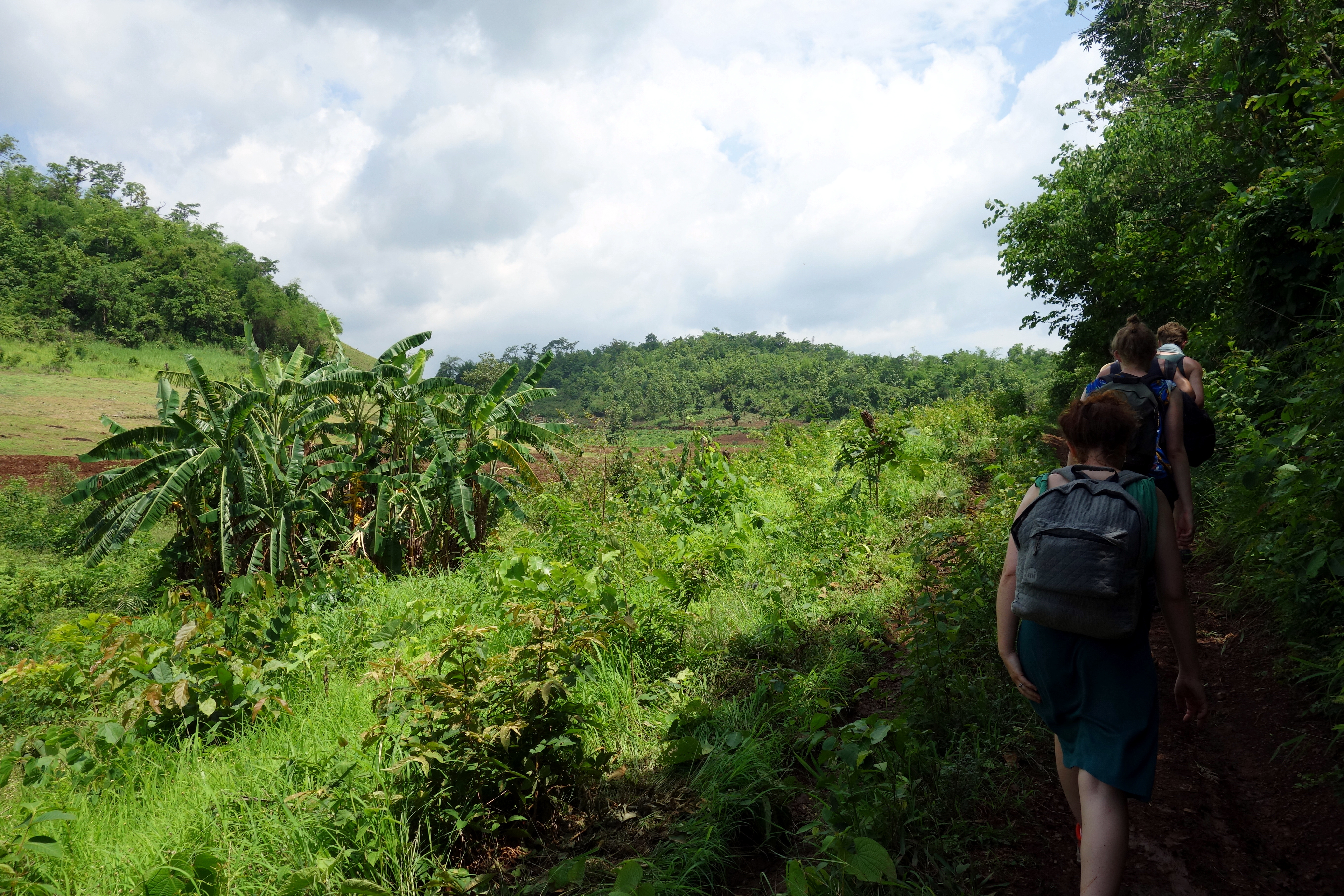 Je fais connaissance avec Héloïse et Lucie, deux Françaises qui voyagent un mois en Birmanie ! Le feeling passe hyper bien et je ne vois pas le temps passer. Enfin, ça c’était jusqu’à midi. Ça fait plus de 3 heures qu’on marche (bon, on a eu une petite pause snack sur la route) quand on attaque une grosse montée ! Genre une vraie montée interminable en plein cagnard. Les 3 gars qui nous accompagnent (1 néerlandais, 1 anglais et Albert !), Lucie et le guide tracent mais avec Héloïse, on meurt à l’arrière ! Il fait trop chaud ! La montée dure très très longtemps et notre guide, Winko, nous répète qu’il ne reste que 20 minutes, mais là ça fait 3 fois …