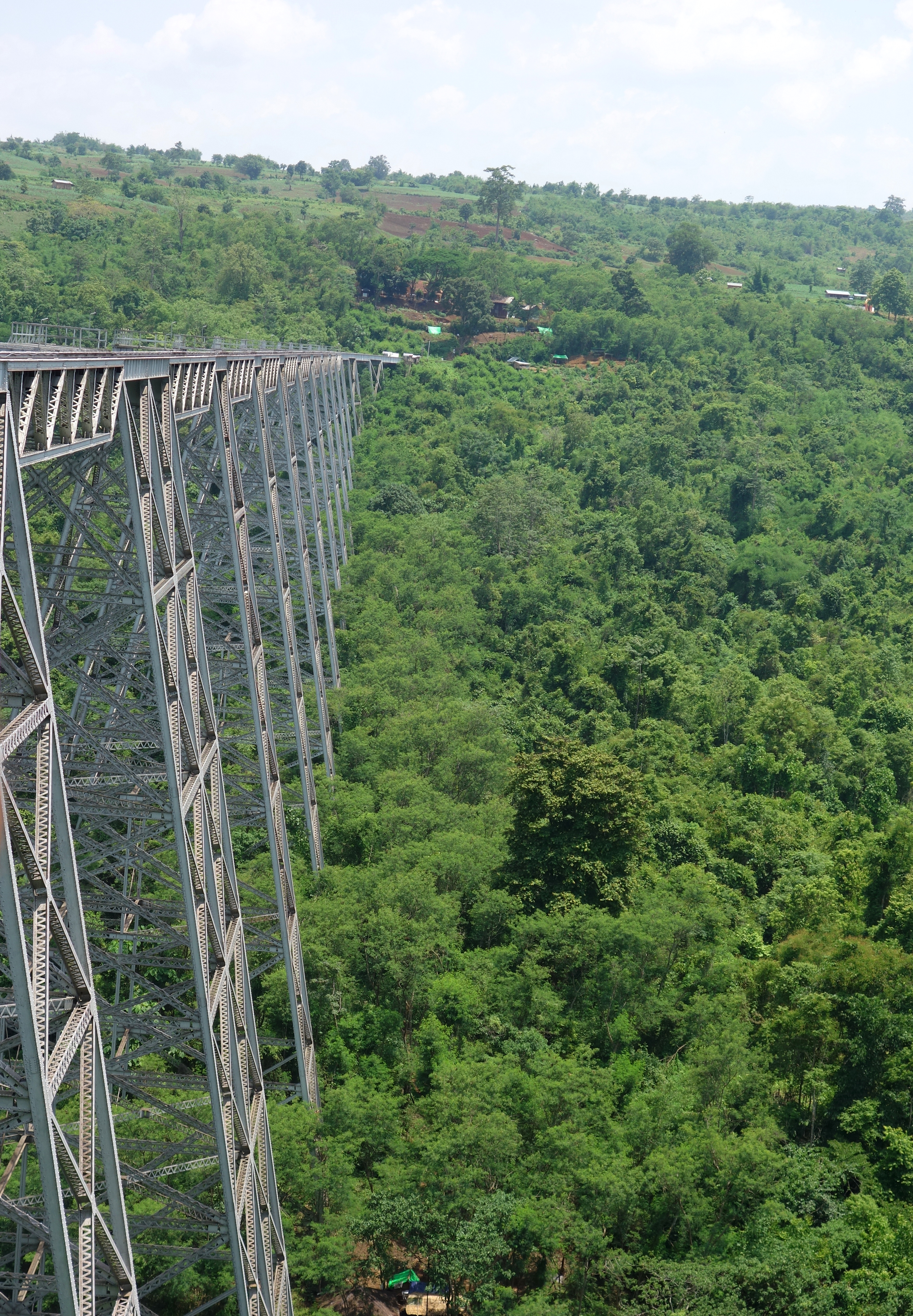 Un peu avant Pyin Oo Lwin, on passe sur le fameux viaduc de Gokteik. Le plus haut et long de Birmanie et … waou ! Incroyable ! Il est comme suspendu entre les deux montagnes. Il n’est vraiment pas large, juste la place pour le train de passer. Le vide, le trou, le gouffre de chaque côté est juste à couper le souffle ! C’est féerique ! Dans un autre genre il me rappelle un peu le pont pour aller à Poudlard dans Harry Potter …