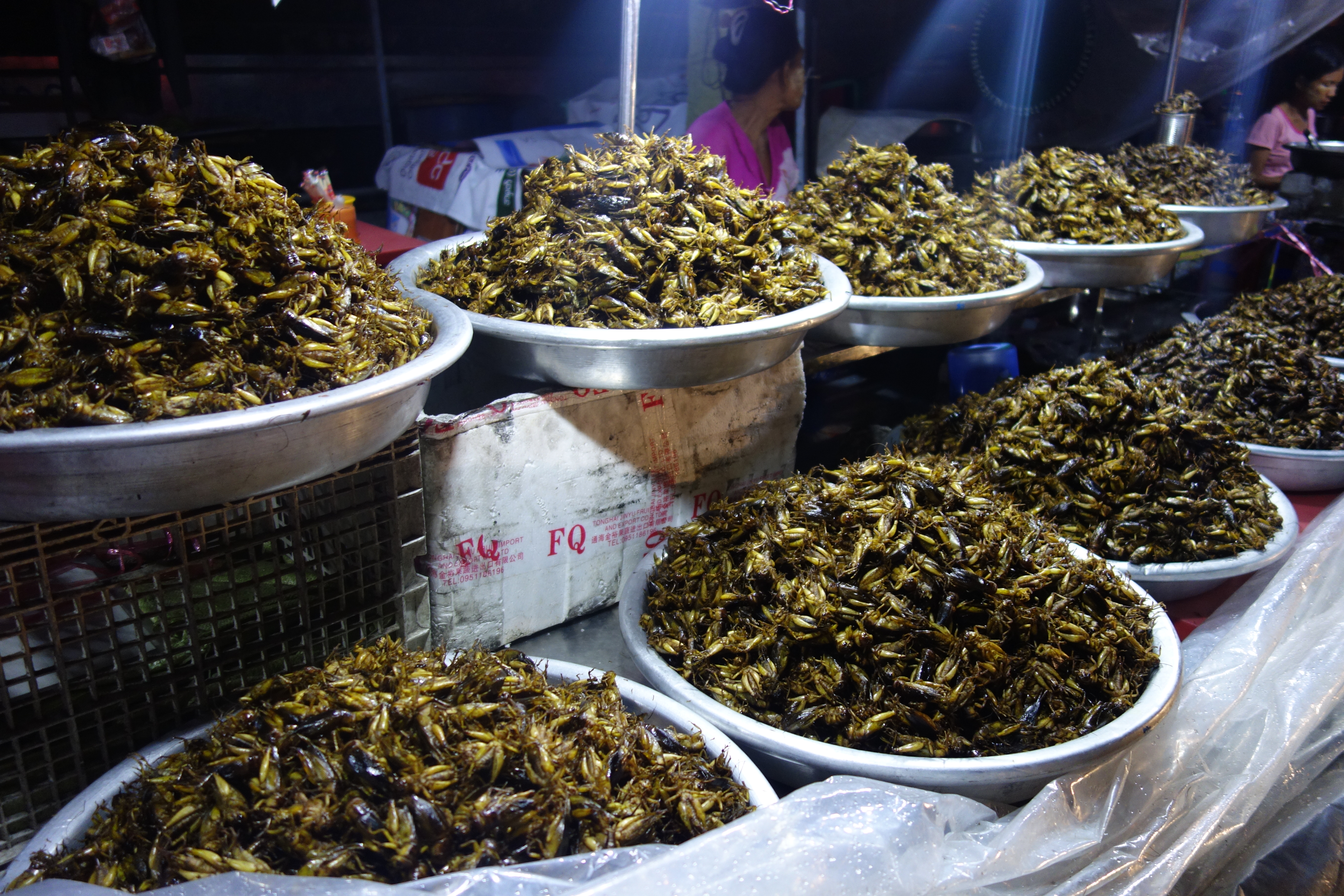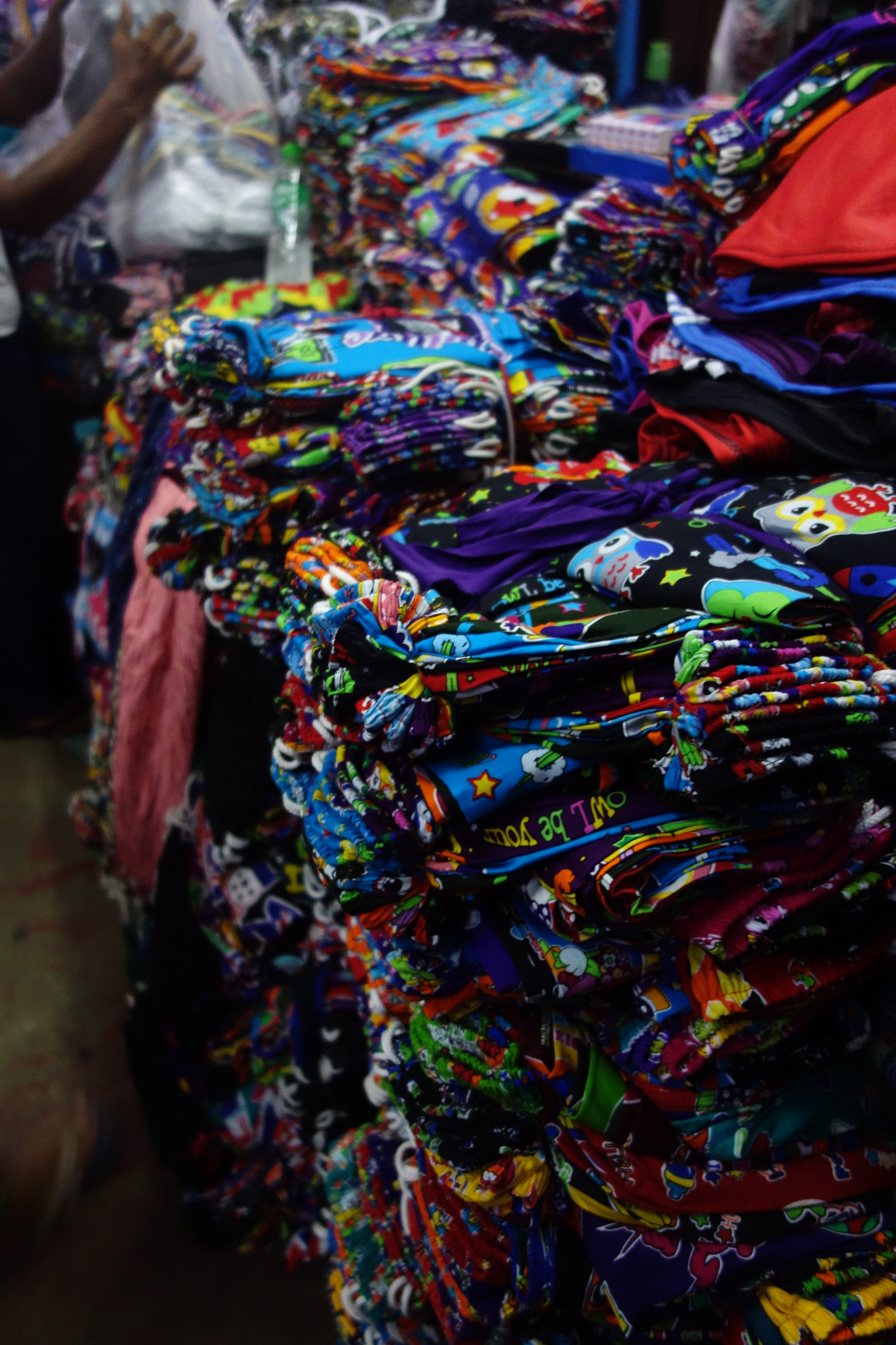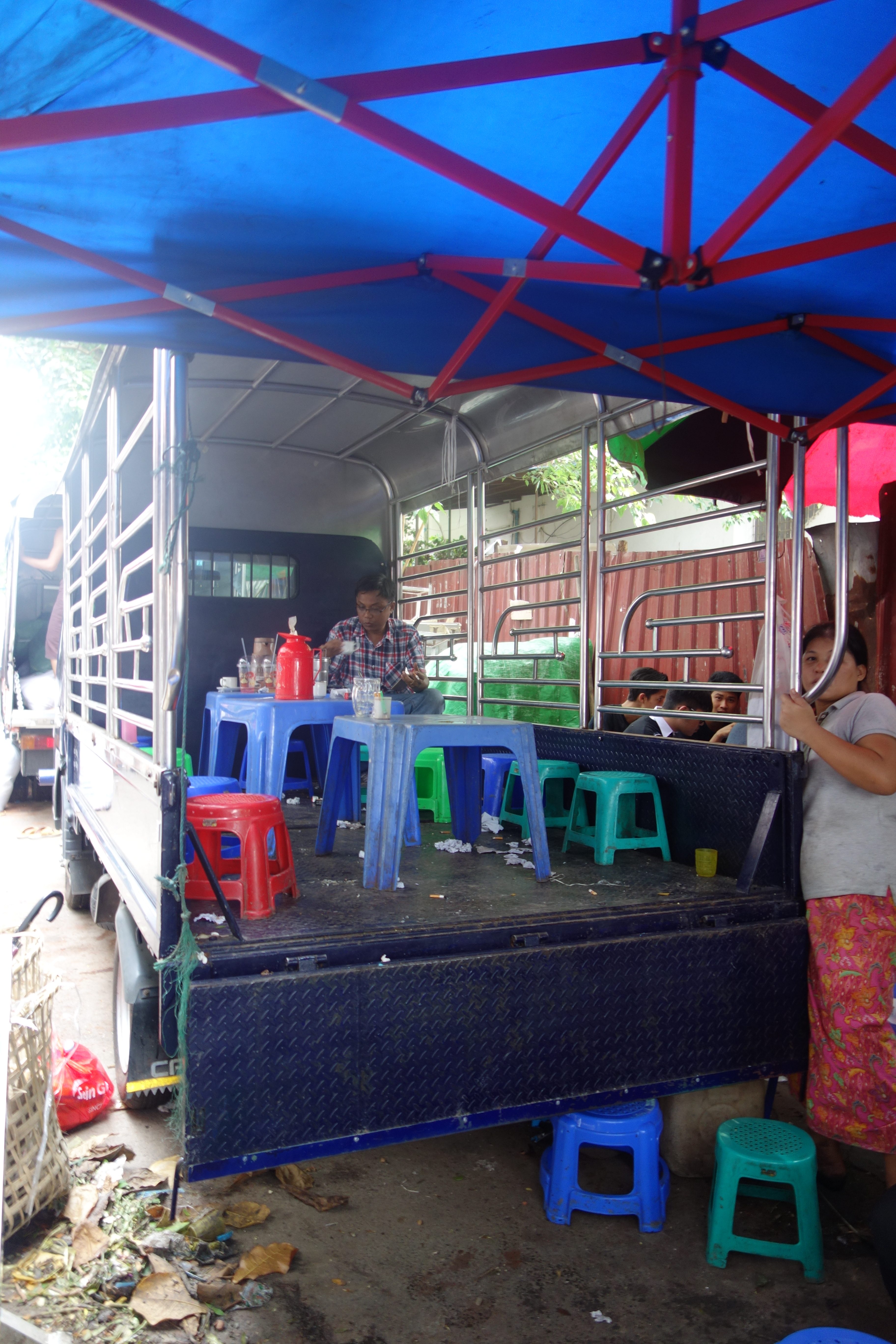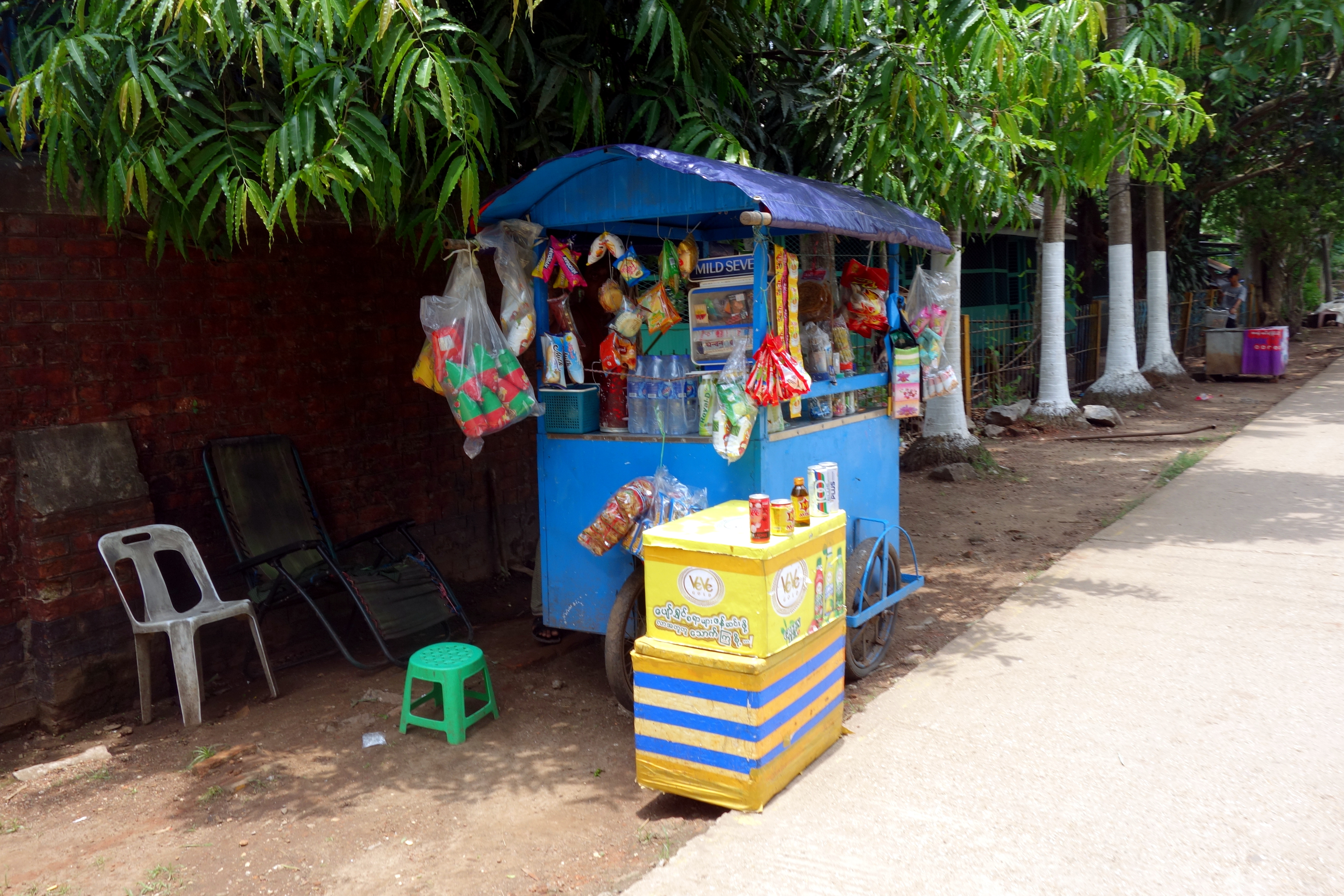 Dernier jour à Yangon, je reste sur ma lancée d’une visite par jour. Pas plus, j’ai toujours un peu la flemme. Je rencontre Camille, une française, elle a un peu la flemme aussi, ça tombe bien. On se motive à aller voir les marchés de la ville. On adore celui de Thein Gyi, c’est un vrai bazar au sens premier. Beaucoup de tissus colorés de tous les côtés, des petites allées chargées dans lesquelles il est difficile de circuler, du monde partout… Camille achète un longyi, moi, j’en ai déjà un mais c’est tentant ! On mange de la street-food, pas cher, pas cher !