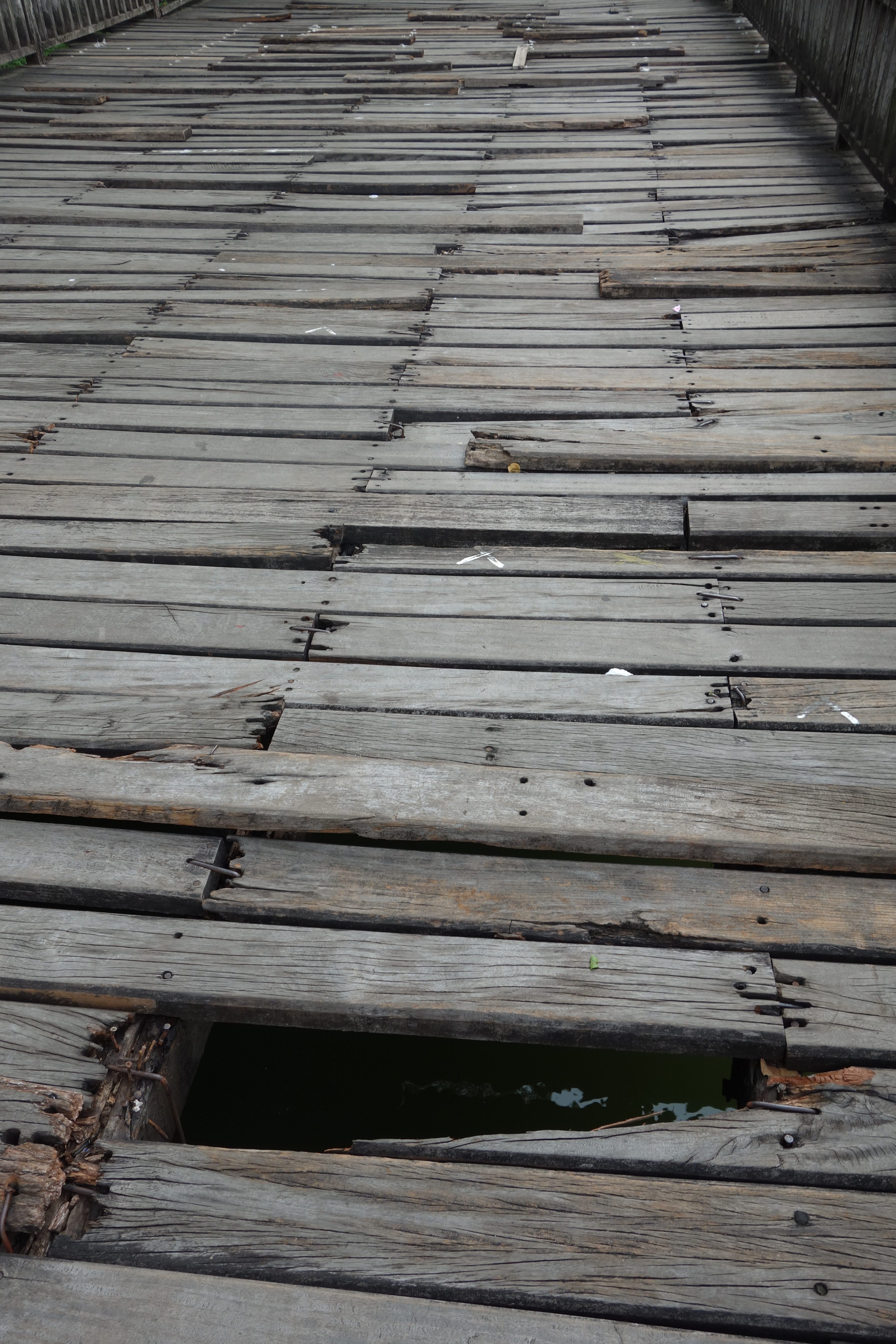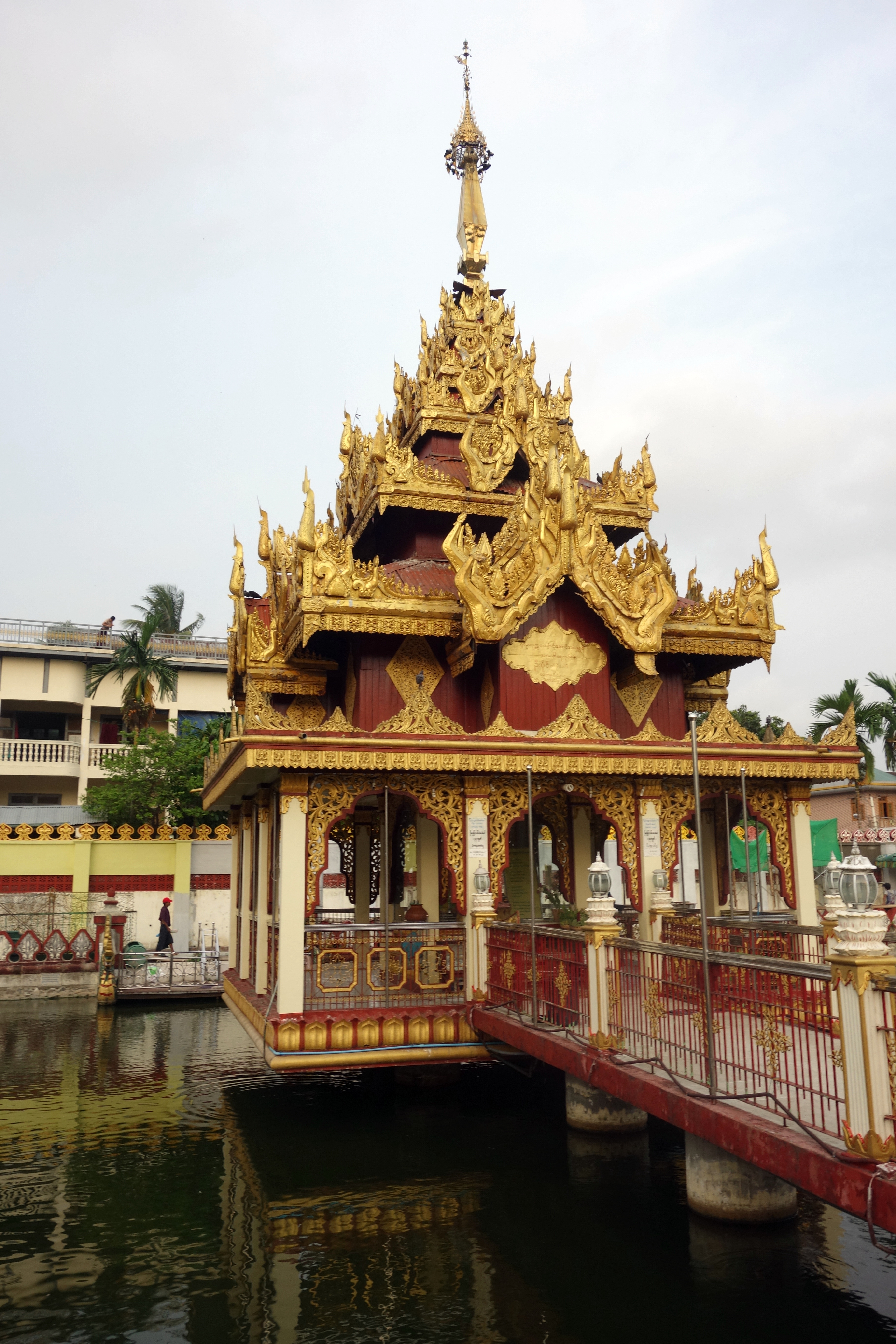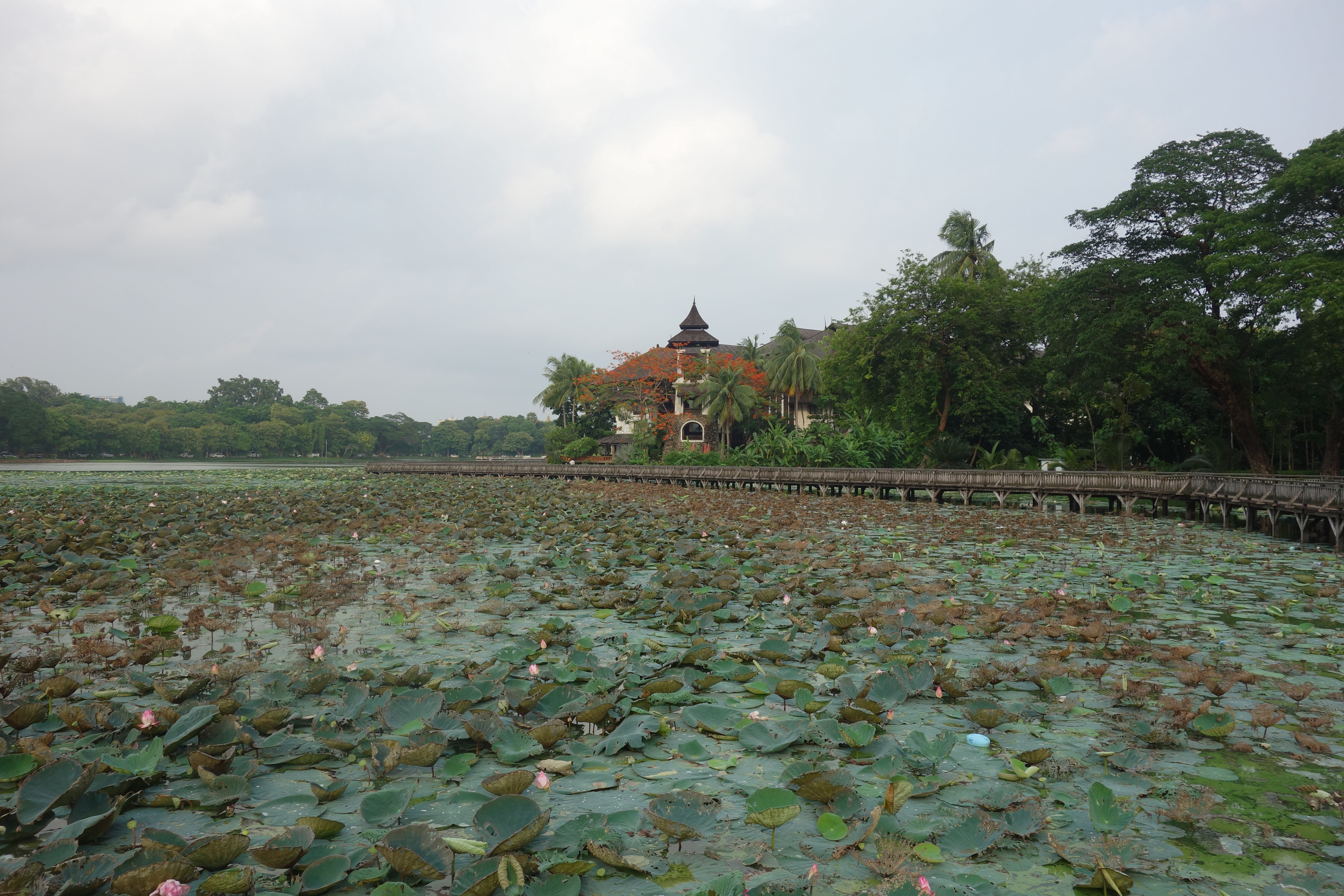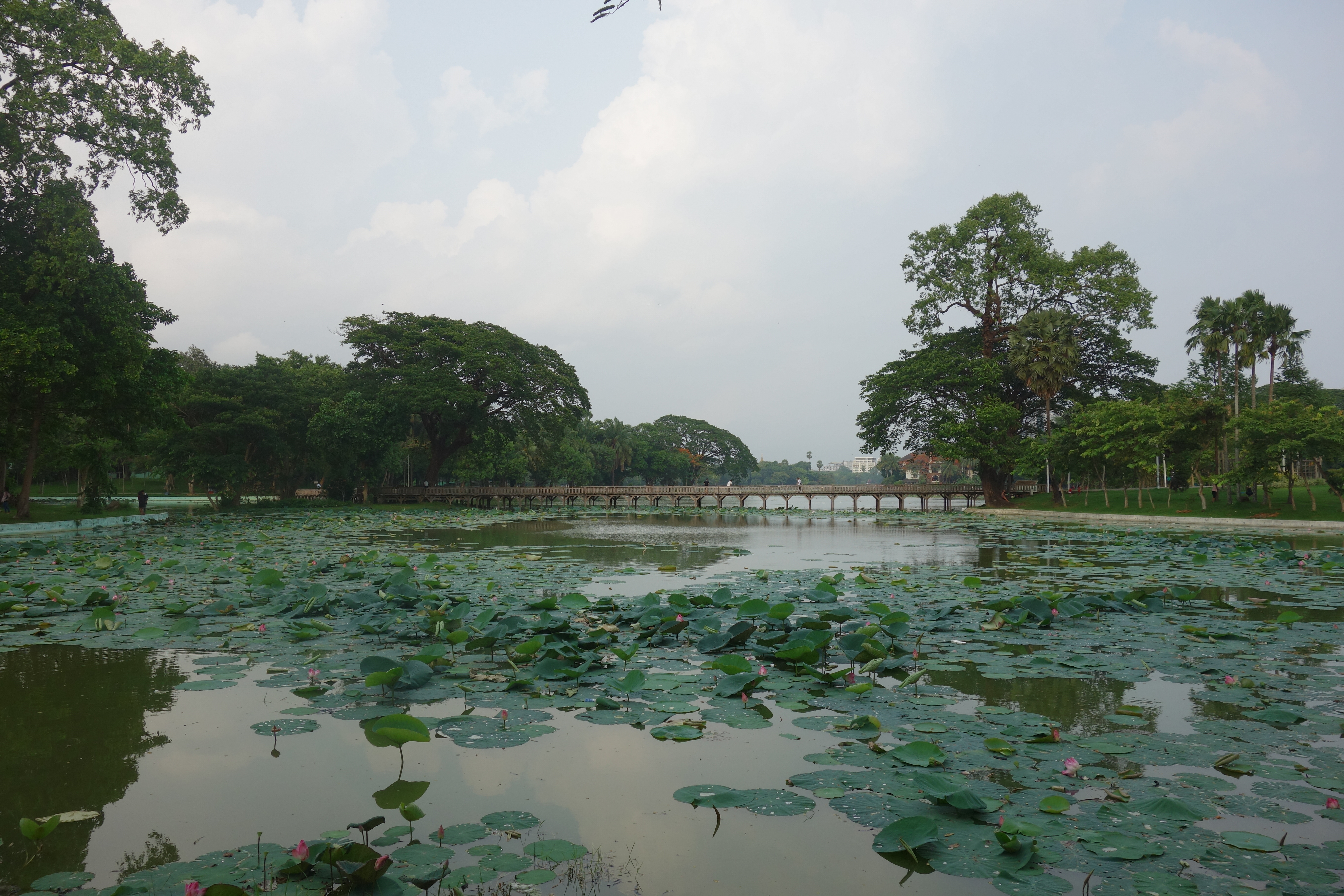 Le lendemain, je me donne comme unique objectif d’aller voir la très fameuse pagode Shwedagon. C’est THE truc à faire à Yangon. La plus belle pagode du pays ! Je rencontre un français, Luc, et on décide d’y aller ensemble pour le coucher du soleil. On y va à pied, tentant de ne pas se faire écraser ! Ici, pas de scooters, que des voitures ! Une première dans mon périple en Asie ! On traverse le parc Kandawgyi. Il y a une grande passerelle en bois qui permet de survoler le lac. C’est très joli mais …. la passerelle est en très mauvais état ! Les planches bougent sous nos pieds, s’enfoncent de plusieurs centimètres, il en manque bien entendu … On n’est pas très rassurés mais on survit !