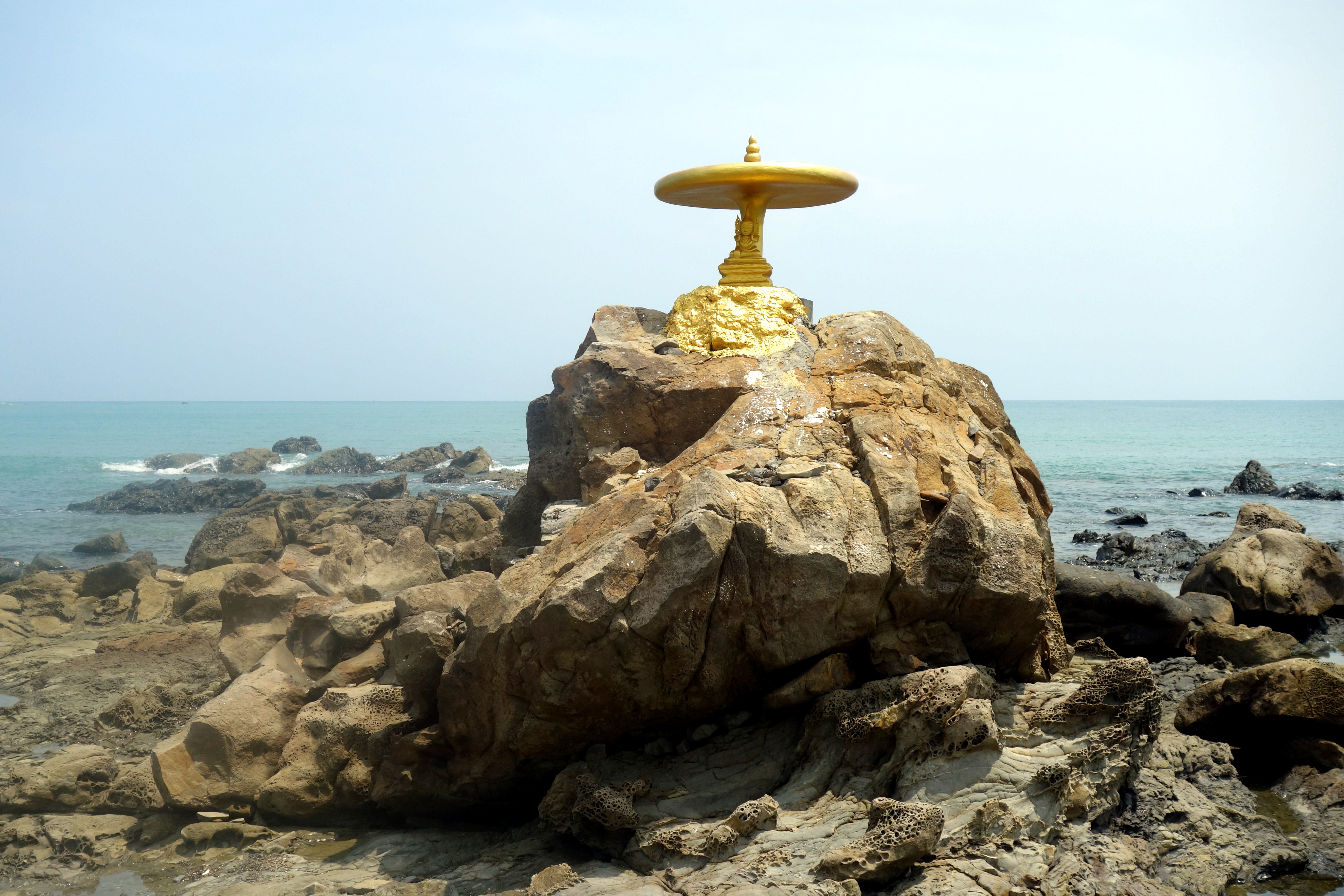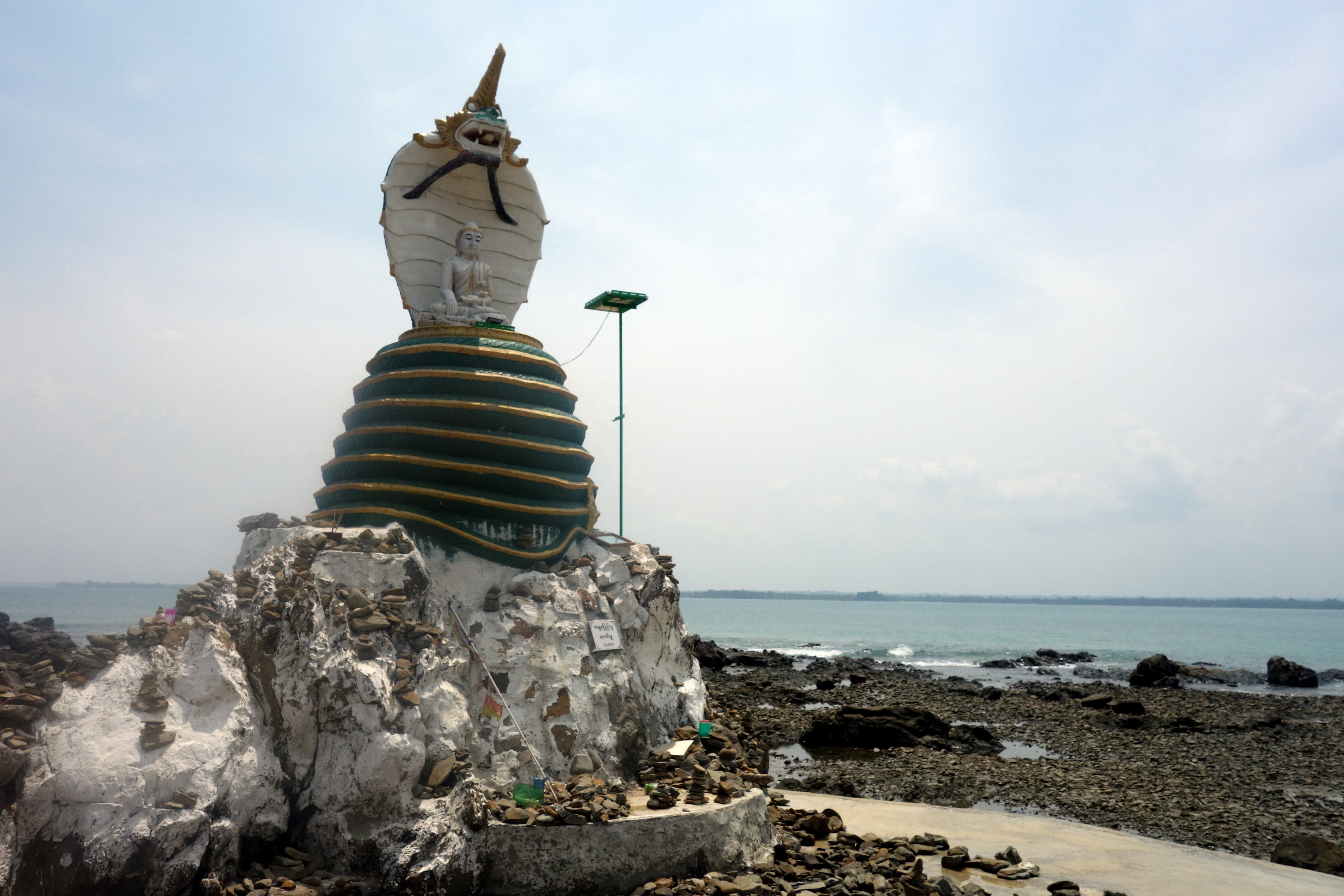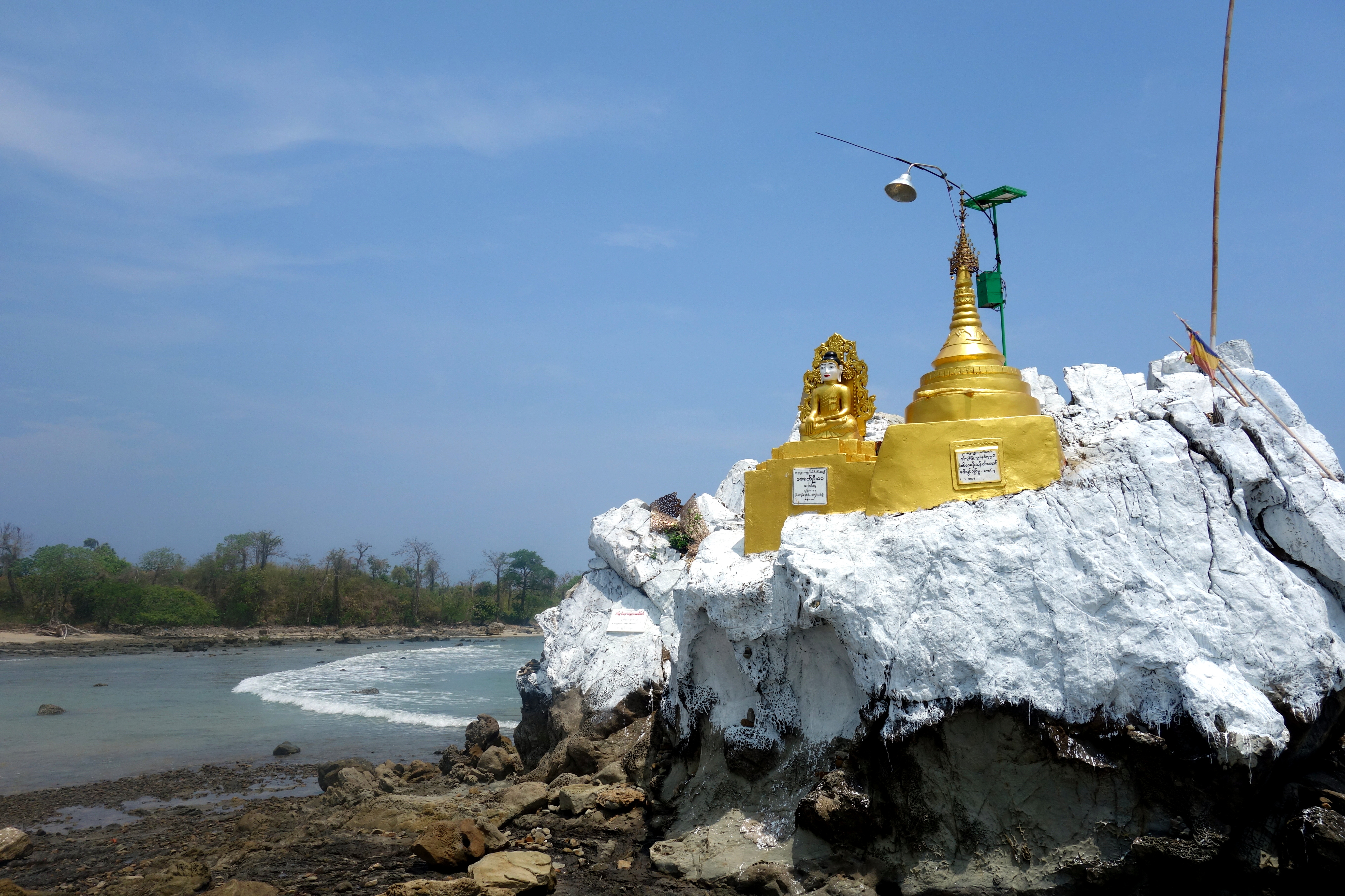 On voit un panneau écrit en birman mais la photo qui l’accompagne à l’air sympa alors on suit le panneau. Il faut savoir que sur Maps.me, tous ces petits chemins n’existent pas, on a donc aucune idée d’où on est ! On roule un bon moment, le chemin est défoncé de chez défoncé ! J’espère juste qu’on aura pas besoin de faire demi-tour ! Après 15 minutes on arrive enfin sur une plage et on reconnait le lieu de la photo ! On a bien fait de faire ce détour, l’eau est parfaitement transparente, il n’y a que nous, et les petites statues religieuses qui dominent le lieu donnent un certain charme à cette crique !