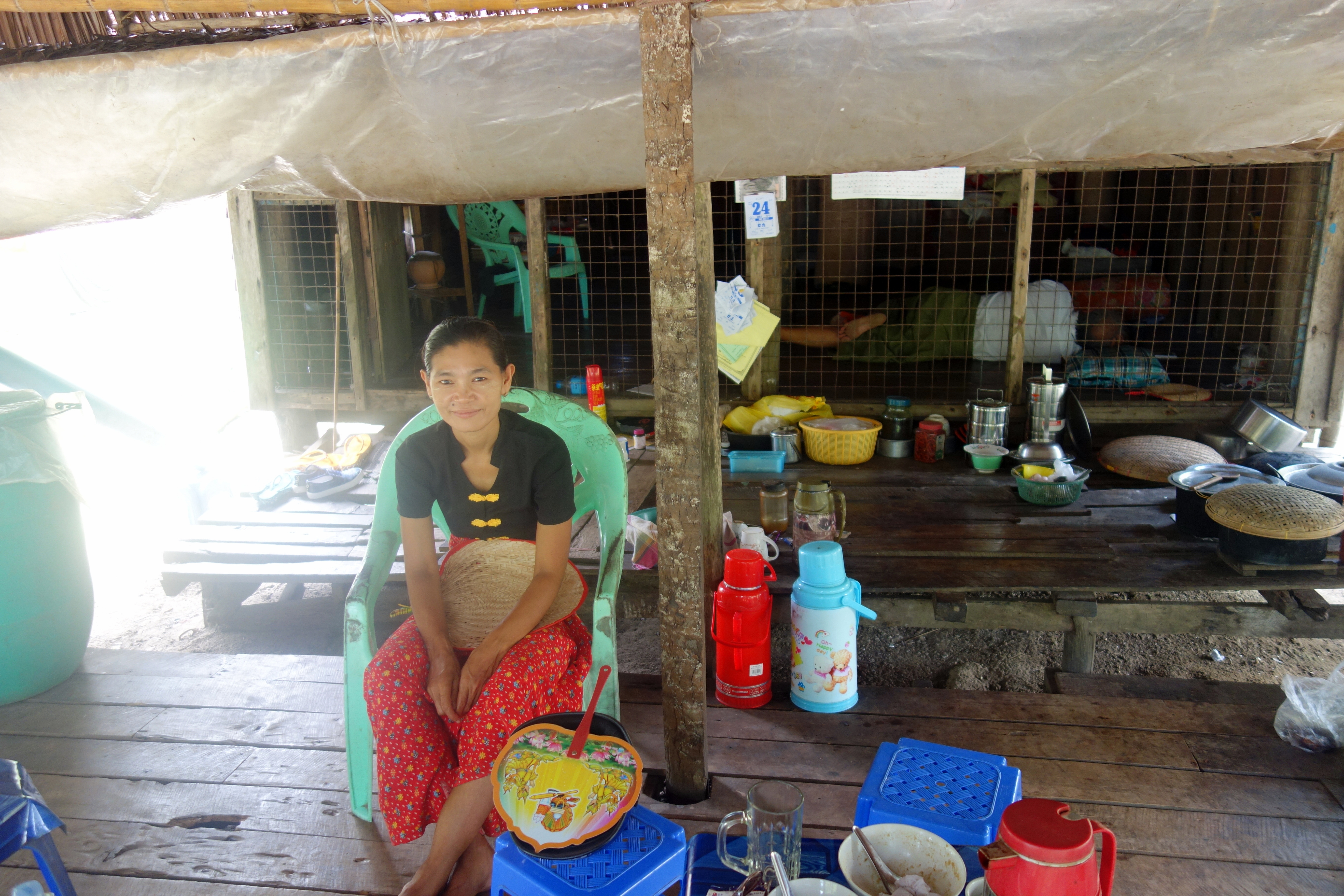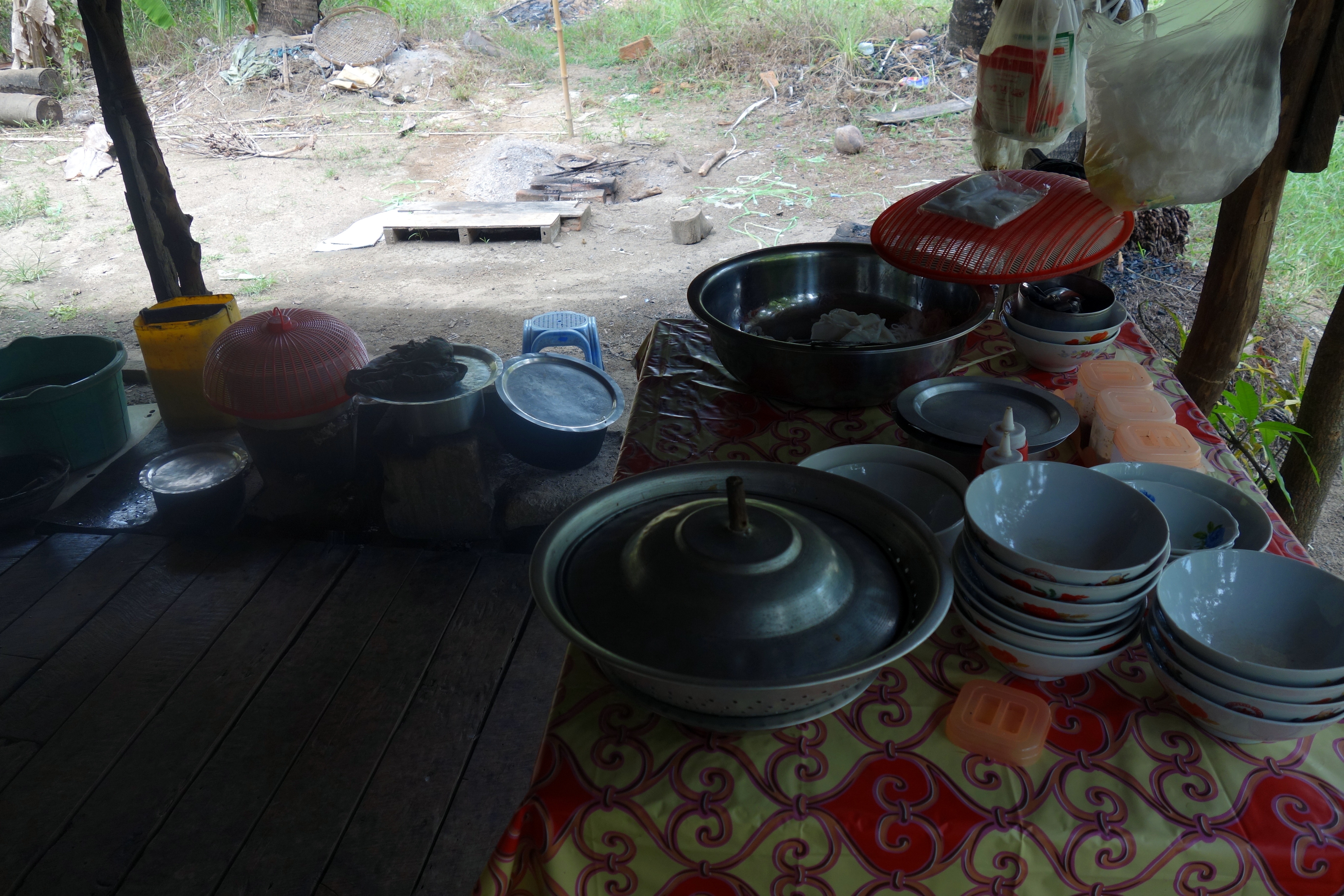 Un peu avant le quai, on voit une petite cabane dans laquelle une femme a l’air de faire à manger. On s’arrête. Elle nous montre le contenu des casseroles, aucune idée de ce que c’est. Vu où on est, on ne va pas faire les difficiles ! C’est délicieux !!! Une soupe de poissons comme chez nous, avec des morceaux de beignets frits (qui remplacent les croûtons de pain) et des nouilles (qui donnent l’impression qu’il y a du gruyère …). On se régale ! Tellement, qu’on redemande un deuxième plat ! Elle nous offre son dernier beignet à la banane en dessert. Au moment de régler, elle nous montre 1000 (0,66€) on a quand même mangé 2 soupes chacune alors on donne 1000 chacune, non non, c’est 1000 pour deux !!!! Incroyable !
