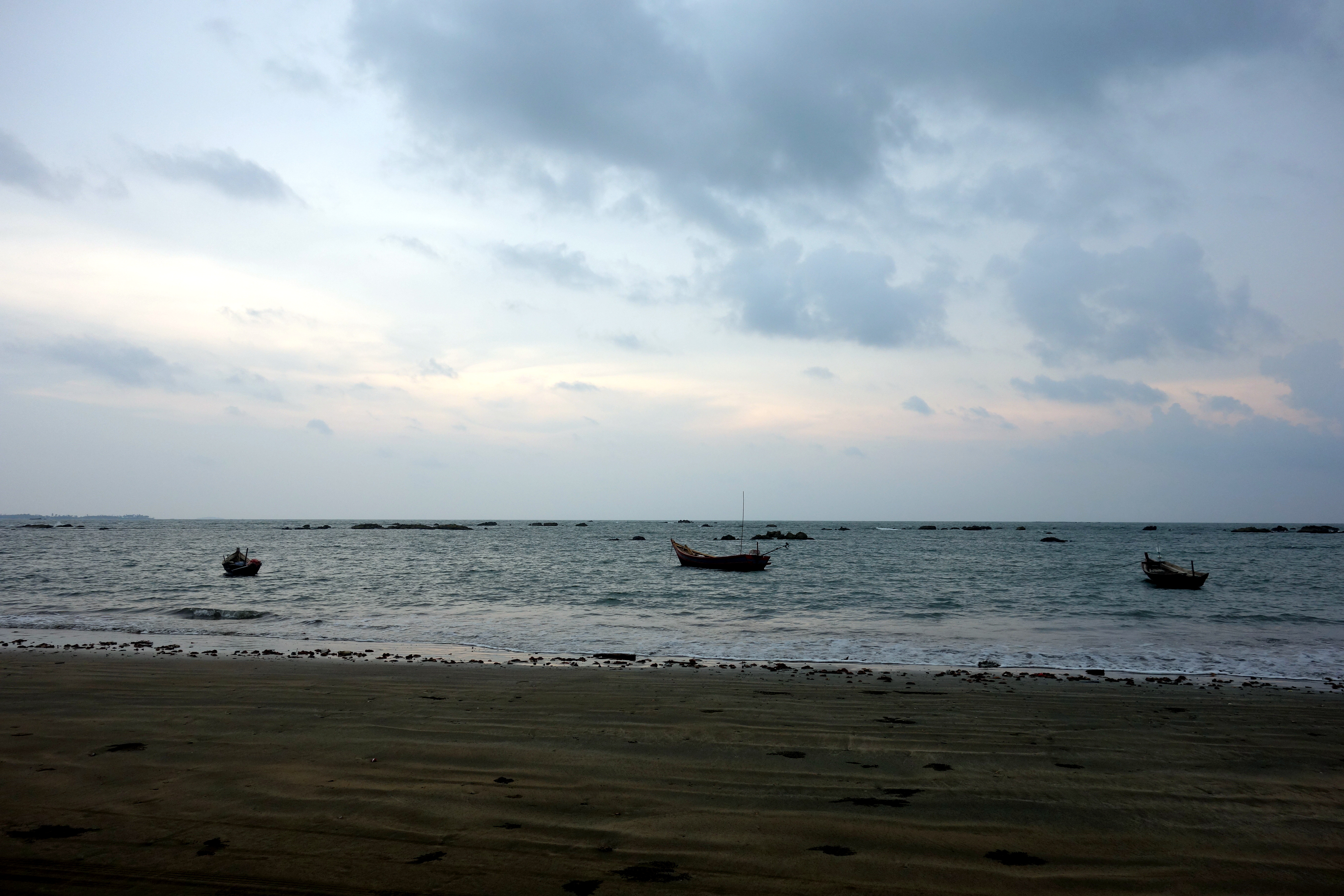 Dernier bateau, on doit attendre… On a eu beaucoup de chance sur les premiers, tout s’est parfaitement enchainé. Là, on attend 30 minutes. Le temps de boire un café, de manger des chips, on traverse le dernier bras de rivière, le plus gros ! On est un peu déçues par Chaungtha beach, on s’attendait à ce que ce soit plus « waou » mais le voyage en valait la peine ! Le ciel s’est couvert, on se baigne rapidement mais les vagues sont grosses et il commence à pleuvoir. On a au moins 1h30 de route si l’on ne se perd pas, on ne peut pas trop trainer.