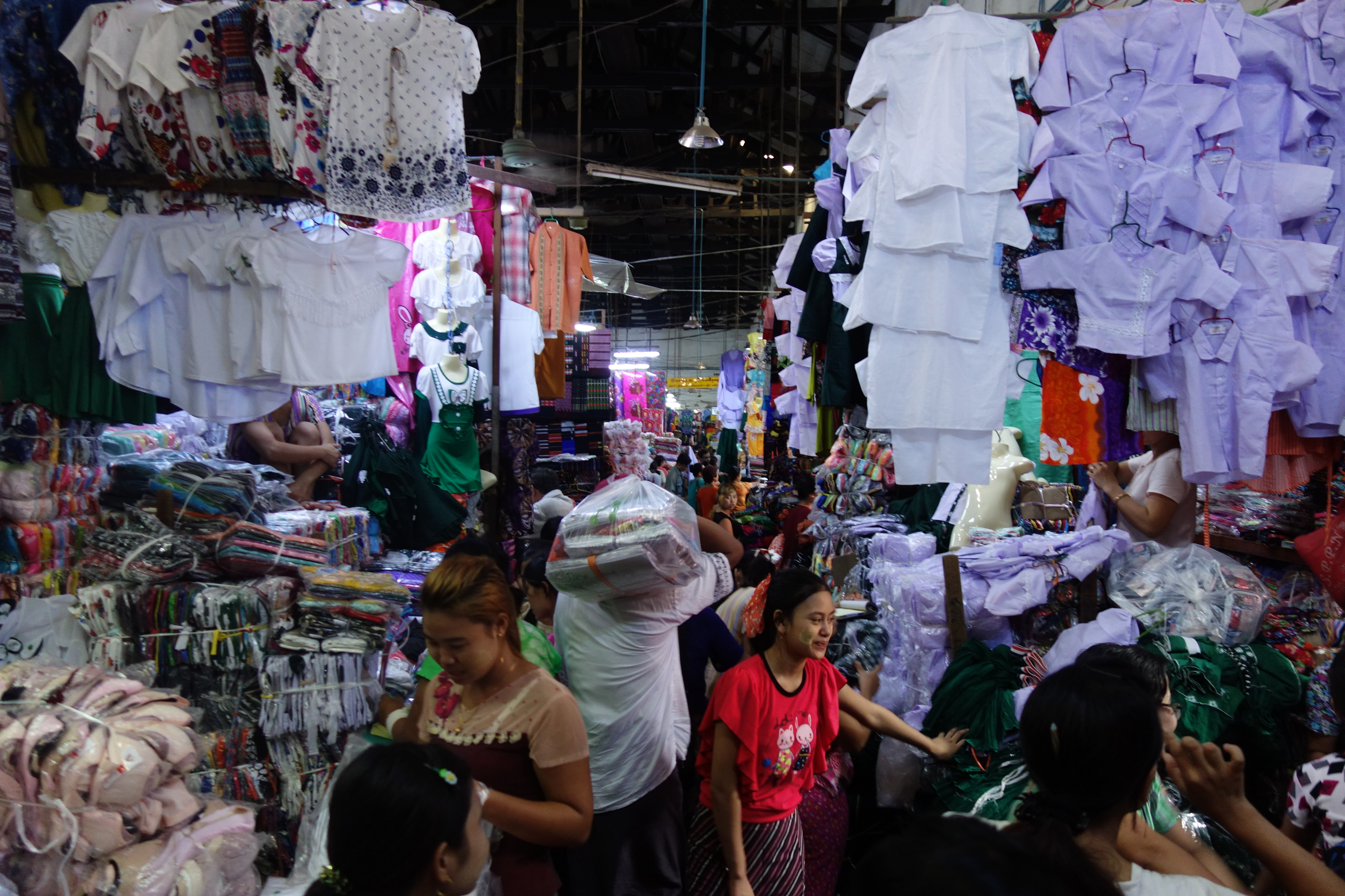 Dernier jour à Yangon, je reste sur ma lancée d’une visite par jour. Pas plus, j’ai toujours un peu la flemme. Je rencontre Camille, une française, elle a un peu la flemme aussi, ça tombe bien. On se motive à aller voir les marchés de la ville. On adore celui de Thein Gyi, c’est un vrai bazar au sens premier. Beaucoup de tissus colorés de tous les côtés, des petites allées chargées dans lesquelles il est difficile de circuler, du monde partout… Camille achète un longyi, moi, j’en ai déjà un mais c’est tentant ! On mange de la street-food, pas cher, pas cher !